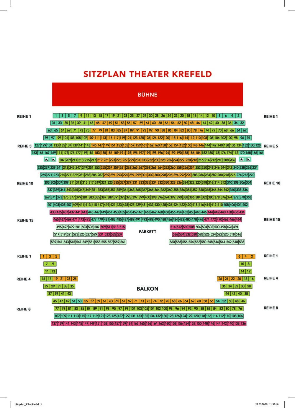 Nehmen Sie Platz! Hier finden Sie die Pläne unserer Sitzaufteilung im Theater Krefeld und Theater Mönchengladbach. Klicken Sie auf den jeweiligen Saalplan bzw. Sitzplan, um das PDF zu öffnen. Bitte beachten Sie, dass es aufgrund von Schutz- und Hygienemaßnahmen zur Eindämmung des Coronavirus weiterhin zu Einschränkungen der Platzkapazität kommen kann.