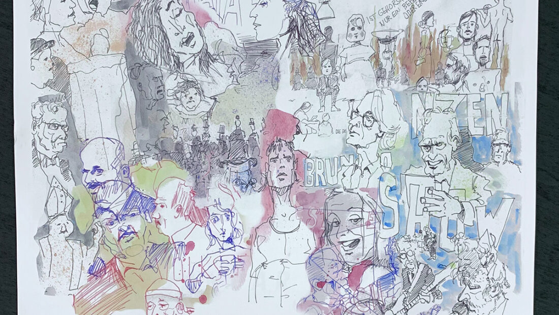 Peter Schmitz, Grafiker im Malsaal des Theaters Krefeld und Mönchengladbach, hat über mehrere Spielzeiten Proben in den Sparten Musiktheater, Schauspiel und Ballett mit seinem Skizzenbuch begleitet. Darunter sind u.a. die Opern „Die Passagierin“ und „La traviata“, das Schauspiel „Merlin oder Das wüste Land“, das Ballett „Mata Hari“ und die „Herr Winzen Show“.