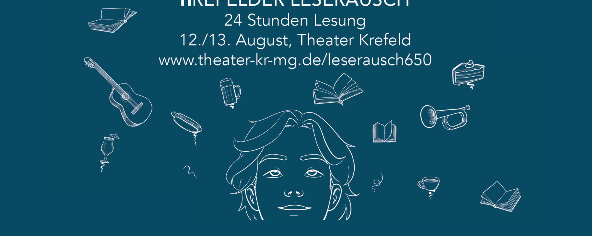 Beim Krefelder Leserausch lesen für Sie rund 50 bekannte und kennenswerte Krefelder, Mitglieder des Schauspielensembles und Autorinnen und Autoren aus Lieblingsbüchern der Krefelder vor. Außerdem gibt‘s einen nächtlichen Poetry Slam-Wettbewerb zwischen toten und lebenden Dichtern, eine Kinderstunde, Livemusik von fünf Bands und DJ-Sets und natürlich Getränke und Snacks. 24 Stunden lang!