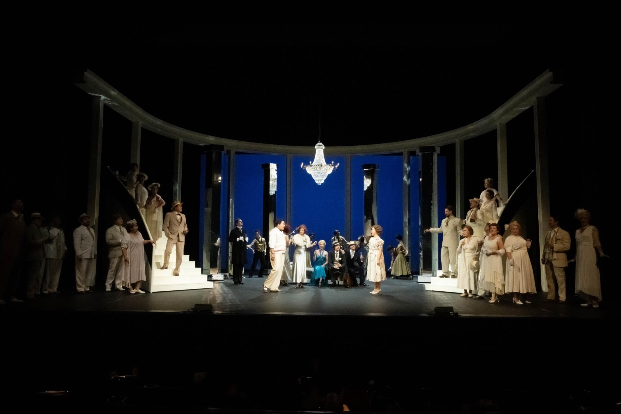 […] Das Regie-Team um Frank Matthus bleibt dem nostalgischen Charme des Stückes treu und versucht nicht, das Werk durch einen neumodischen Anstrich zu verfremden. So werden Madeleine und Aristide während des Vorspiels in zeitgemäßen Kostümen (Heiko Mönnich) in einem riesigen Bett durch den noch größtenteils geschlossenen Vorhang gefahren, um nach der Rückkehr aus ihren Flitterwochen ihre große Liebe zu besingen und sich ewige Treue zu schwören. Das Bühnenbild, für das ebenfalls Mönnich verantwortlich zeichnet, ist recht flexibel gehalten und ermöglicht eine schnelle Verwandlung von Aristides Villa in Nizza in einen mondänen Saal im Savoy. Zwei Treppen auf der rechten und linken Seite führen im ersten Akt in eine obere Etage des Hauses, während sie im Savoy zu einer großen Showtreppe zusammengeführt werden. Riesige silberne Säulen lassen sich flexibel im Raum verschieben, um den Raum zu variieren. Ein halbrunder Bogen im Hintergrund deutet die Weite von Aristides Villa an. Für den Ball trennt ein weiterer Vorhang den vorderen Teil ab, während die Buchstaben “SAVOY” in geschwungener Form aus dem Schnürboden herabhängen.