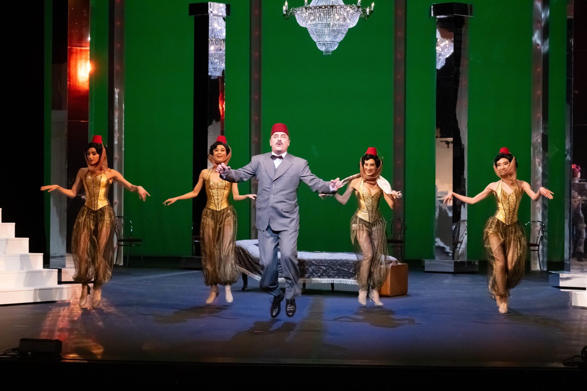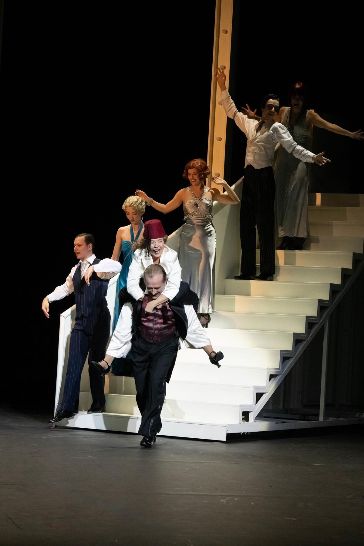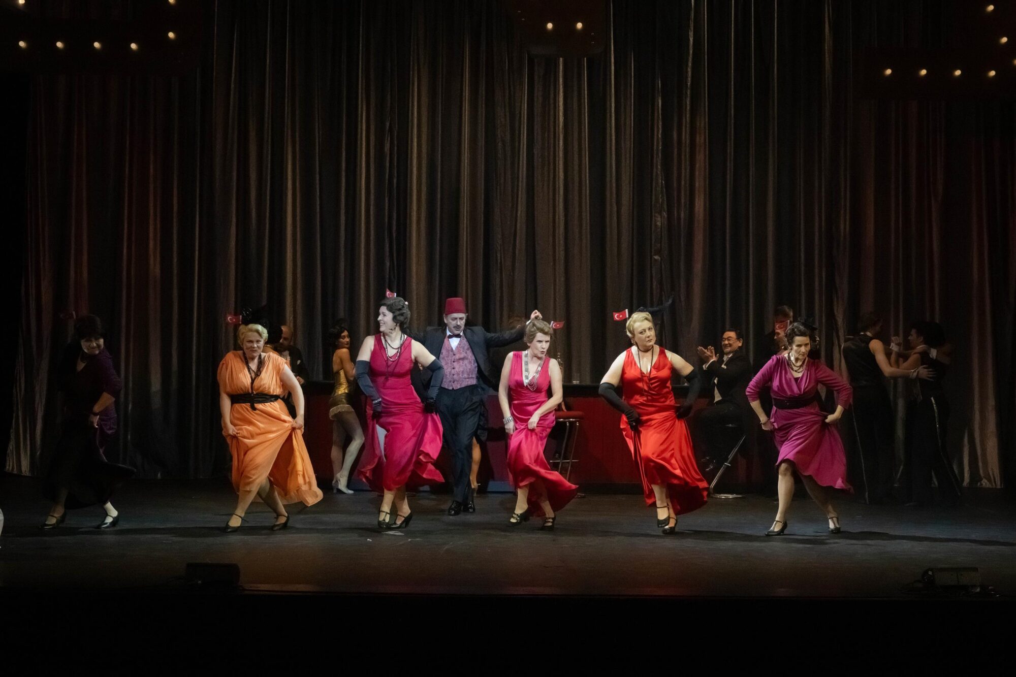 Musikalisch begeistert das Stück durch zahlreiche eingängige Melodien, die die Vielfalt von Abrahams Kompositionsstil deutlich machen. Da ist zum einen die großartige Tanznummer “Känguruh” zu nennen, mit der Daisy einen neuen Tanzstil aus den USA vorstellt. Ralph Frey hat hierfür eine spritzige Choreographie erarbeitet, die vom Ballettensemble gemeinsam mit Susanne Seefing als Daisy wunderbar umgesetzt wird. Da lässt sich gut nachvollziehen, dass diese freche, selbstbewusste Amerikanerin das Herz des Mustapha Bei höher schlagen lässt. Markus Heinrich legt den türkischen Attaché mit großartiger Komik an und begeistert mit Seefing bei dem großartigen Duett zwischen Daisy und Mustapha “Oh, Mister Brown!”, bei dem die beiden sich erstmals näher kommen. Eingängig ist auch der Foxtrott “Es ist so schön, am Abend bummeln zu gehen”, bei dem das Publikum auf den Sitzen regelrecht mitschwingt. Eine weitere komische Nummer ist der Foxtrott im dritten Akt “Kommen Sie mit mir nach Belutschistan”, in dem Mustapha Madeleine zu überreden versucht, mit ihm nach Afghanistan zu gehen, wenn sie ihren Mann verlassen wolle. Ein weiterer Höhepunkt ist sein Lied “Wenn wir Türken küssen…”, das er mit seinen sechs Ex-Frauen singt. Auch hier achtet die Inszenierung auf eine Vielfalt der Kulturen und gibt den sechs Ex-Frauen mit unterschiedlichen Nationalitäten und Dialekten jeweils einen kurzen Moment zu glänzen.