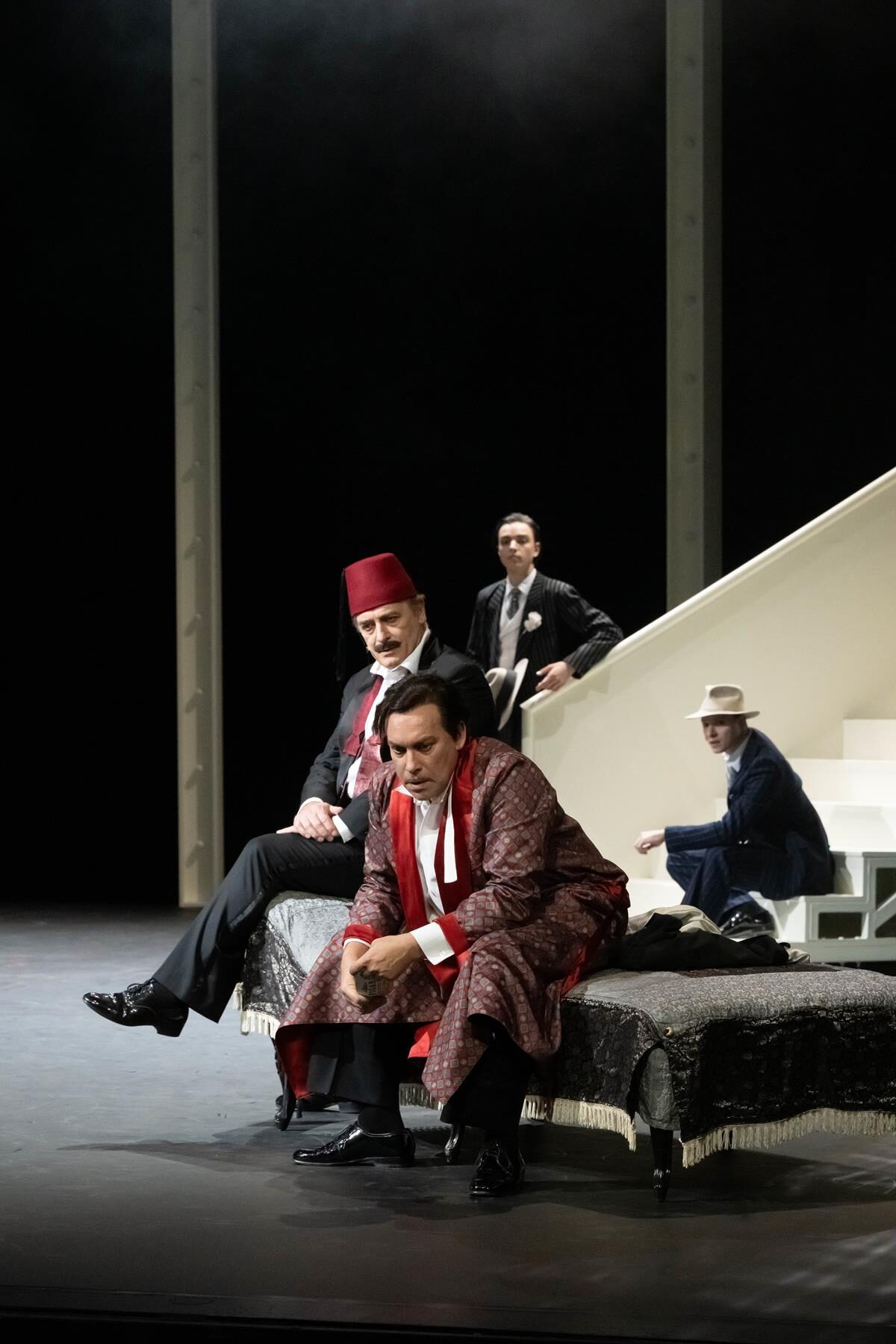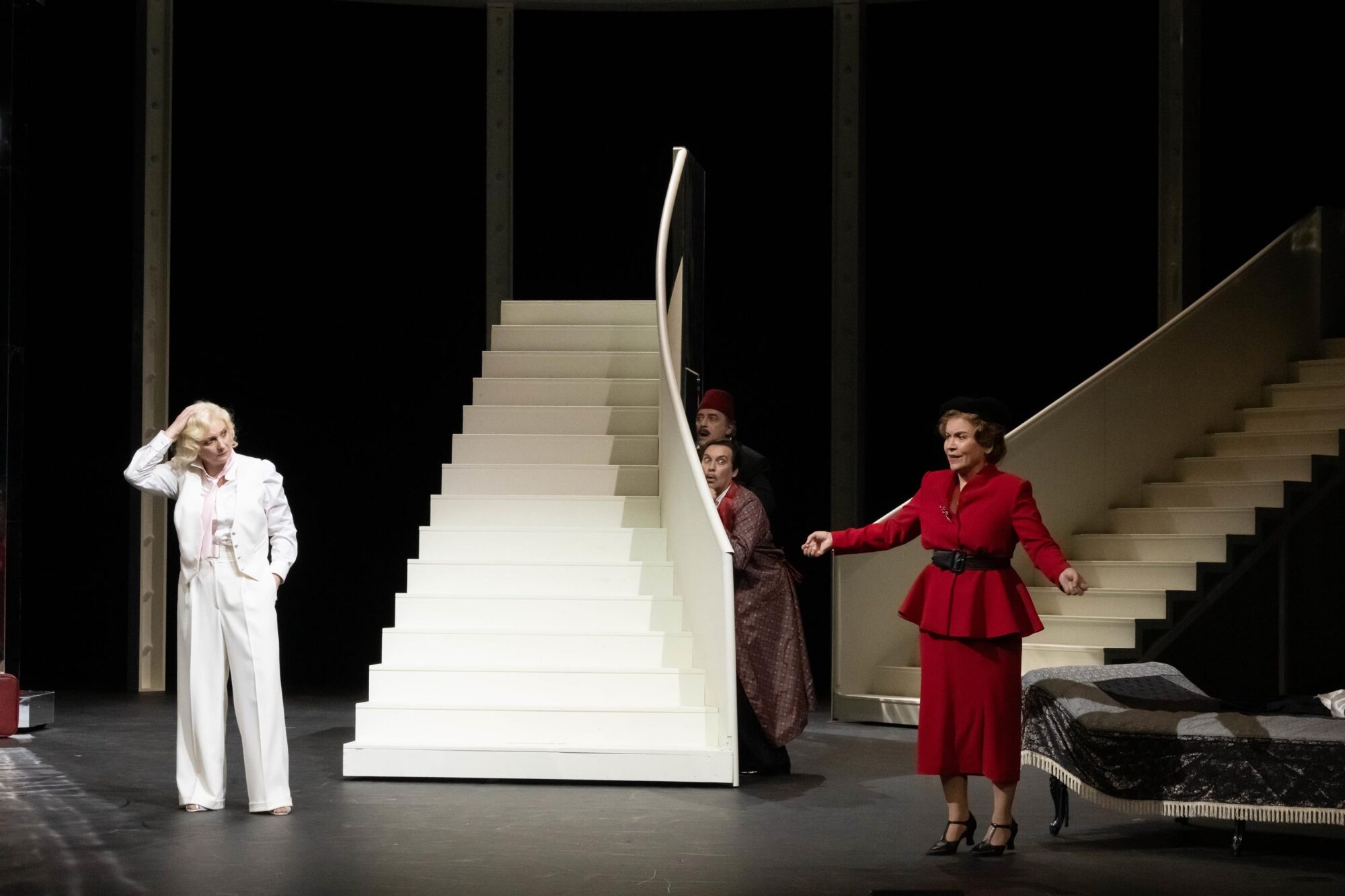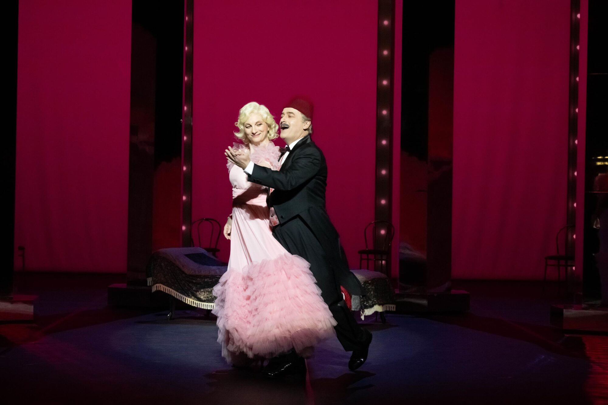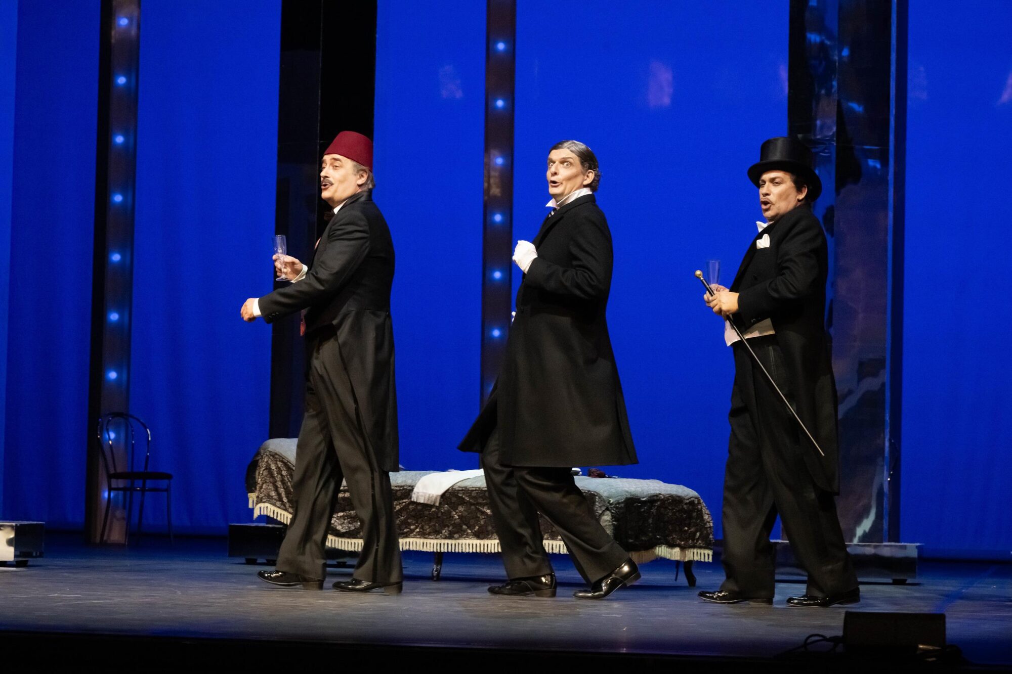 Musikalisch begeistert das Stück durch zahlreiche eingängige Melodien, die die Vielfalt von Abrahams Kompositionsstil deutlich machen. Da ist zum einen die großartige Tanznummer “Känguruh” zu nennen, mit der Daisy einen neuen Tanzstil aus den USA vorstellt. Ralph Frey hat hierfür eine spritzige Choreographie erarbeitet, die vom Ballettensemble gemeinsam mit Susanne Seefing als Daisy wunderbar umgesetzt wird. Da lässt sich gut nachvollziehen, dass diese freche, selbstbewusste Amerikanerin das Herz des Mustapha Bei höher schlagen lässt. Markus Heinrich legt den türkischen Attaché mit großartiger Komik an und begeistert mit Seefing bei dem großartigen Duett zwischen Daisy und Mustapha “Oh, Mister Brown!”, bei dem die beiden sich erstmals näher kommen. Eingängig ist auch der Foxtrott “Es ist so schön, am Abend bummeln zu gehen”, bei dem das Publikum auf den Sitzen regelrecht mitschwingt. Eine weitere komische Nummer ist der Foxtrott im dritten Akt “Kommen Sie mit mir nach Belutschistan”, in dem Mustapha Madeleine zu überreden versucht, mit ihm nach Afghanistan zu gehen, wenn sie ihren Mann verlassen wolle. Ein weiterer Höhepunkt ist sein Lied “Wenn wir Türken küssen…”, das er mit seinen sechs Ex-Frauen singt. Auch hier achtet die Inszenierung auf eine Vielfalt der Kulturen und gibt den sechs Ex-Frauen mit unterschiedlichen Nationalitäten und Dialekten jeweils einen kurzen Moment zu glänzen.