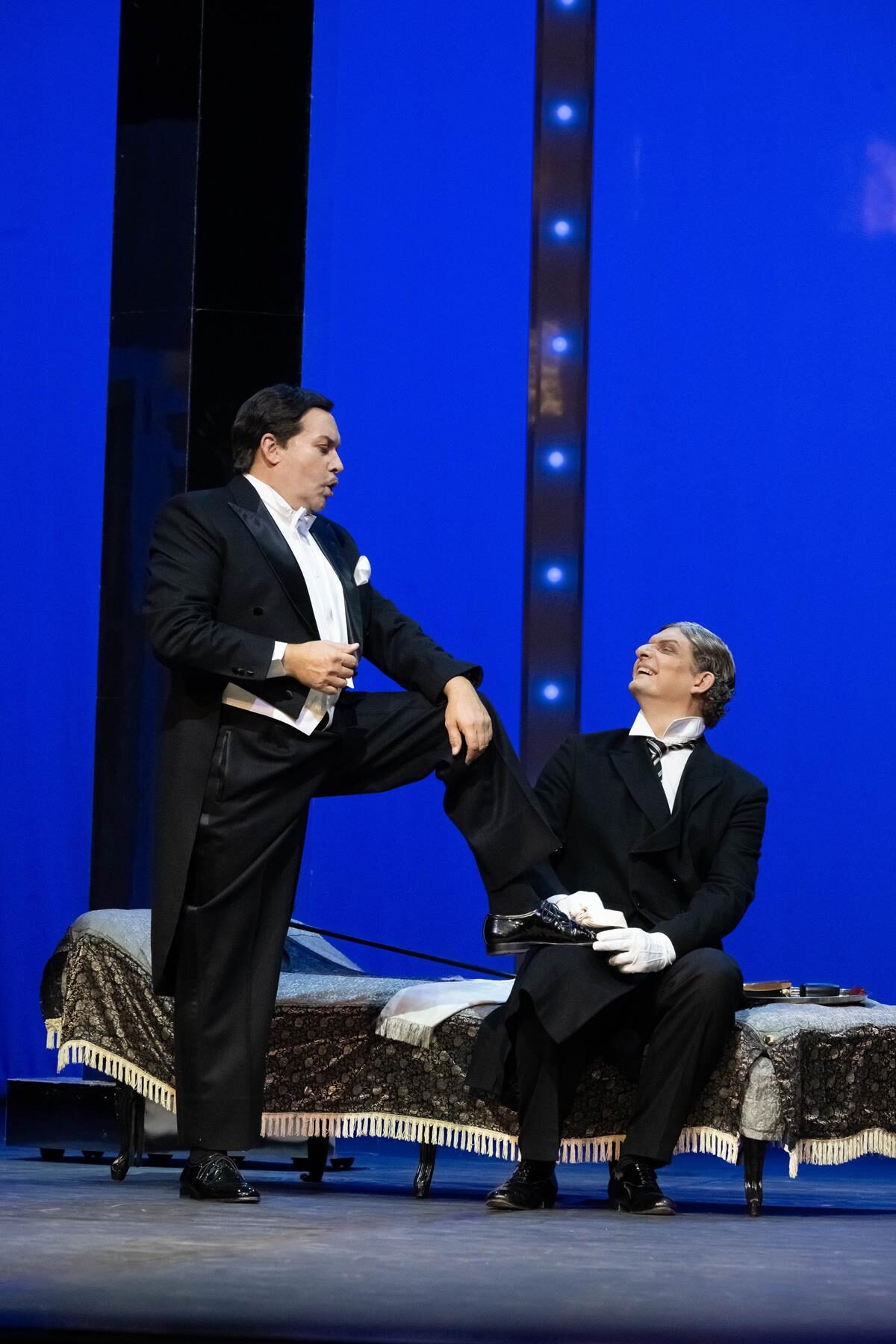 Kejti Karaj glänzt als Tangolita mit laszivem Mezzosopran und macht deutlich, wieso sich Aristide das Rendezvous mit dieser Dame eigentlich nicht entgehen lassen will. Bei der großen Tangonummer “Man nennt mich nur La bella Tangolita” macht sie auch tänzerisch mit dem Ballett eine sehr gute Figur. Andrea Matthias Pagani will sich zwar als Aristide immer irgendwelche Freiheiten nehmen, bleibt musikalisch in den komponierten Nummern aber im Vergleich zu den anderen Partien eher ein wenig langweilig. So sind die klassischen Nummern “Toujours l’amour” und “Bist du mir treu?” zwar mit weichem Tenor von ihm klangschön umgesetzt, geben der Figur aber weit weniger Spielraum als den anderen Charakteren. Gabriela Kuhn hat als Madeleine da wesentlich mehr szenisches Entwicklungspotenzial. Sie darf in anderen musikalischen Nummern aus der Rolle der braven, treuen Ehefrau durchaus ausbrechen und zeigt in den beiden Chansons auch eine gewisse Verbitterung, die von Kuhn bewegend umgesetzt wird. Herrliche Komik entfacht auch Frank Valentin als leicht tölpelhafter Diener Archibald. Als gute Entscheidung erweist es sich, die Solistinnen und Solisten beim Gesang durch Mikroports zu verstärken, auch wenn die Tonabmischung stellenweise noch verbesserungswürdig ist. So kann auf eine Übertitelung während der Songs verzichtet werden. Sebastian Engel führt die Niederrheinischen Sinfoniker schwungvoll und mit der erforderlichen Leichtigkeit durch die von Henning Hagedorn und Matthias Grimminger rekonstruierte Partitur, so dass man beschwingt den Saal verlässt.