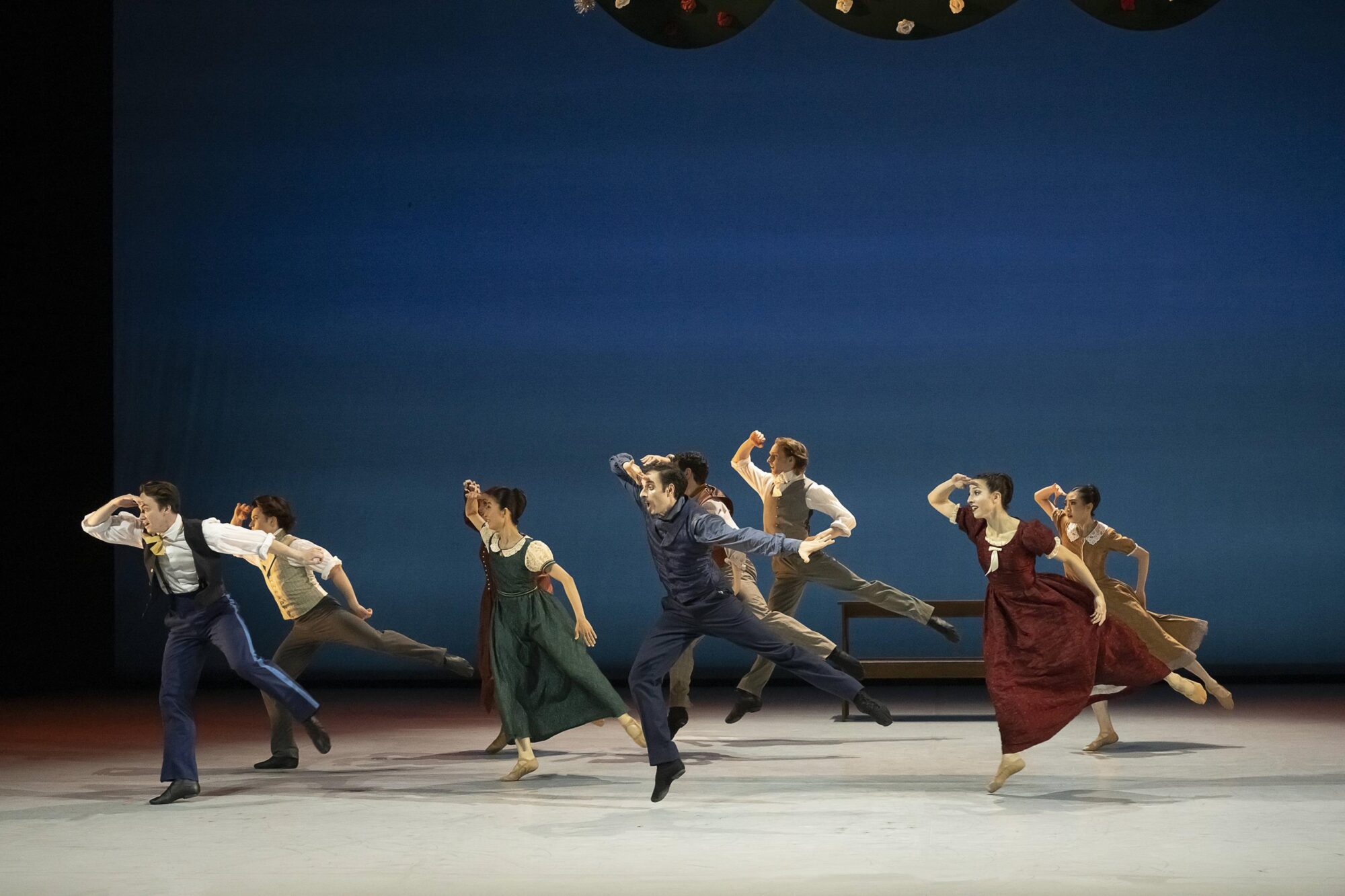 Bühnenbildner Udo Hesse hat die Tanzenden in historische Kostüme gekleidet. (…) Die Damen kommen in weiten Kleidern. Und in einer besonders schönen Szene, die der Seide gewidmet ist, erscheinen sie in farbigen Phantasiegewändern, luftig leicht schwebend, fast wie Elfen. (…)