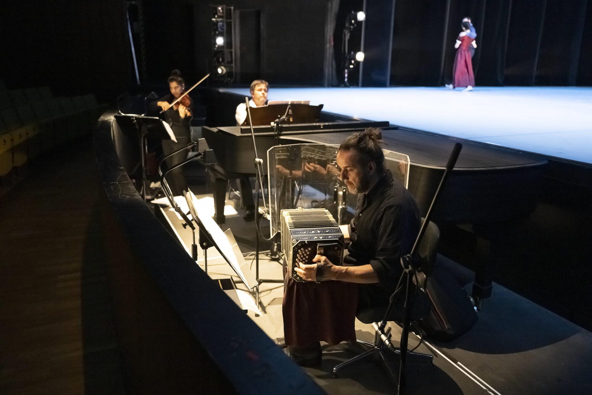 Dass die Uraufführung von „Seide – Band – Bandoneon“ auch musikalisch ein Genuss ist, ist vor allem André Parfenov zu verdanken, der für diesen Abend eine eigene Komposition schuf, die sehr abwechslungsreich daherkommt. Am Flügel überzeugt Parfenov mit kraftvollen Klaviereinlagen, im Duett mit Iuliana Münch an der Violine erklingt das Piano dagegen stellenweise recht liebevoll. Mit Stephan Langenberg konnte zudem einer der wenigen professionellen Bandoneonisten für diese Produktion gewonnen werden, der zudem als „Fachmann der Ziehharmonika-Töne“ gilt. Auch hier ist es ganz erstaunlich, was Parfenov für dieses selten derart in den Mittelpunkt gestellte Instrument für wunderbare Musik schuf. Schon die Komposition ist einen Besuch des Abends wert.