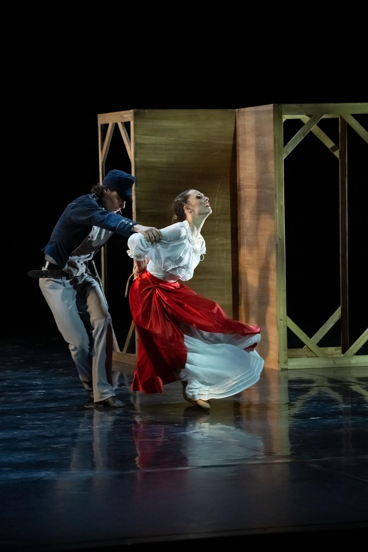All dies untermalt Robert North mit nahezu selbsterklärenden Choreografien in einem rund 90-minütigen Handlungsballett zuzüglich einer Pause nach rund 45 Minuten. Dabei wechseln sich große Gruppentänze mit intimen Momenten zwischen Carmen und Don José ab. Die beiden Hauptpersonen werden von Irene van Dijk und Alessandro Borghesani wunderbar verkörpert. Darüber hinaus stehen zwanzig weitere Tänzerinnen und Tänzer aus dem Ballettensemble auf der Bühne und legen einmal mehr eindrucksvoll dar, welche exzellente Arbeit in den vergangenen Jahren in der Ballettsparte geleistet wurde. Auch das Bühnenbild wurde von Robert North entworfen. Er setzt hierbei sechs große Holztische immer wieder anders ein. (…) Der große Vorteil hierbei sind die fließenden Übergänge. Die Tische werden von den Tänzerinnen und Tänzern ganz nebenbei in die richtige Position geschoben. Die Kostüme von Luisa Spinatelli sind selbsterklärend (…) Besonders Carmen sticht mit ihrem Kleid in Rot, Schwarz und Weiß hervor. Beim Entwurf des Kostümbildes ließ sich Spinatelli von Bildern der beiden Maler Gustave Doré und Francisco de Goya inspirieren.