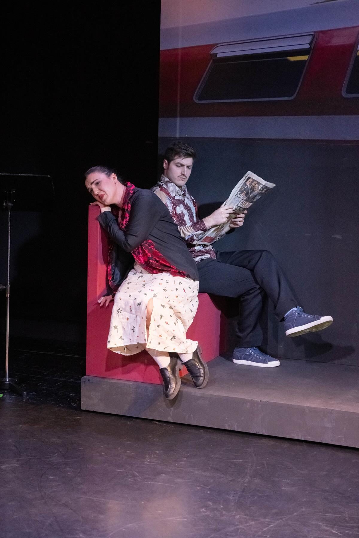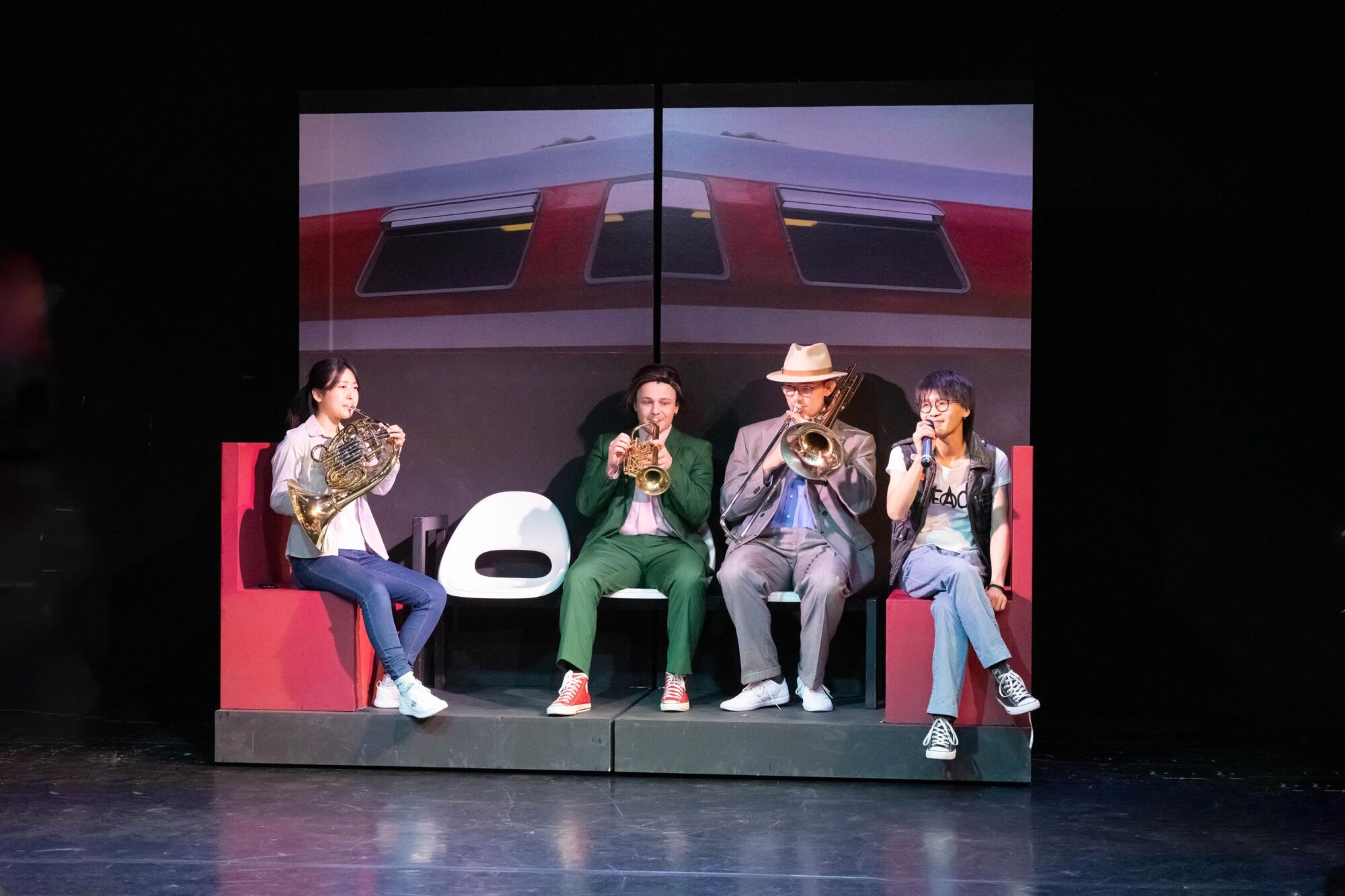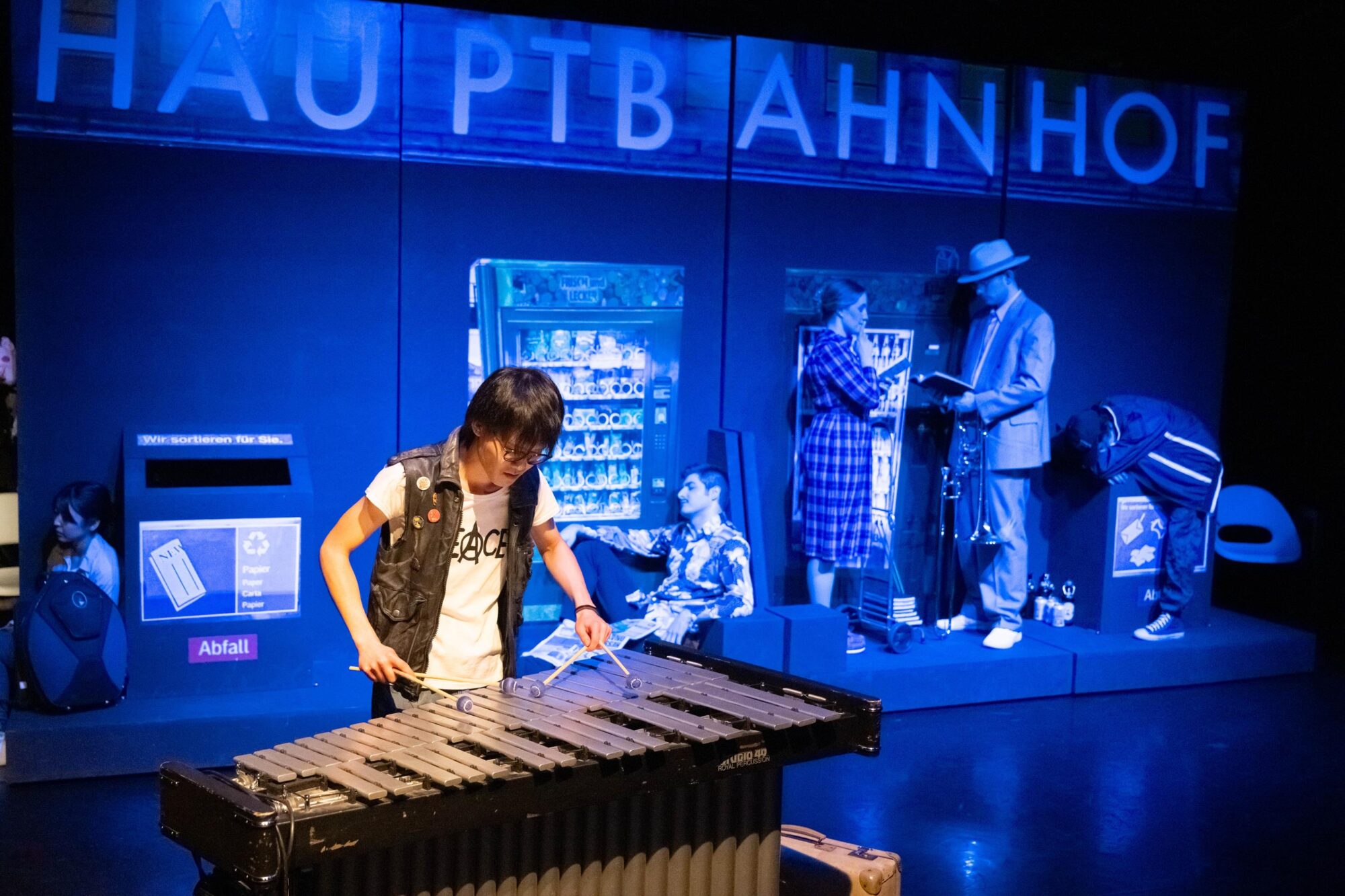Haru Ueda beginnt den Abend mit Blues for Gilbert von Marc Glentworth am Vibrafon und legt damit schon mal das ganz hohe Niveau der Aufführung fest. Im Zugabteil nutzt Mezzosopran Kejti Karaj die Fahrkartenkontrolle, um den Aufenthalt aus Franz Schuberts Schwanengesang vorzutragen. Die Musik haben Bening und die Teilnehmer des Jungen Theaters gemeinsam zusammengestellt, nachdem die Regisseurin eine Vorauswahl getroffen hat, für Vorschläge dabei aber offenblieb. Und so entstand eine wilde Mischung aus Titeln, deren Entstehungszeit sowohl in der Auswahl als auch später in der Reihenfolge vollkommen offenblieb. Also darf Antonia Busse den ersten Satz Pater noster aus den Paroles für Sopran und Posaune des 1972 geborenen François Cattin mit lateinischem Text singen, unterstützt von Friedrich Falkenhagen. Nach Mozarts Auf den Tod einer Nachtigall wird deutlich, dass Bening auch Spaß haben will. Da kommt die Tokyo Subway Polka von Klaus Wallendorf gerade recht. Falkenhagen, der gemeinsam mit dem Pianisten Anton Brezinka die Arrangements, so weit nötig, erarbeitet hat, darf anschließend mit Kislev für Posaune solo von Daniel Schnyder glänzen. Auch wenn Bening das Kunstlied als ideales Grundgerüst für einen solchen Abend ansieht, fällt Robert Schumanns Wenn ich ein Vöglein wär doch gegen das Volkslied Turtullesbe – Turteltäubchen auf Deutsch – aus Karajs Heimat Albanien in der Wirkung ab.