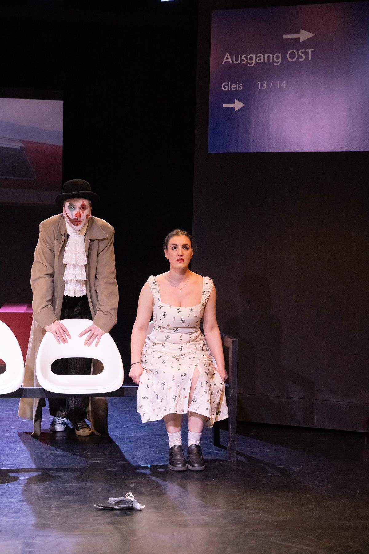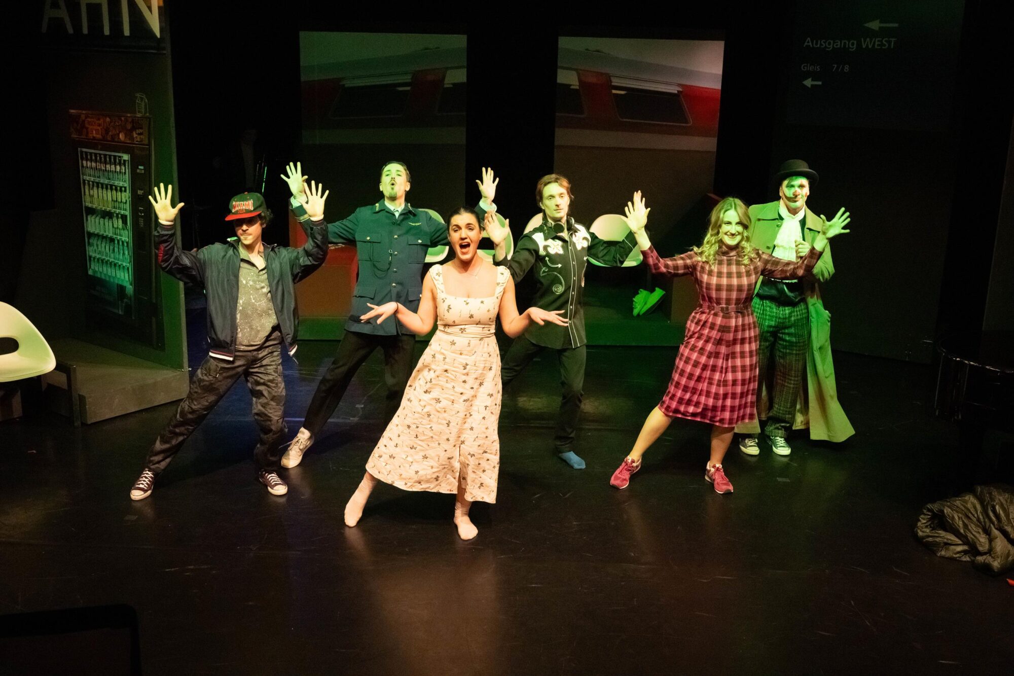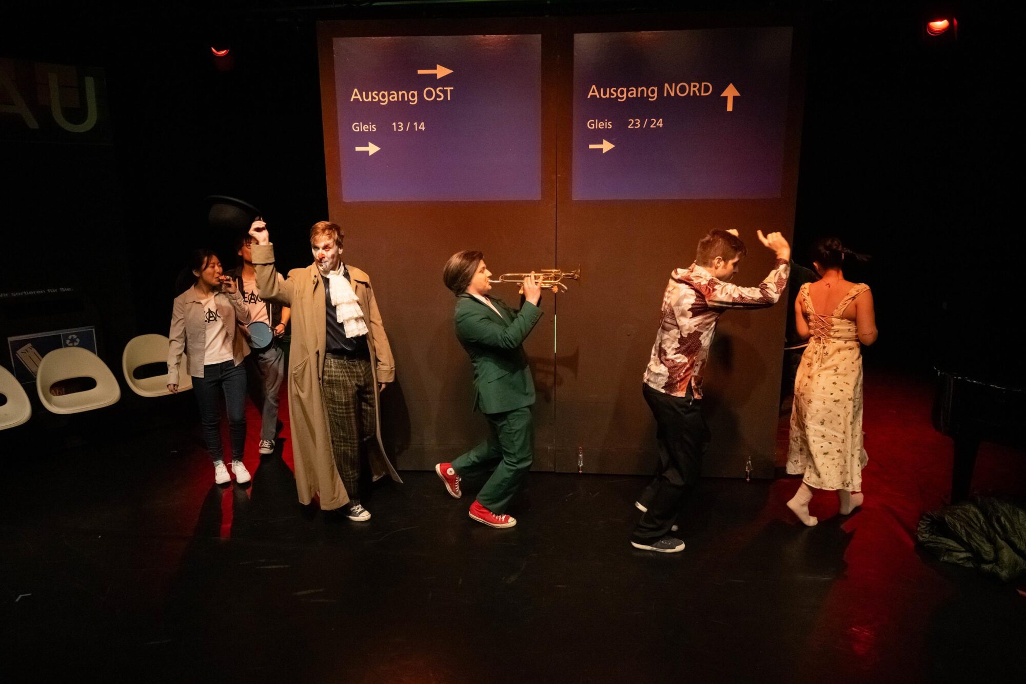 Die Tänzer Jacob Cuddon und Alberto Lo Conte runden die verschiedenen Darstellungsformen ab. Udo Hesses Bühnenbild aus verschiebbaren Teilen schafft Bahnhofsambiente, auch für den verspäteten Zug ins Nirgendwo. Die Instrumentalisten, wie etwa der wandlungsfähige Pianist Anton Brezinka, verantwortlich für die musikalische Einstudierung, sind sichtbar ins Spiel einbezogen. In der Rolle des geheimnisvollen Clowns erweckt Miha Brkinjac die zu Beginn noch erstarrten Darsteller zum Leben. Der Bariton überzeugt auch stimmlich mit ausdrucksstarken Einsätzen. Wie er meistern ebenso Sopranistin Antonia Busse, Mezzosopranistin Kejti Karaj, Tenor Arthur Meunier und Musicalsänger Bjron Geudens solistisch sowie in sich neu findenden Formationen einen Parforceritt durch musikalische Stile. Begeisterter Beifall für das Stück am Gleis 23/24.