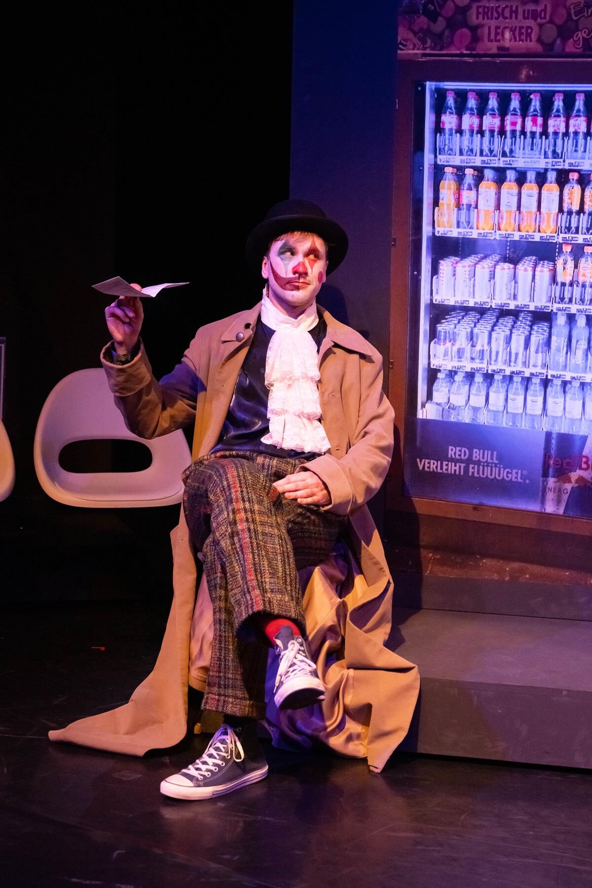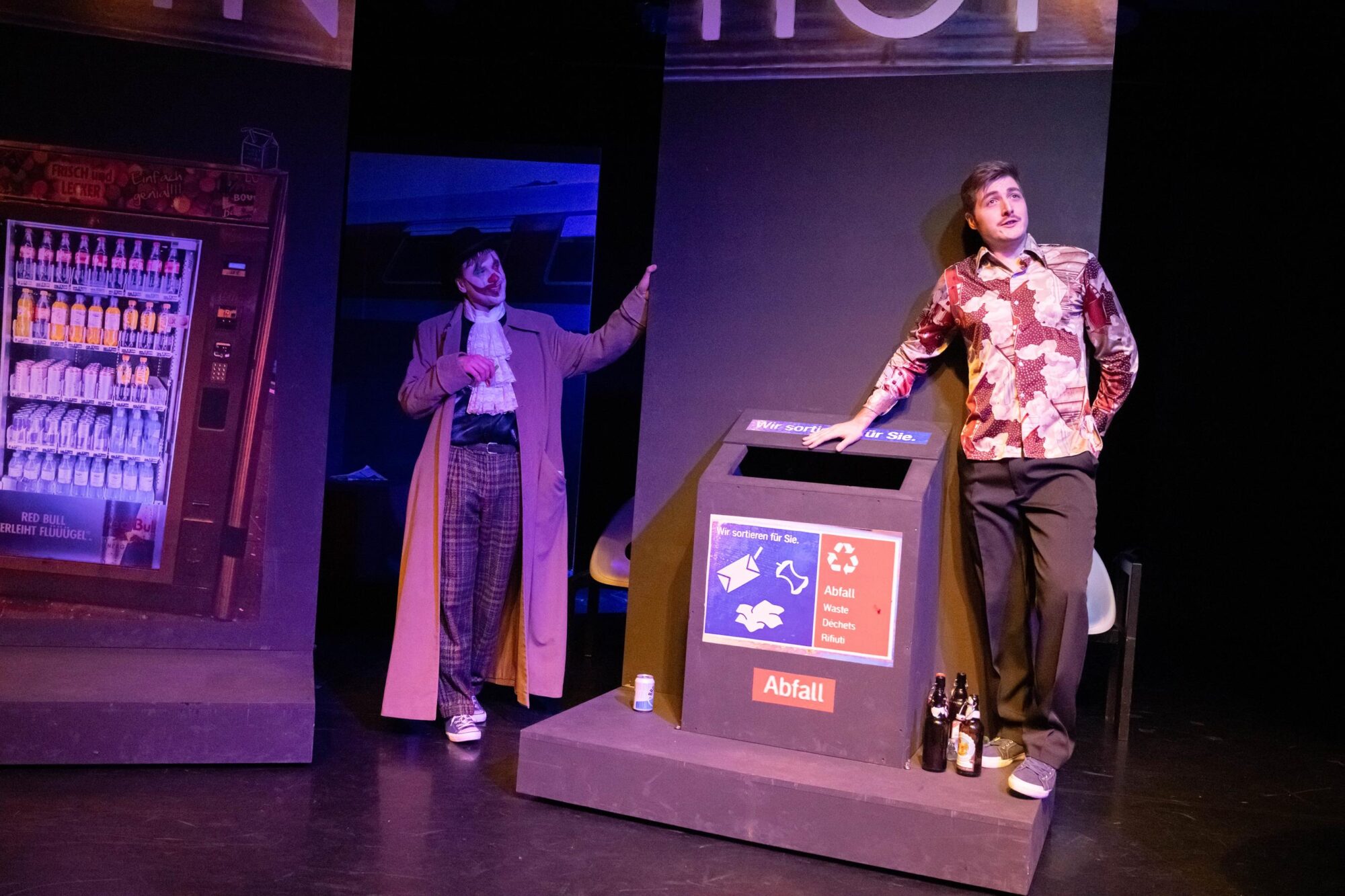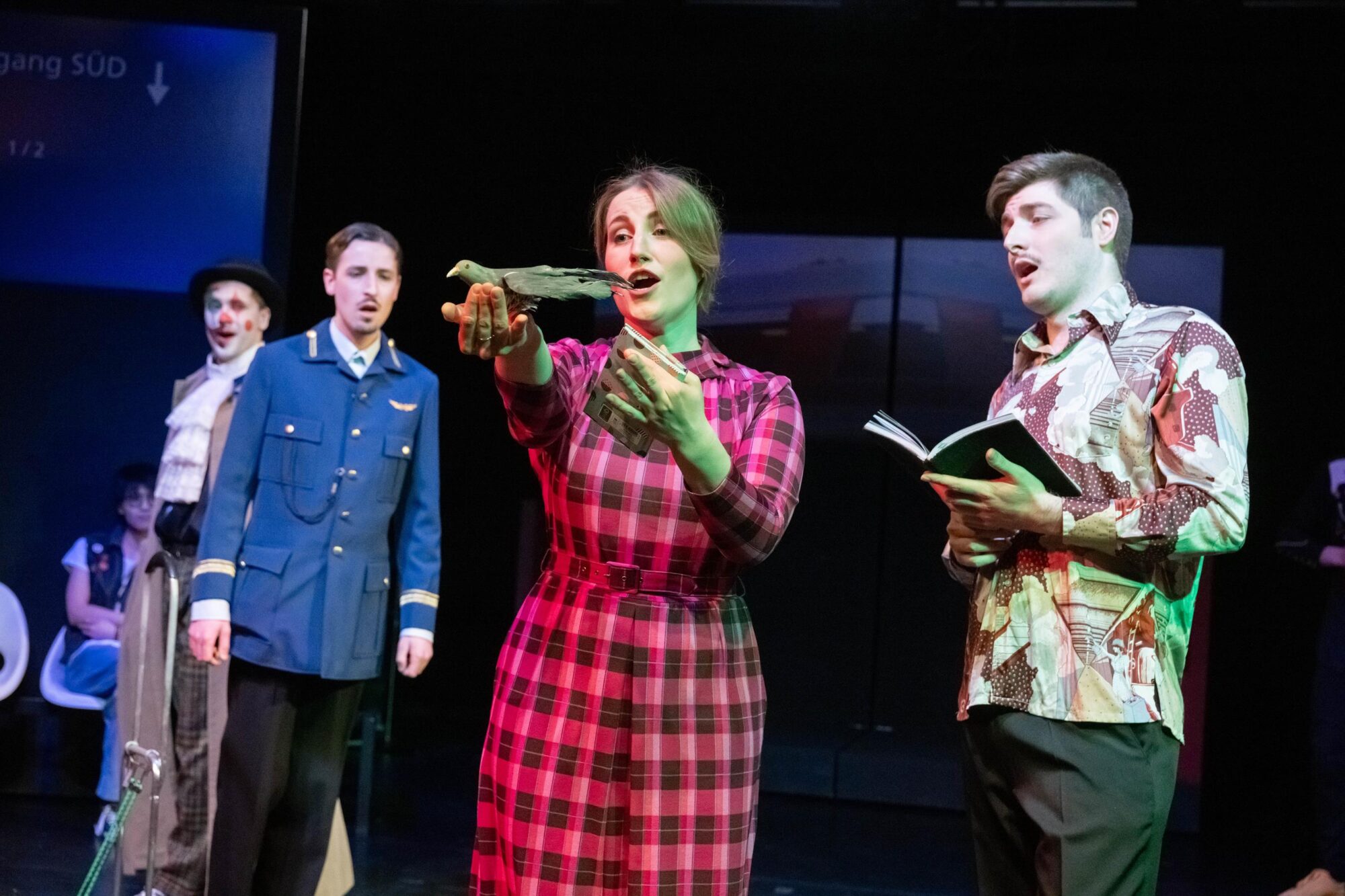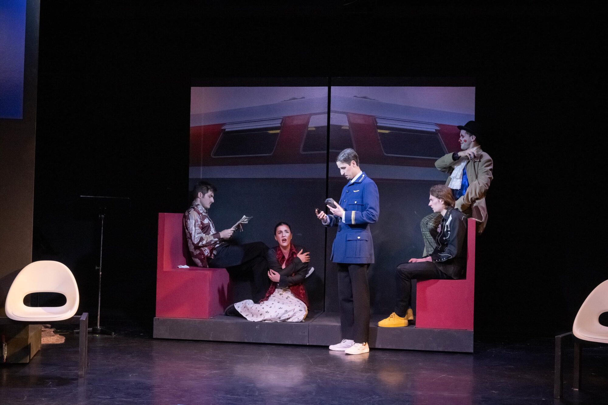Die Tänzer Jacob Cuddon und Alberto Lo Conte runden die verschiedenen Darstellungsformen ab. Udo Hesses Bühnenbild aus verschiebbaren Teilen schafft Bahnhofsambiente, auch für den verspäteten Zug ins Nirgendwo. Die Instrumentalisten, wie etwa der wandlungsfähige Pianist Anton Brezinka, verantwortlich für die musikalische Einstudierung, sind sichtbar ins Spiel einbezogen. In der Rolle des geheimnisvollen Clowns erweckt Miha Brkinjac die zu Beginn noch erstarrten Darsteller zum Leben. Der Bariton überzeugt auch stimmlich mit ausdrucksstarken Einsätzen. Wie er meistern ebenso Sopranistin Antonia Busse, Mezzosopranistin Kejti Karaj, Tenor Arthur Meunier und Musicalsänger Bjron Geudens solistisch sowie in sich neu findenden Formationen einen Parforceritt durch musikalische Stile. Begeisterter Beifall für das Stück am Gleis 23/24.