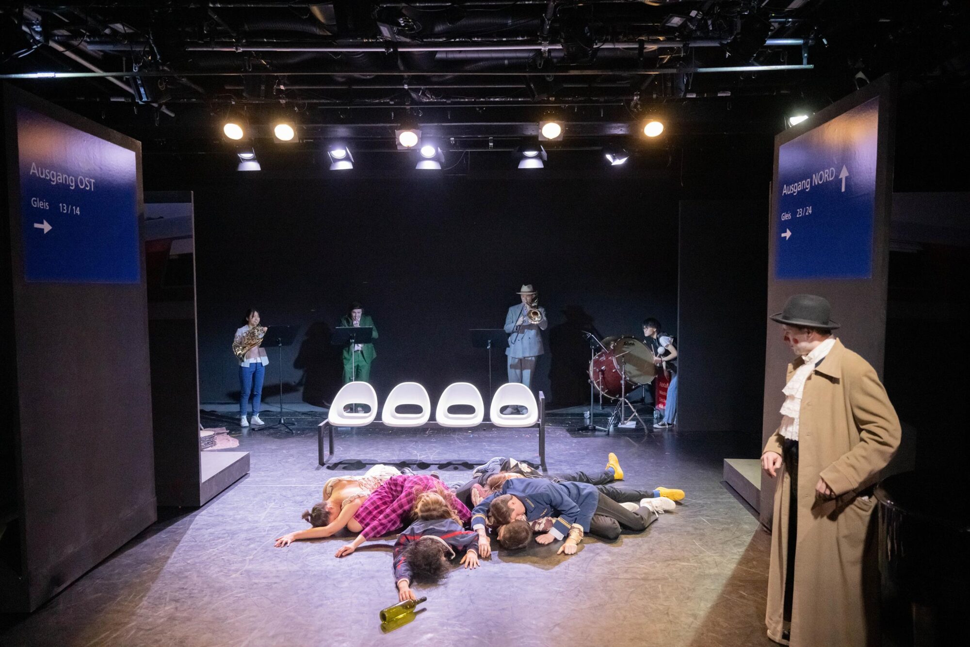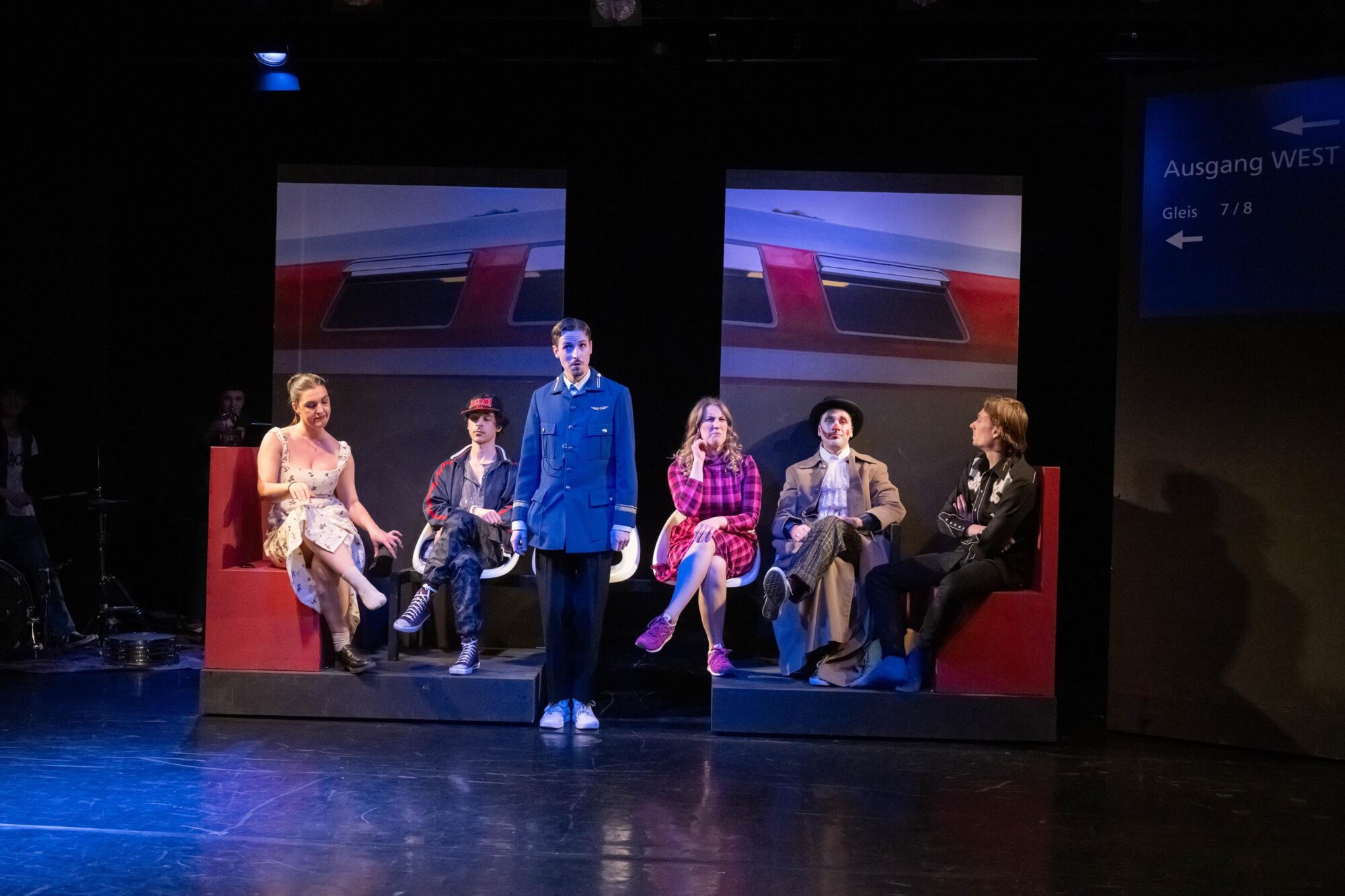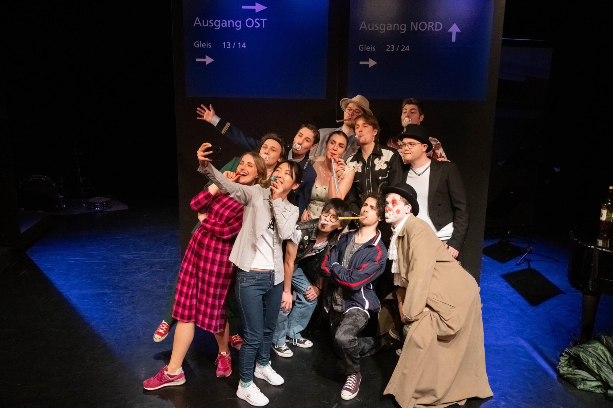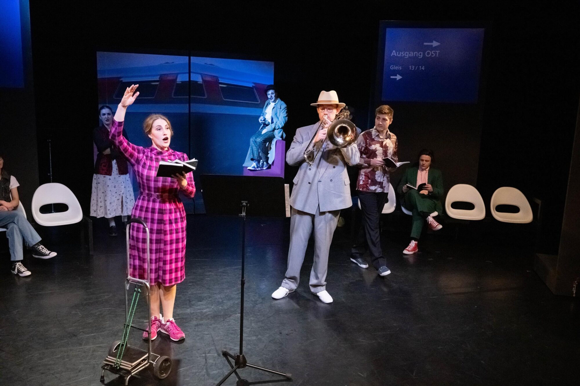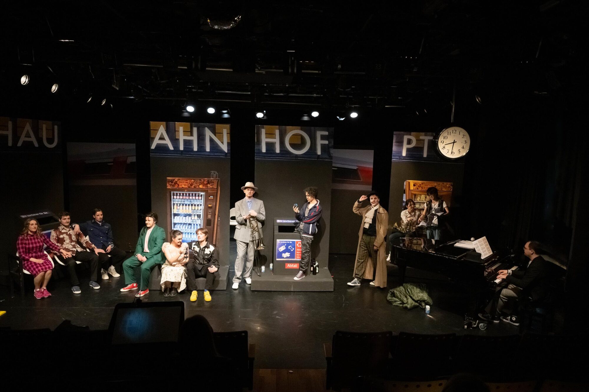 Was macht man mit einer Gruppe, deren Mitglieder sich im Theateralltag eher zufällig begegnen? Die Antwort ist leichter als gedacht. Man lässt sie zufällig am Hauptbahnhof aufeinandertreffen und schaut, was passiert. So einfach ist das, wenn man auf die Spielfreude junger Leute bauen kann. Am Sehnsuchtsort Bahnhof kann ja so ziemlich alles passieren. Der Fantasie sind keine Grenzen gesetzt. Und Bening ist die letzte, die eine solche Situation nicht gnadenlos ausnutzte. Dabei fragt man sich zunächst einmal, ob Bühnenbildner Udo Hesse eigentlich noch sauber tickt. Er hat die schöne tiefe Bühne auf vielleicht drei, vier Meter zur Tribüne durch eine Stellwand verkürzt. Na, da darf man ja mal gespannt sein, wie zwölf Leute auf der Fläche überhaupt nur Platz finden, geschweige denn spielen sollen. Zumal am rechten Rand auch noch ein Flügel aufgebaut ist. Immerhin reicht der Platz in der Höhe noch aus, um eine „Bahnhofsuhr“ aufzuhängen, deren Zeitsprünge im Lauf des Abends echte Überraschungen bieten. Die Genialität des Bühnenbilds eröffnet sich sehr schnell nach Beginn der Aufführung. Dann nämlich wird die Stellwand auseinandergeschoben, und dahinter ist reichlich Platz für ein zusätzliches Zugabteil, Bänke und vieles mehr. Zusätzlich wird die Empore einbezogen. Die Darsteller hat Hesse in alltags- und vor allem bewegungsfreundliche Kostüme der Gegenwart gekleidet. Für eine angemessene, von ganz großen Effekten – die auf der Studiobühne wohl ohnehin kaum möglich sind – freie Beleuchtung zeichnet Diana Hilgers verantwortlich.