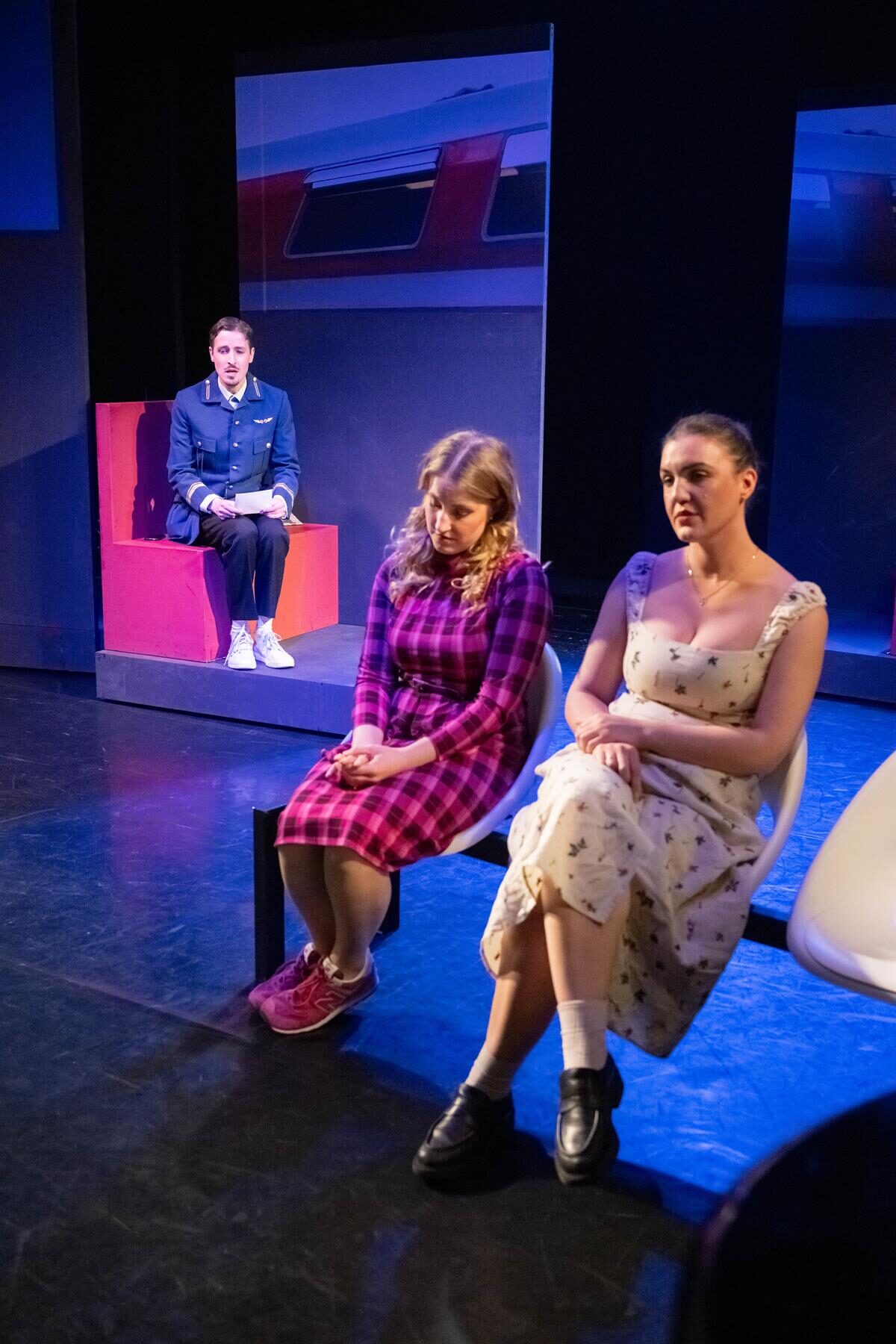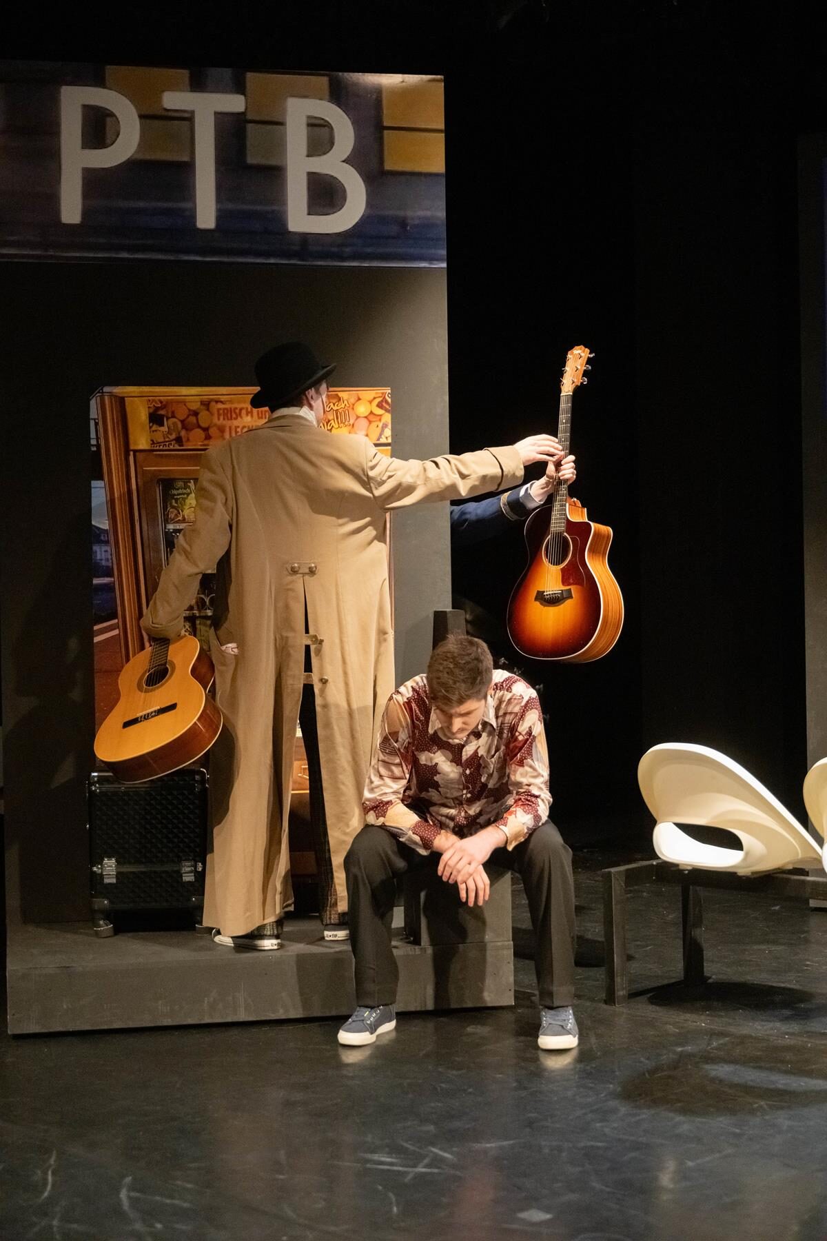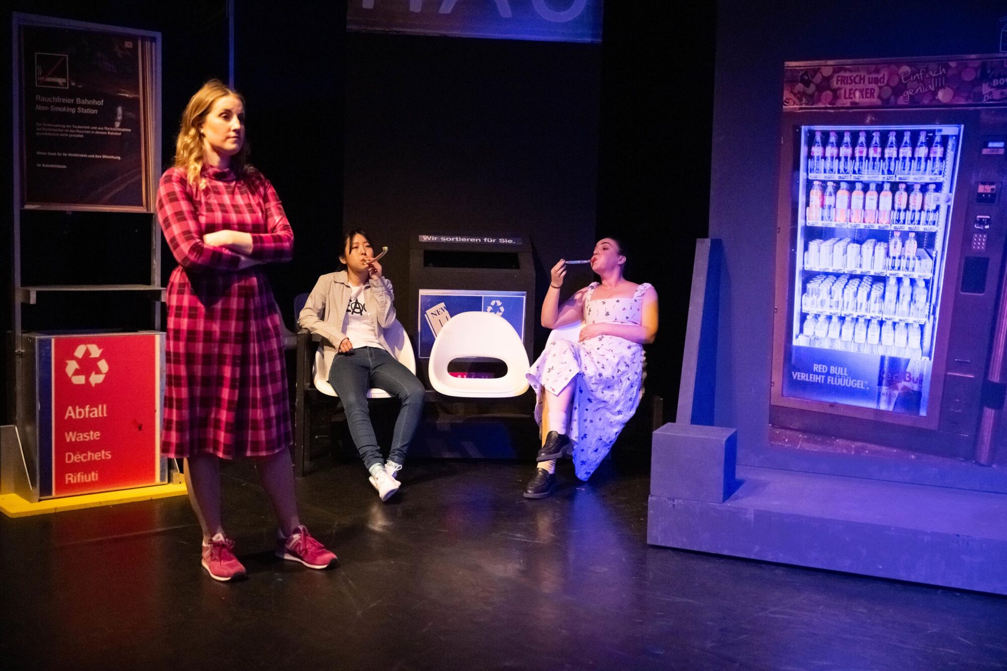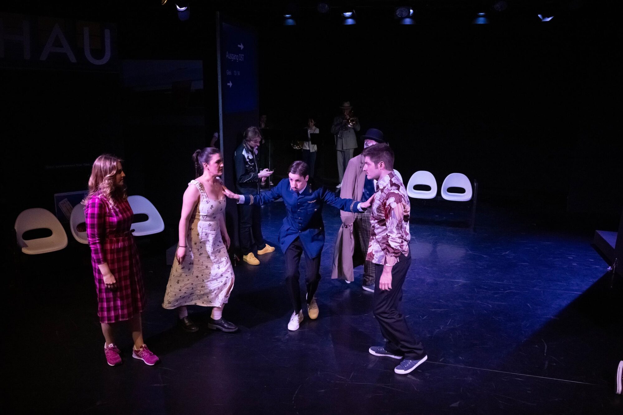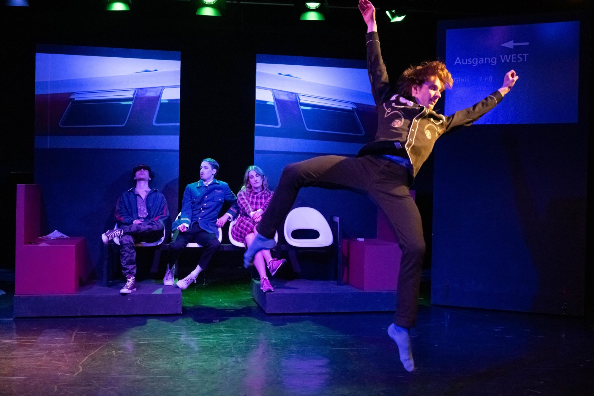 Was macht man mit einer Gruppe, deren Mitglieder sich im Theateralltag eher zufällig begegnen? Die Antwort ist leichter als gedacht. Man lässt sie zufällig am Hauptbahnhof aufeinandertreffen und schaut, was passiert. So einfach ist das, wenn man auf die Spielfreude junger Leute bauen kann. Am Sehnsuchtsort Bahnhof kann ja so ziemlich alles passieren. Der Fantasie sind keine Grenzen gesetzt. Und Bening ist die letzte, die eine solche Situation nicht gnadenlos ausnutzte. Dabei fragt man sich zunächst einmal, ob Bühnenbildner Udo Hesse eigentlich noch sauber tickt. Er hat die schöne tiefe Bühne auf vielleicht drei, vier Meter zur Tribüne durch eine Stellwand verkürzt. Na, da darf man ja mal gespannt sein, wie zwölf Leute auf der Fläche überhaupt nur Platz finden, geschweige denn spielen sollen. Zumal am rechten Rand auch noch ein Flügel aufgebaut ist. Immerhin reicht der Platz in der Höhe noch aus, um eine „Bahnhofsuhr“ aufzuhängen, deren Zeitsprünge im Lauf des Abends echte Überraschungen bieten. Die Genialität des Bühnenbilds eröffnet sich sehr schnell nach Beginn der Aufführung. Dann nämlich wird die Stellwand auseinandergeschoben, und dahinter ist reichlich Platz für ein zusätzliches Zugabteil, Bänke und vieles mehr. Zusätzlich wird die Empore einbezogen. Die Darsteller hat Hesse in alltags- und vor allem bewegungsfreundliche Kostüme der Gegenwart gekleidet. Für eine angemessene, von ganz großen Effekten – die auf der Studiobühne wohl ohnehin kaum möglich sind – freie Beleuchtung zeichnet Diana Hilgers verantwortlich.
