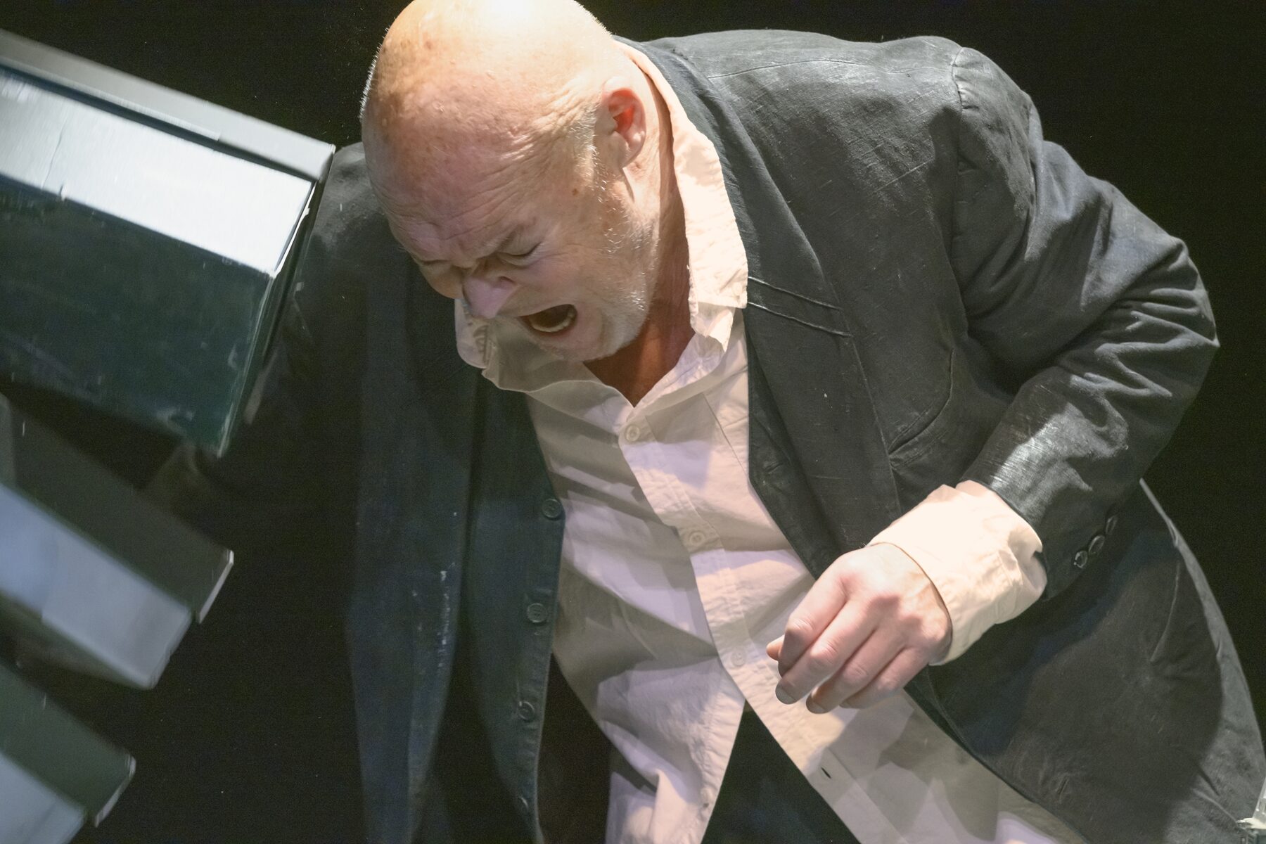 Am Ende verzerrt Schmerz das Gesicht des alten Krapp, Wehmut angesichts der Erinnerungen. Erinnerungen an Erlebnisse, die schon für sein jüngeres, neununddreißigjähriges Ich unwiederbringlich verloren waren. Damals, als er die Tonbänder besprach, in denen sein gealtertes Ich nun Sinn und Trost sucht. Nein, es ist kein leichter Stoff, in den Schauspieler Joachim Henschke die Besucher in der Studiobühne des Theaters Mönchengladbach mit seiner raumgreifenden Präsenz förmlich hineinzieht. […]