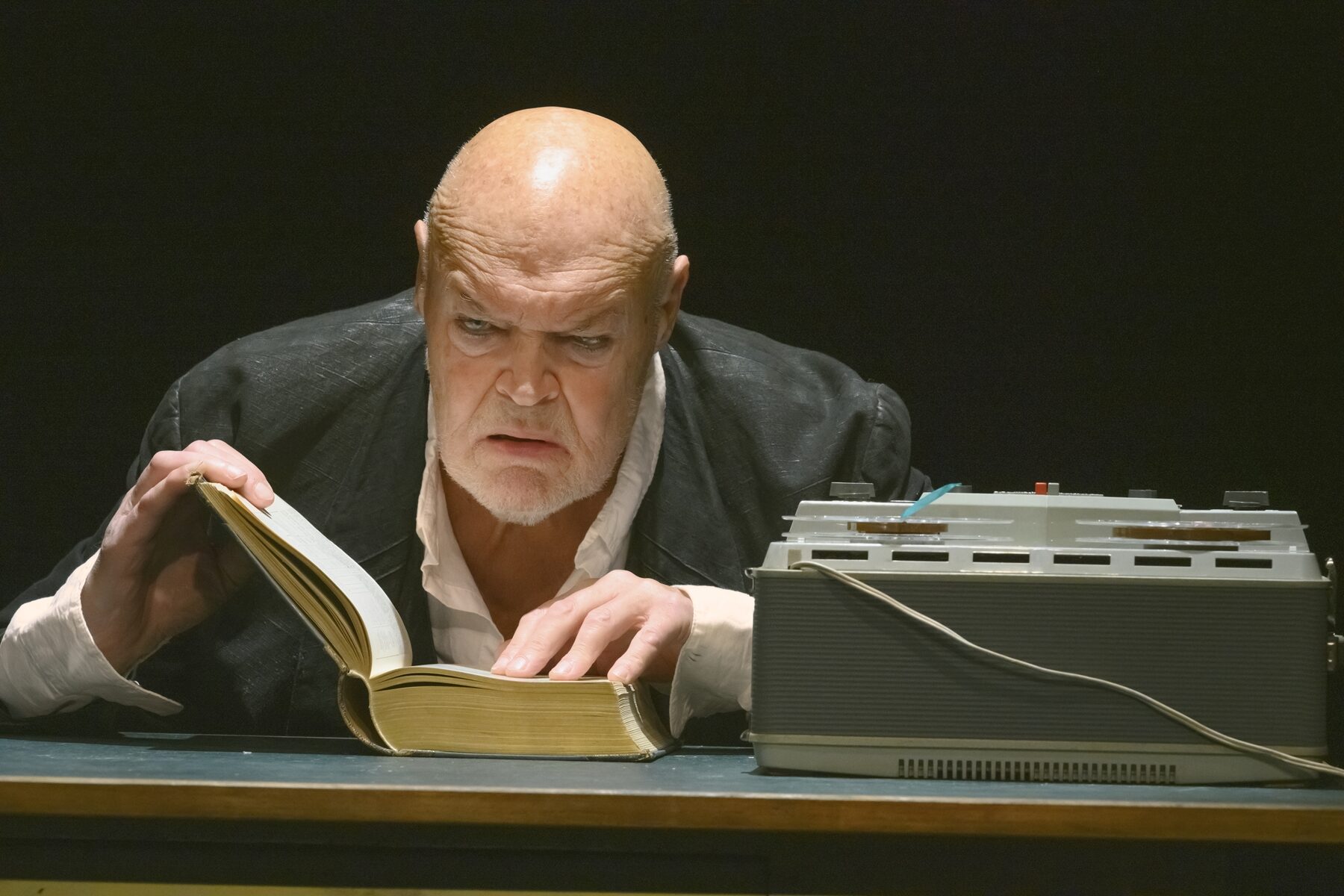 Krapp blickt auf sein einst glücklicheres Leben als Schriftsteller zurück. Aus seinem Tonbandarchiv, in dem er sein Leben akustisch dokumentiert, kramt er das Band hervor, das er als Neununddreißigjähriger besprochen hat und hört es an. Inventur schon damals. Schon damals hatte er einem zehn Jahre zuvor aufgenommenen Tonband-Interview mit sich selbst gelauscht. Sein Leben, eine Nabelschau. Sein Blick, immer zurück.