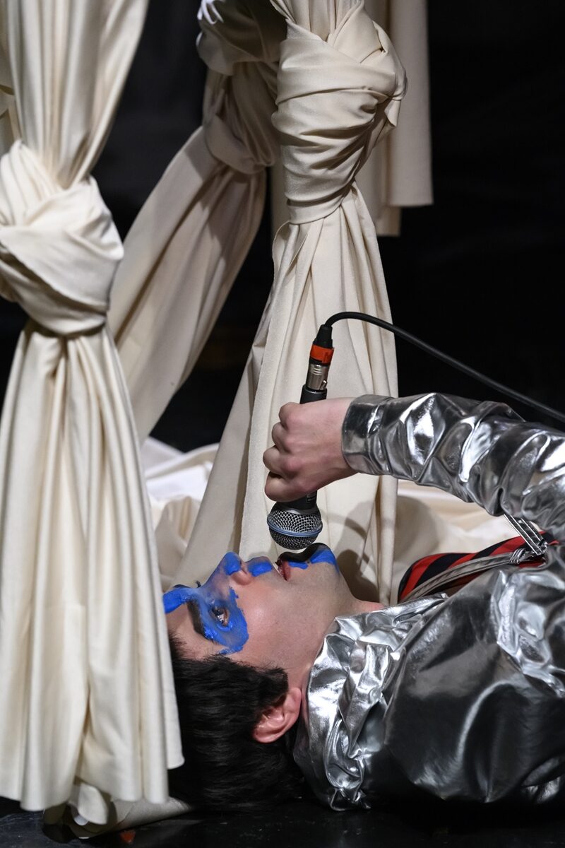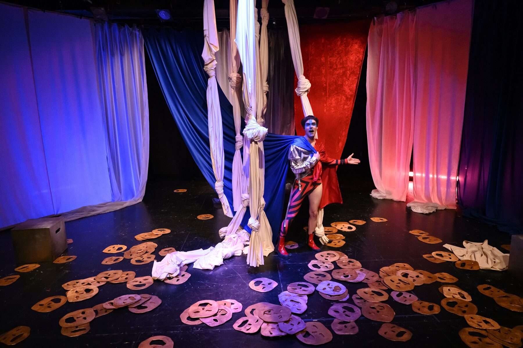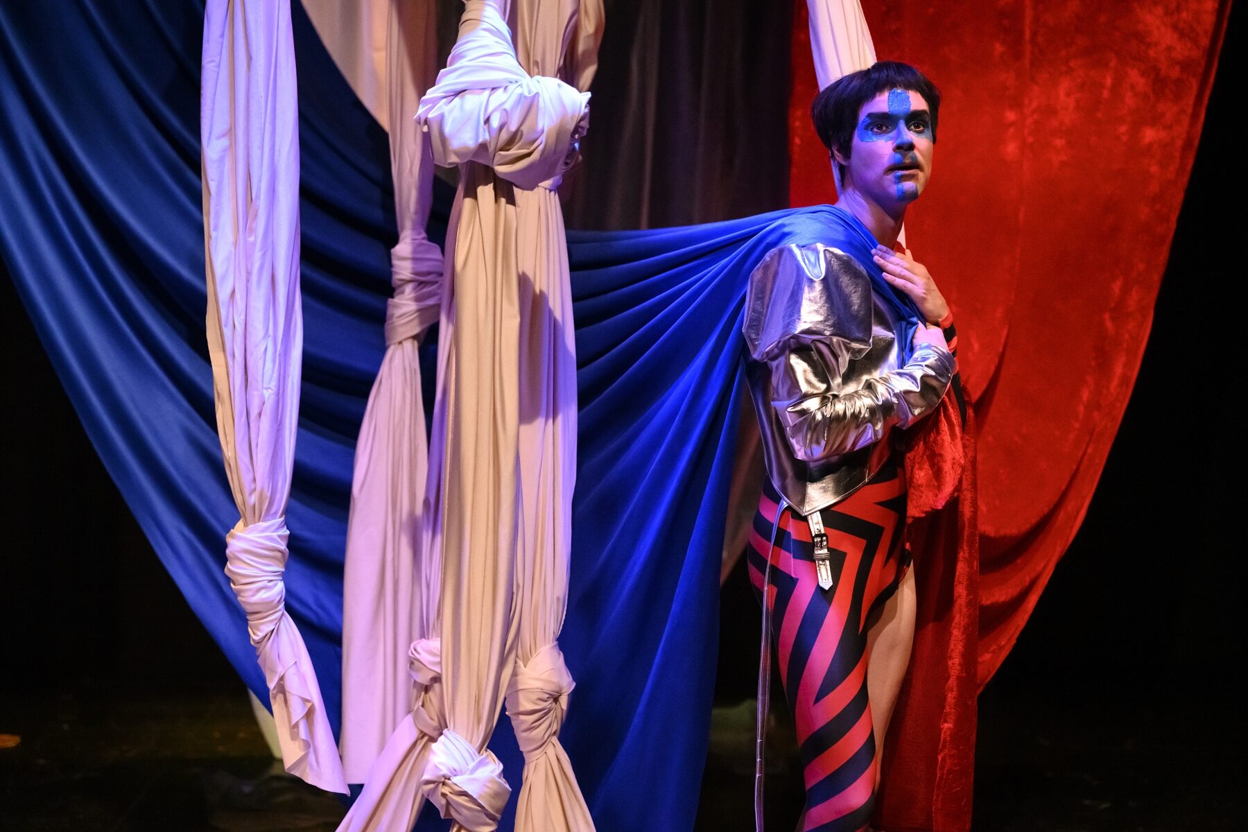 Als sie 13 Jahre alt ist, hört das lothringische Bauernmädchen Jeanne Darc (postum zu d’Arc geadelt) Stimmen. Die Heiligen Katharina und Margareta und der Erzengel Michael übermitteln ihr eine Mission. Sie soll, im Hundertjährigen Krieg, Frankreich von den englischen Besatzern befreien. Mit unglaublichem Mut und eiserner Konsequenz folgt die Siebzehnjährige dieser Berufung. […] Die Jungfrau Jeanne wurde Opfer männlich dominierter Politik ebenso wie der ideologisch bornierten katholischen Kirche, die sie als Hexe denunzierte. Als er 13 Jahre alt ist, leiht sich Philipp Sommer in einer Videothek Luc Bessons Historienfilm über die heilige Johanna aus. Seither hat ihn Jeanne d’Arc nicht mehr losgelassen. Gemeinsam mit der Regisseurin Maja Delinic entwickelte er seit 2019 über mehrere Planungsstationen ein Monodrama. Und spielte nun 90 Minuten lang die französische Nationalheldin, die aus dem peinliche Sicherheit gewährenden Abstand von 500 Jahren von der Kirche 1920 heiliggesprochen wurde. Welch grausiges Paradox! Wie nah der Schauspieler der frühen Verfechterin weiblicher Emanzipation innerlich gekommen ist, zeigte sein famoser Auftritt bei der Uraufführung von „Der Fall D’Arc“ auf der Studiobühne. Die Spielfläche ist eine von transparenten Stoffbahnen markierte Rotunde, die neben schwarz die Farben der Trikolore (blau-weiß-rot) zeigt. Ein baumähnliches Gebilde aus zusammengeknoteten Leinentüchern markiert den mystischen „Feenbaum“, unter dem sich das Mädchen Jeannette (Jeanne) so gern aufhält. Philipp Sommer trägt ein helles Gewand mit Halstuch, seinen dunklen Vollbart musste er dieser besonderen „Hosenrolle“ opfern. Denn die Jungfrau trägt, sobald sie in den Kampfmodus wechselt, Männerkleidung, hier eine Kettenhemdattrappe aus Stoff. Die Situation spiegelt ein experimentelles Konzept: Ein Schauspieler übernimmt die Rolle eines Mädchens, das sich von der aufgezwungenen Rolle ihres sozial untergeordneten Geschlechts die Freiheit zu männlichem Auftreten nimmt. Und dafür mit dem Tode büßt. Nach wenigen Minuten des Monologs spüren wir Zuschauer: Da erzählt einer vom Schicksal einer Frau, in deren Wesen Sommer sich in höchstem Grade einzufühlen vermag. Wir reiben uns die Augen, wenn wir diesen sportlich trainierten, sehr schlanken Mann in Aktion erleben. Zu einem eingespielten Video (Peter Issig) spricht der Darsteller brillant auch die anderen Rollen (darunter ein Bischof und der Dauphin). Die Maskenabteilung und Kostümbildnerin haben eindrucksvolle Arbeit mit viel Witzeffekt geleistet. Philipp Sommer atmet, seufzt, doziert, protestiert und schreit kongenial als Jeanne seine Botschaften heraus, ohne plump weibliche Gesten zu demonstrieren. Mit Zitaten wie „Unterwegs im Auftrag des Herrn“ (aus dem Musical „Blues Brothers“) und grotesken Bezügen (so ein Querverweis auf Felix Heinrichs) sorgt die kreative Maja Delinic für tolle Unterhaltung – nah am Puls der Zeit, dabei stets anspruchsvoll in den Aussagen. Ein feiner, klug konzipierter und vom Darsteller berührend modulierter Schauspielabend!