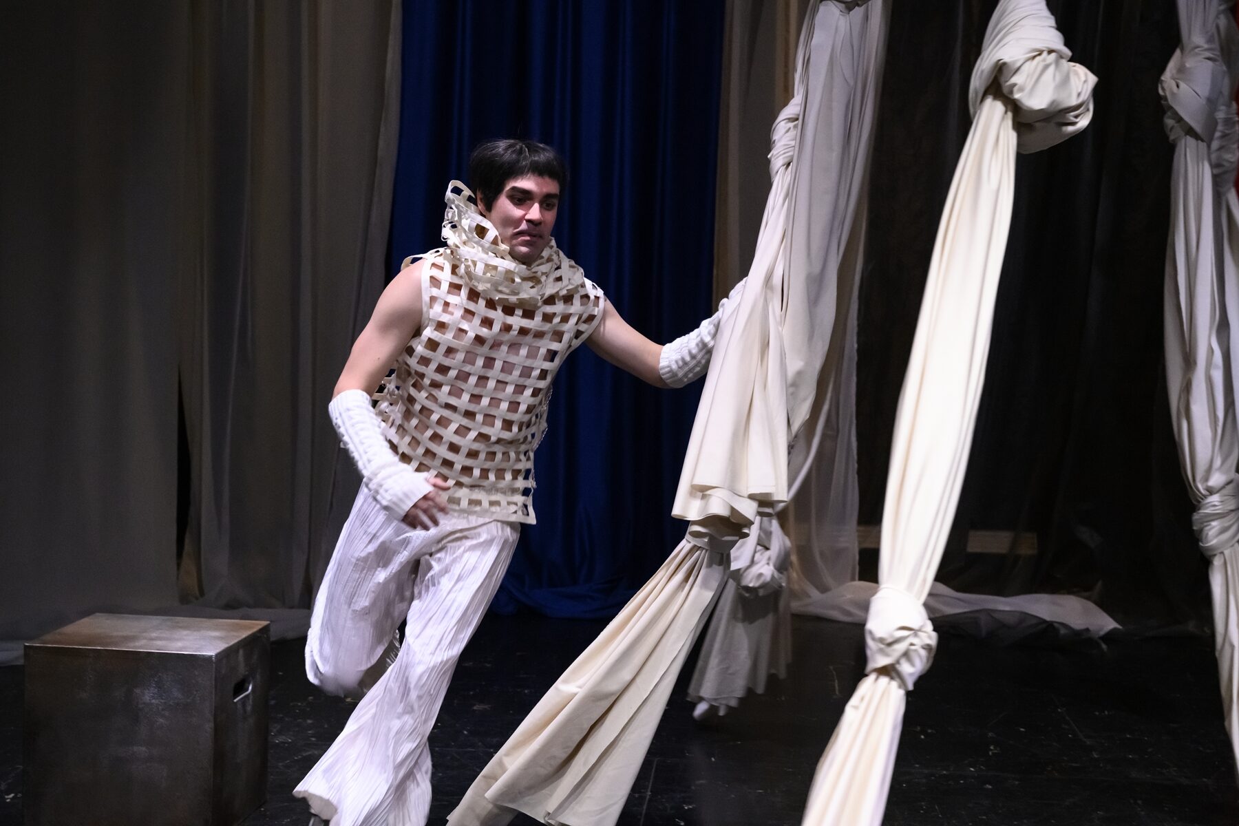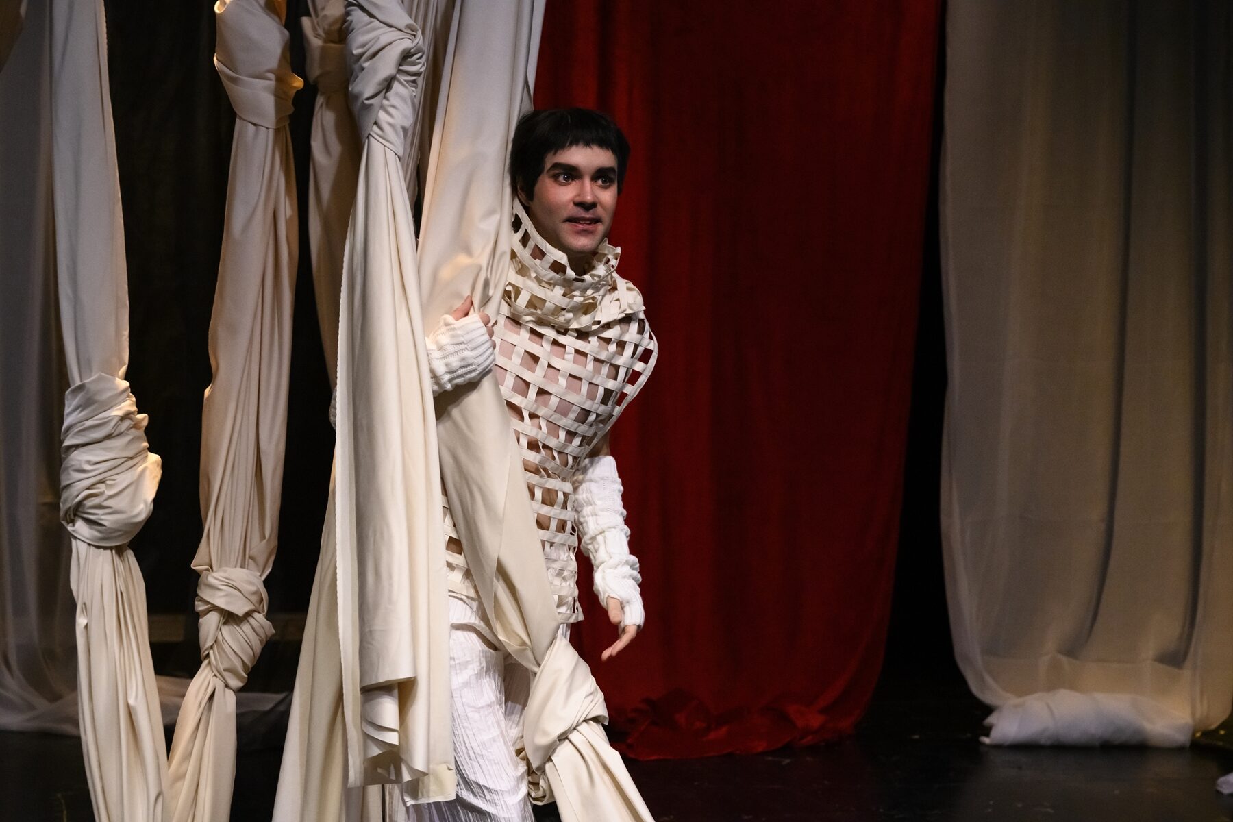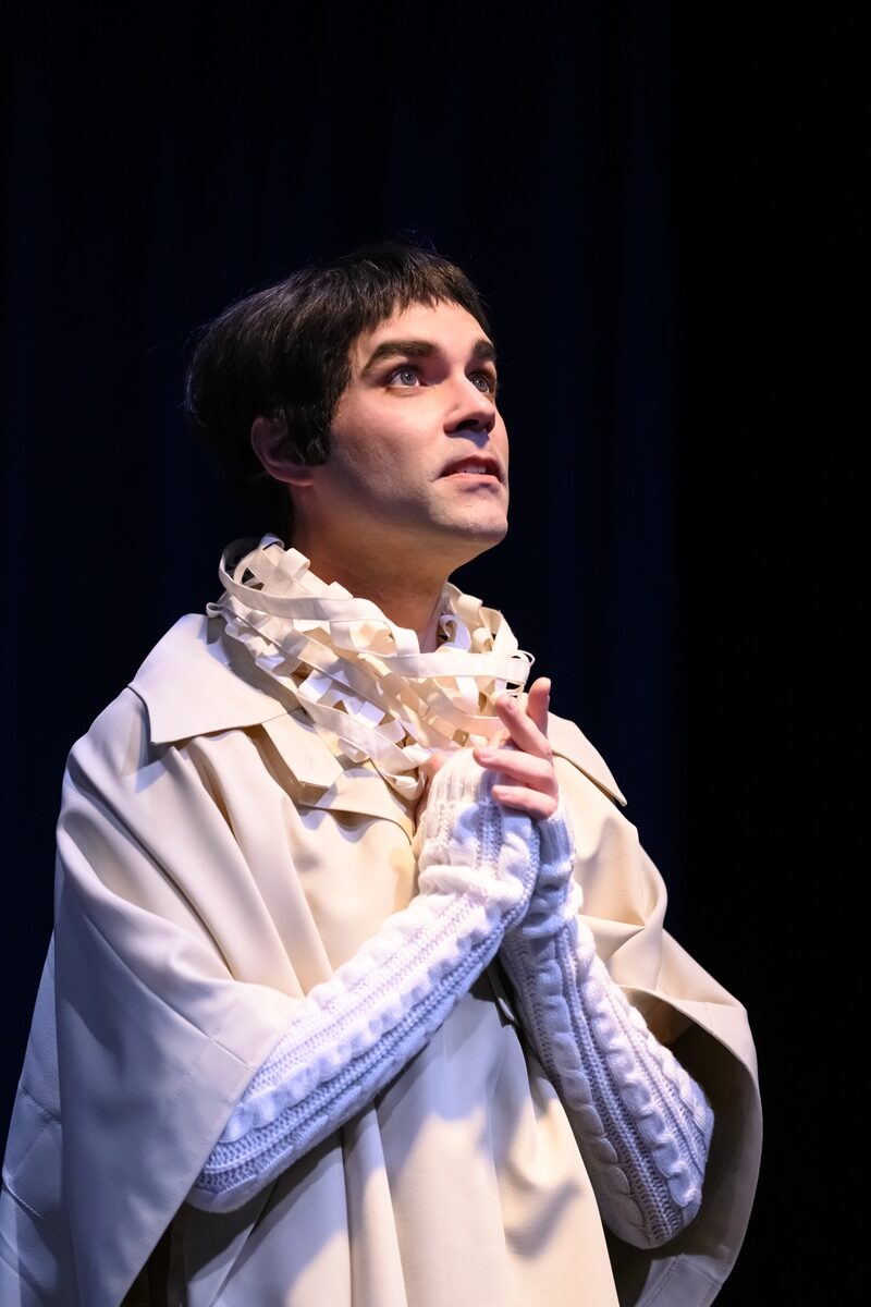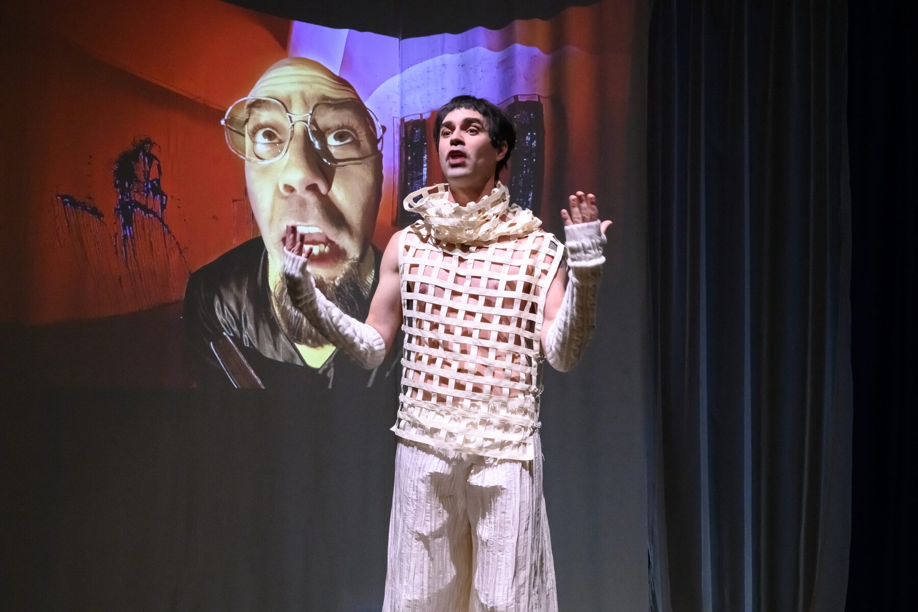 Als sie 13 Jahre alt ist, hört das lothringische Bauernmädchen Jeanne Darc (postum zu d’Arc geadelt) Stimmen. Die Heiligen Katharina und Margareta und der Erzengel Michael übermitteln ihr eine Mission. Sie soll, im Hundertjährigen Krieg, Frankreich von den englischen Besatzern befreien. Mit unglaublichem Mut und eiserner Konsequenz folgt die Siebzehnjährige dieser Berufung. […] Die Jungfrau Jeanne wurde Opfer männlich dominierter Politik ebenso wie der ideologisch bornierten katholischen Kirche, die sie als Hexe denunzierte. Als er 13 Jahre alt ist, leiht sich Philipp Sommer in einer Videothek Luc Bessons Historienfilm über die heilige Johanna aus. Seither hat ihn Jeanne d’Arc nicht mehr losgelassen. Gemeinsam mit der Regisseurin Maja Delinic entwickelte er seit 2019 über mehrere Planungsstationen ein Monodrama. Und spielte nun 90 Minuten lang die französische Nationalheldin, die aus dem peinliche Sicherheit gewährenden Abstand von 500 Jahren von der Kirche 1920 heiliggesprochen wurde. Welch grausiges Paradox! Wie nah der Schauspieler der frühen Verfechterin weiblicher Emanzipation innerlich gekommen ist, zeigte sein famoser Auftritt bei der Uraufführung von „Der Fall D’Arc“ auf der Studiobühne. Die Spielfläche ist eine von transparenten Stoffbahnen markierte Rotunde, die neben schwarz die Farben der Trikolore (blau-weiß-rot) zeigt. Ein baumähnliches Gebilde aus zusammengeknoteten Leinentüchern markiert den mystischen „Feenbaum“, unter dem sich das Mädchen Jeannette (Jeanne) so gern aufhält. Philipp Sommer trägt ein helles Gewand mit Halstuch, seinen dunklen Vollbart musste er dieser besonderen „Hosenrolle“ opfern. Denn die Jungfrau trägt, sobald sie in den Kampfmodus wechselt, Männerkleidung, hier eine Kettenhemdattrappe aus Stoff. Die Situation spiegelt ein experimentelles Konzept: Ein Schauspieler übernimmt die Rolle eines Mädchens, das sich von der aufgezwungenen Rolle ihres sozial untergeordneten Geschlechts die Freiheit zu männlichem Auftreten nimmt. Und dafür mit dem Tode büßt. Nach wenigen Minuten des Monologs spüren wir Zuschauer: Da erzählt einer vom Schicksal einer Frau, in deren Wesen Sommer sich in höchstem Grade einzufühlen vermag. Wir reiben uns die Augen, wenn wir diesen sportlich trainierten, sehr schlanken Mann in Aktion erleben. Zu einem eingespielten Video (Peter Issig) spricht der Darsteller brillant auch die anderen Rollen (darunter ein Bischof und der Dauphin). Die Maskenabteilung und Kostümbildnerin haben eindrucksvolle Arbeit mit viel Witzeffekt geleistet. Philipp Sommer atmet, seufzt, doziert, protestiert und schreit kongenial als Jeanne seine Botschaften heraus, ohne plump weibliche Gesten zu demonstrieren. Mit Zitaten wie „Unterwegs im Auftrag des Herrn“ (aus dem Musical „Blues Brothers“) und grotesken Bezügen (so ein Querverweis auf Felix Heinrichs) sorgt die kreative Maja Delinic für tolle Unterhaltung – nah am Puls der Zeit, dabei stets anspruchsvoll in den Aussagen. Ein feiner, klug konzipierter und vom Darsteller berührend modulierter Schauspielabend!