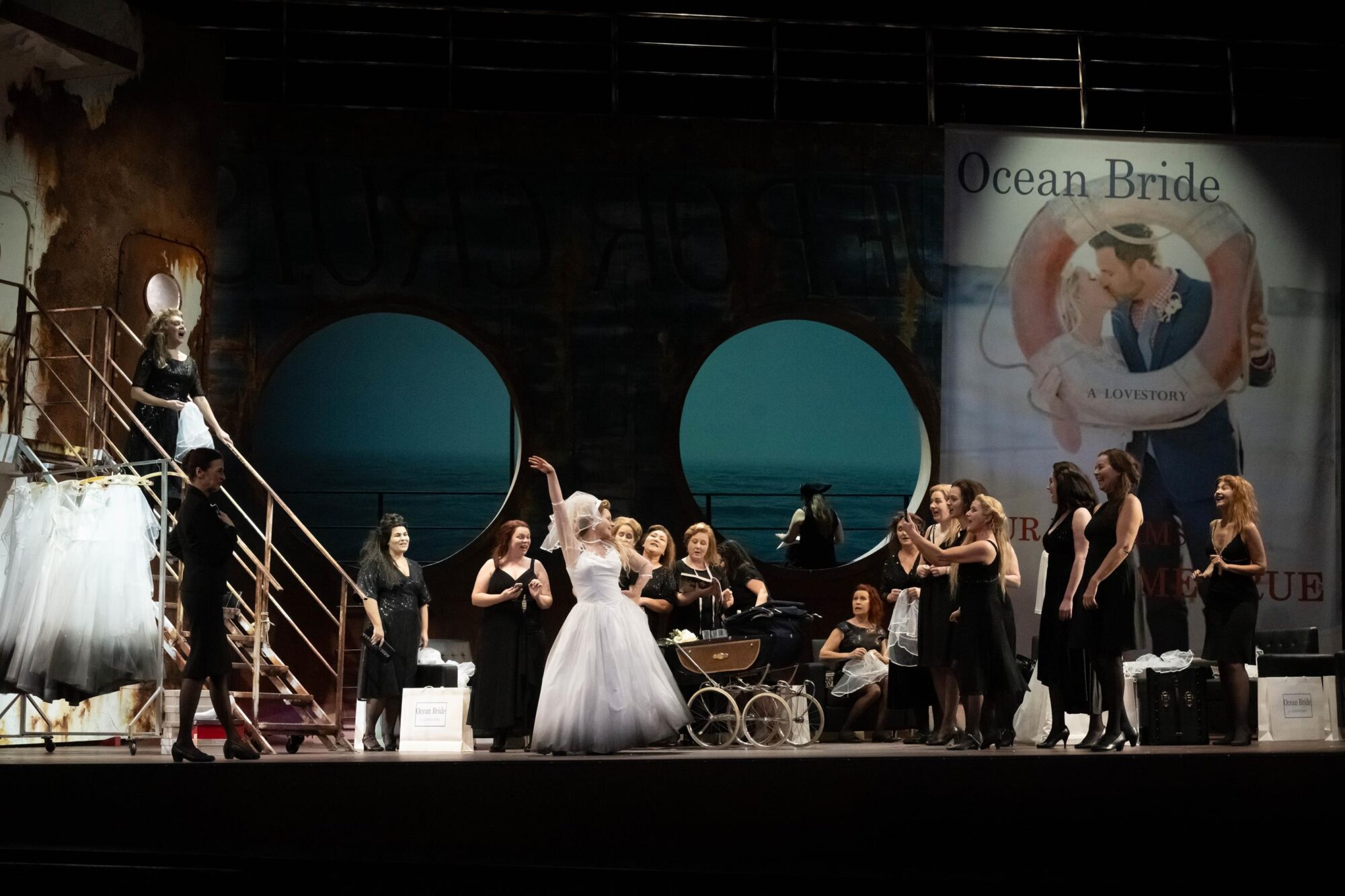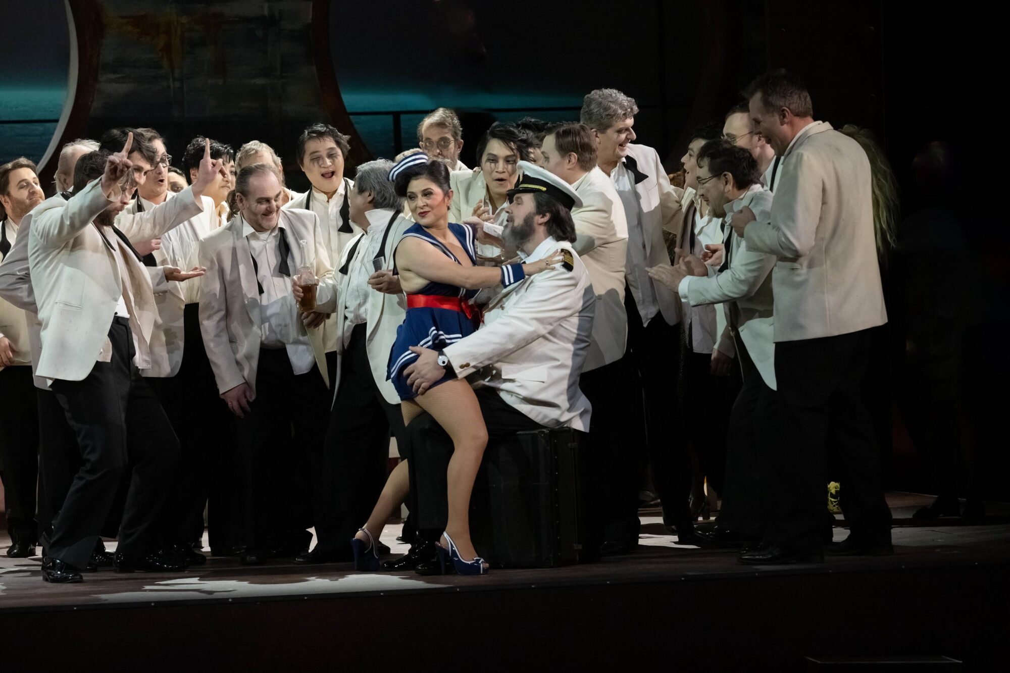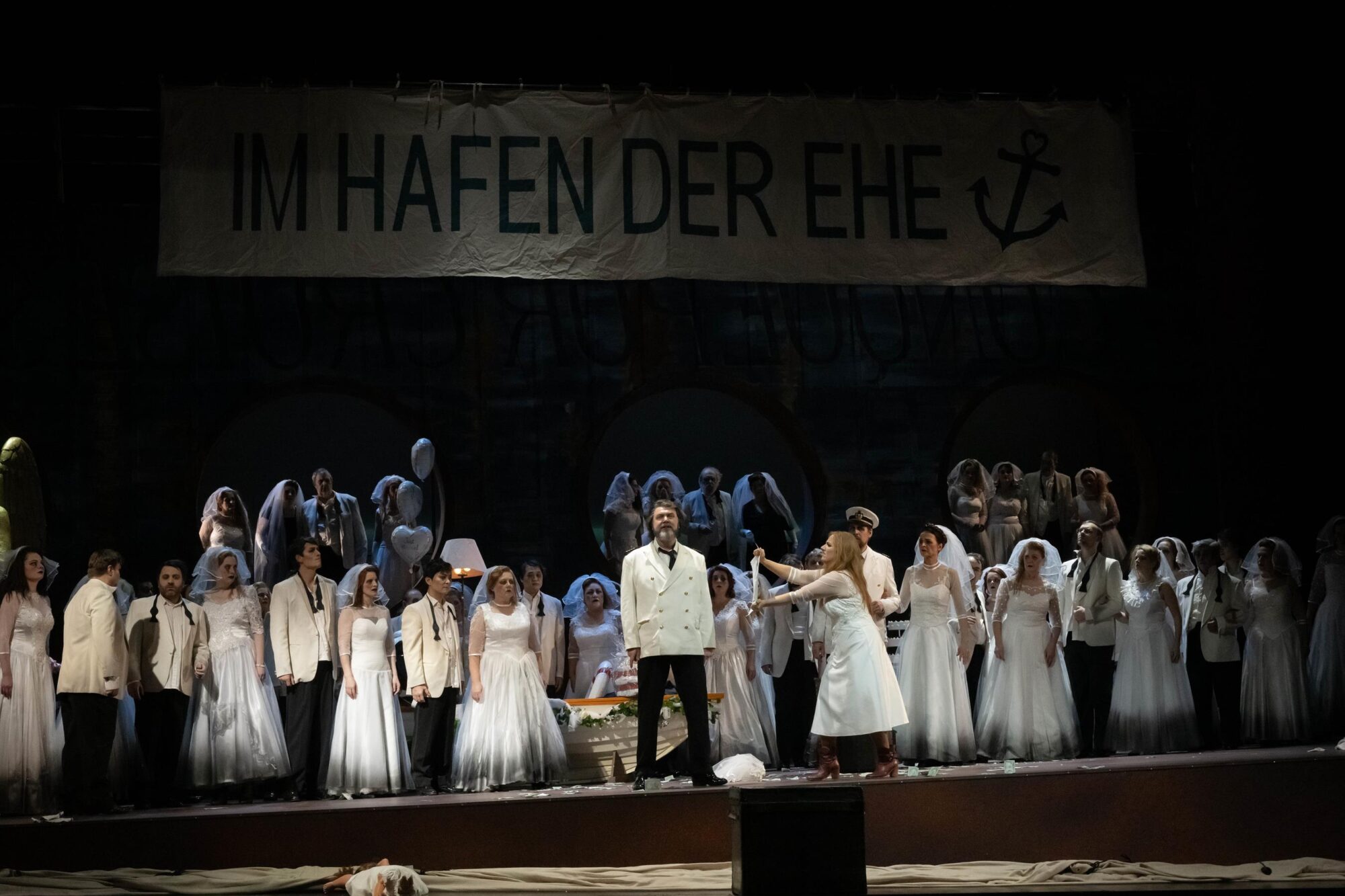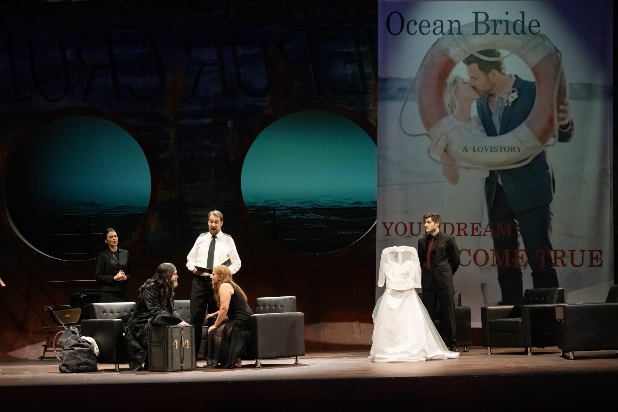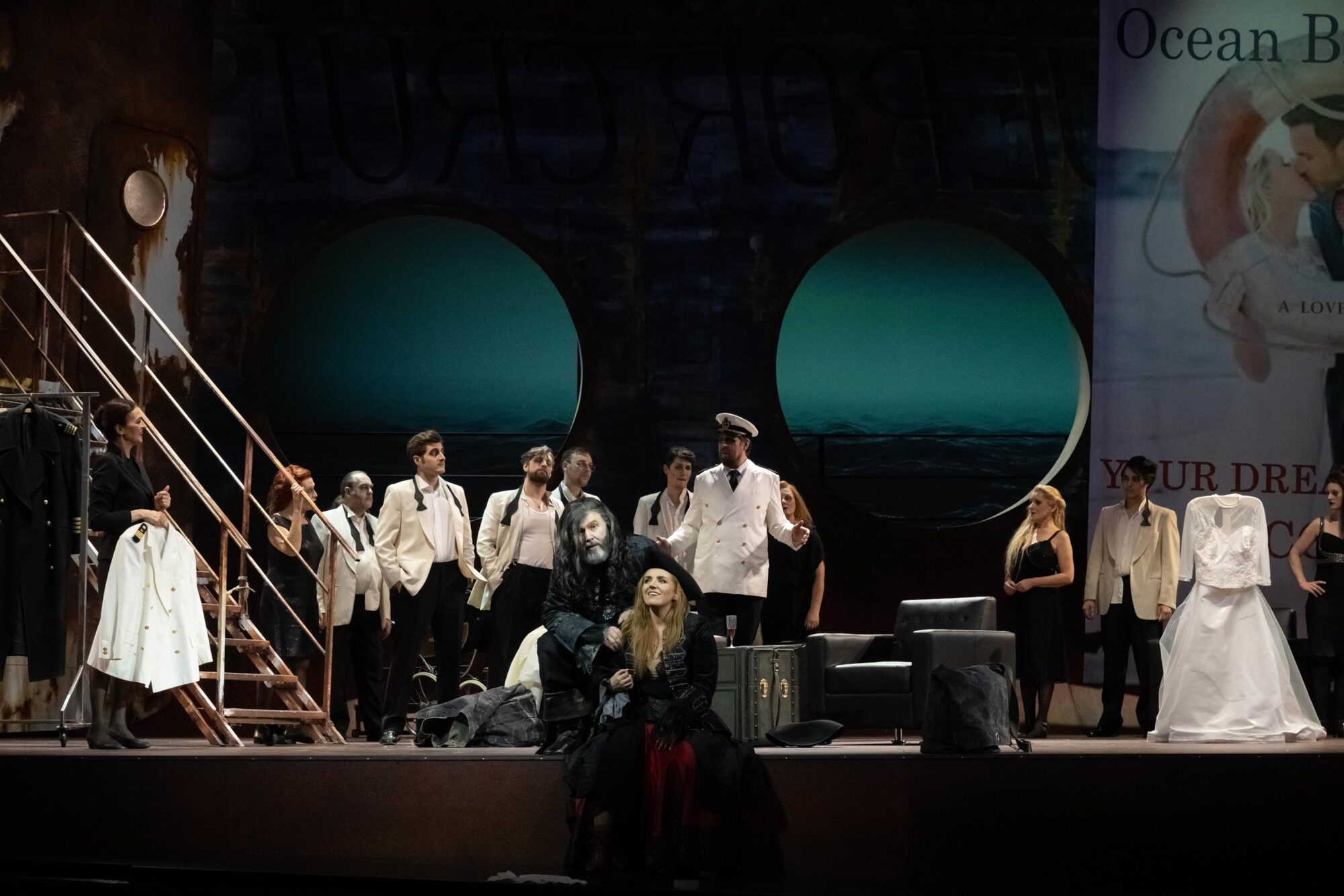 Das Bühnenbild der Bühne auf der Bühne ist nach rechts erhöht. Dadurch hat man ständig den Eindruck, in einem Schiff zu sitzen, das schief in den Wellen liegt. Bühnenfilmer Peter Issig hat hervorragende Videoprojektionen der See, die im Hintergrund immer zu sehen ist, und vor allem Großaufnahmen der Protagonisten, die live in schwarz-weiß projiziert werden, erstellt, die die Ästhetik des Kinos erzeugen. Auch die Kostüme von Mechthild Seipel sind in jeder Hinsicht eine Augenweide, auch weil sie im dritten Akt alle Frauen in Brautkleider und die Herren in Smokings bzw. moderne Seemannsuniformen steckt.