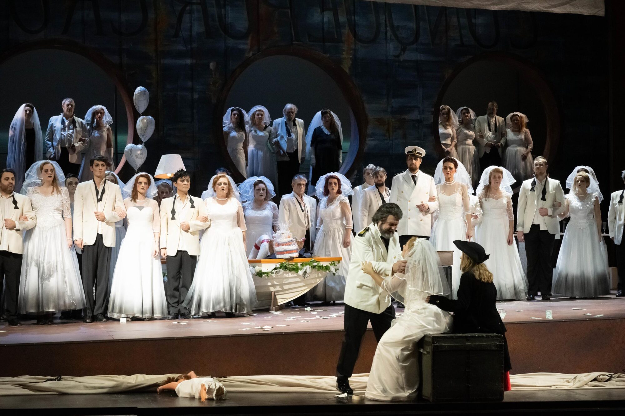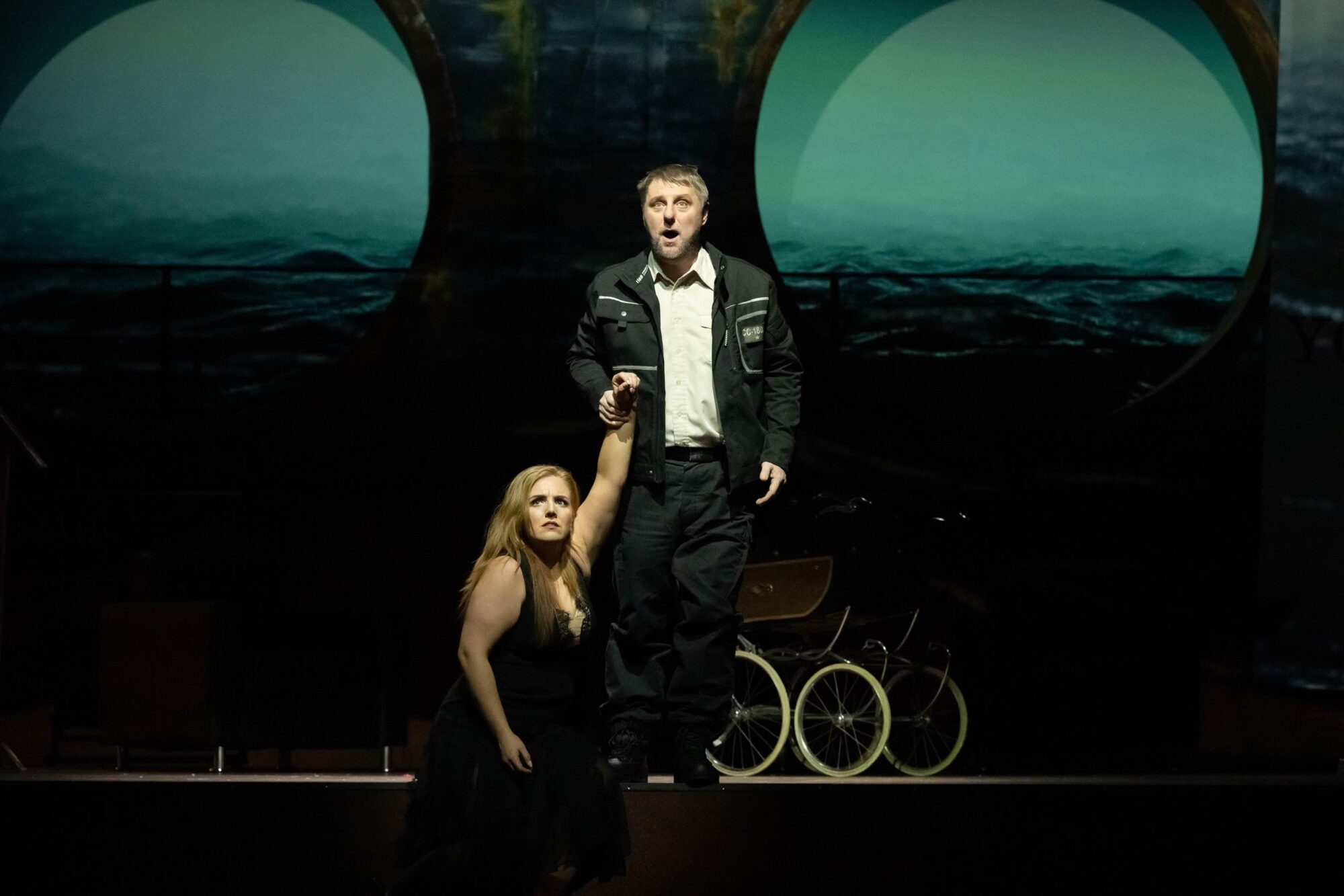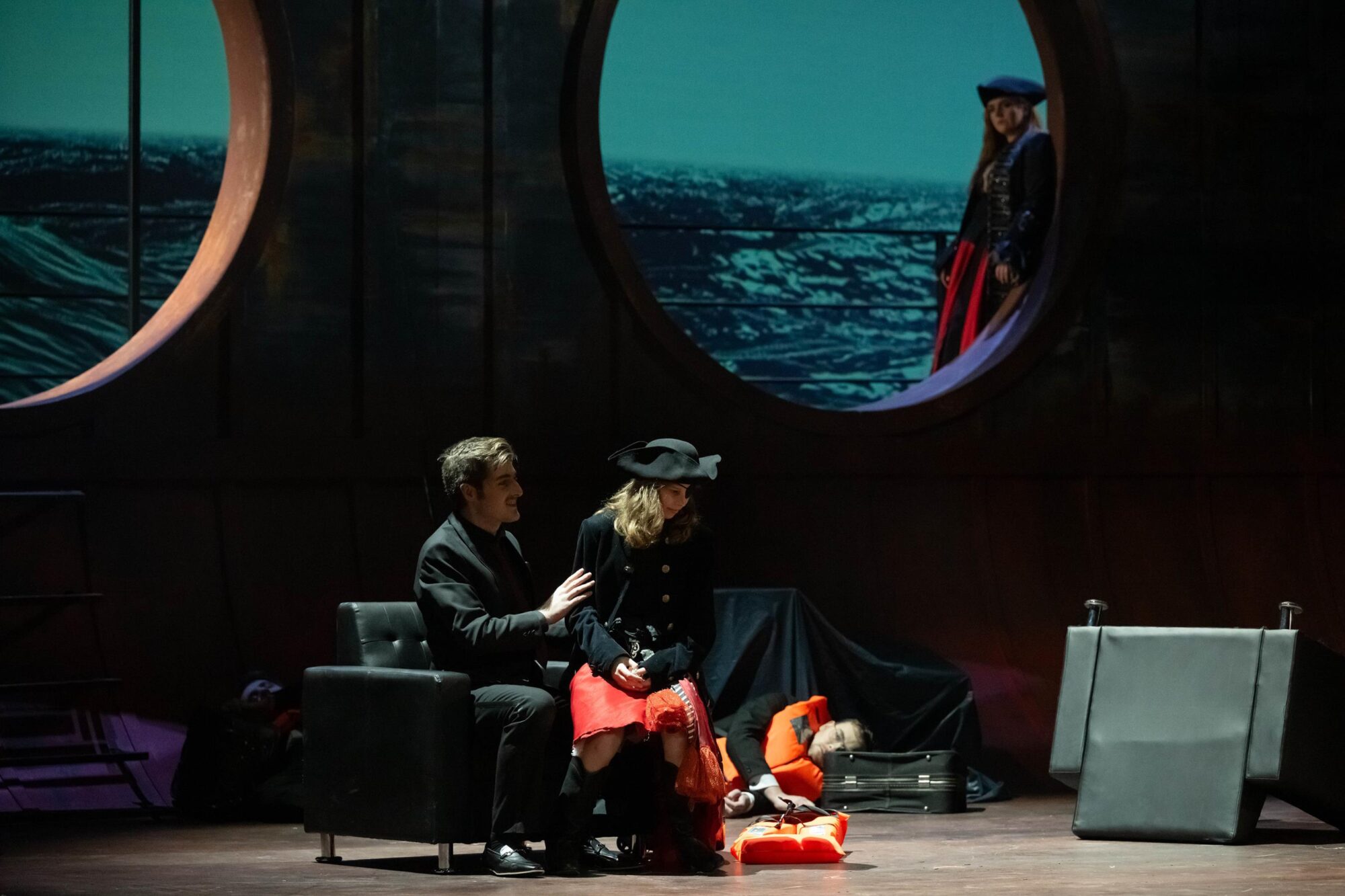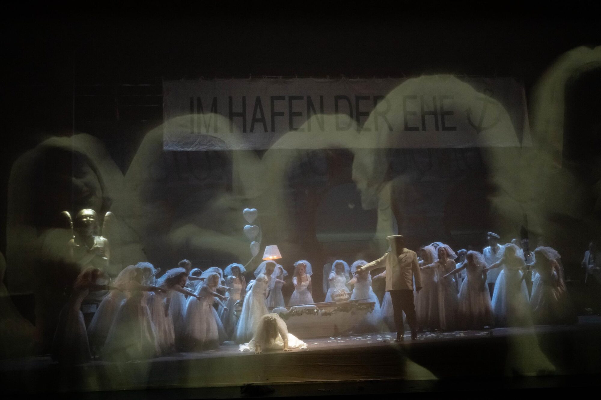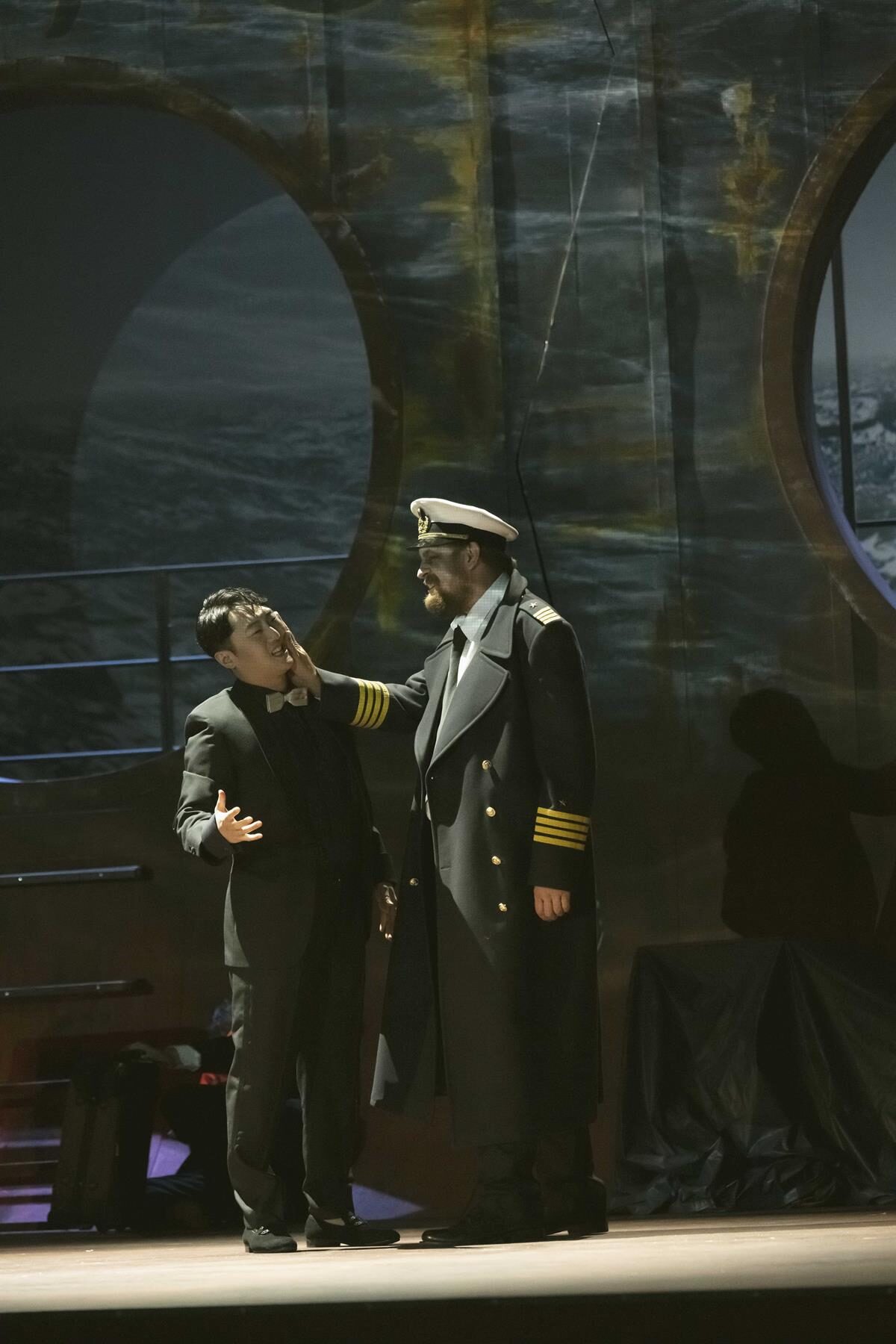 Das Bühnenbild der Bühne auf der Bühne ist nach rechts erhöht. Dadurch hat man ständig den Eindruck, in einem Schiff zu sitzen, das schief in den Wellen liegt. Bühnenfilmer Peter Issig hat hervorragende Videoprojektionen der See, die im Hintergrund immer zu sehen ist, und vor allem Großaufnahmen der Protagonisten, die live in schwarz-weiß projiziert werden, erstellt, die die Ästhetik des Kinos erzeugen. Auch die Kostüme von Mechthild Seipel sind in jeder Hinsicht eine Augenweide, auch weil sie im dritten Akt alle Frauen in Brautkleider und die Herren in Smokings bzw. moderne Seemannsuniformen steckt.