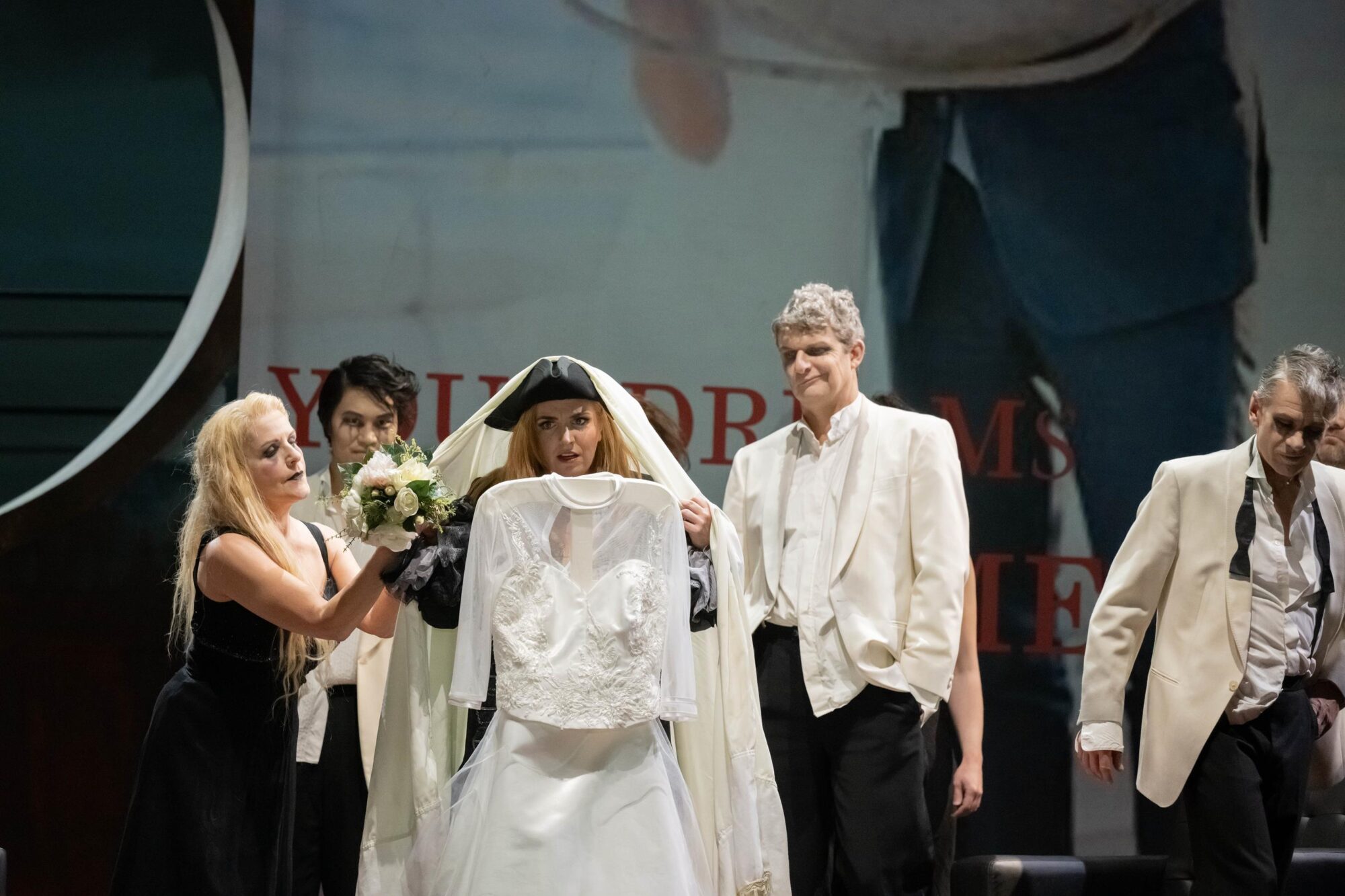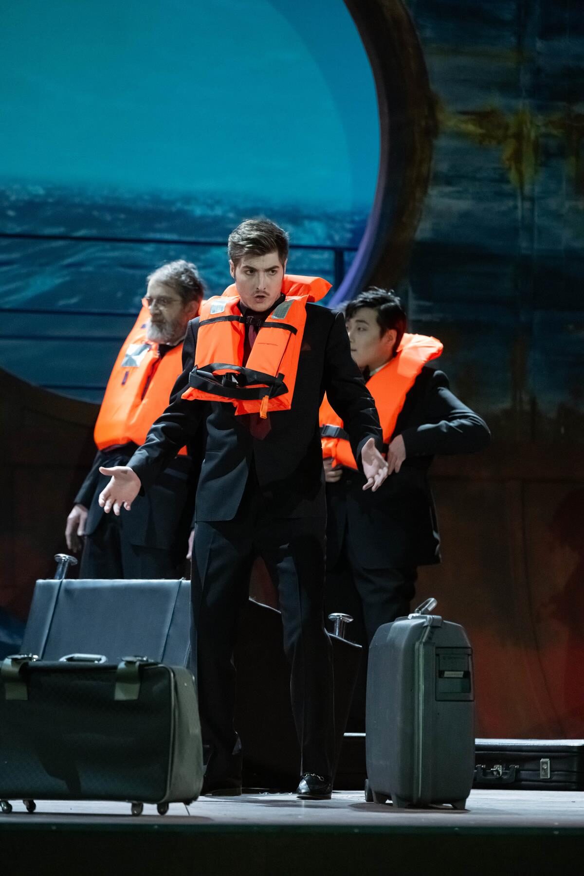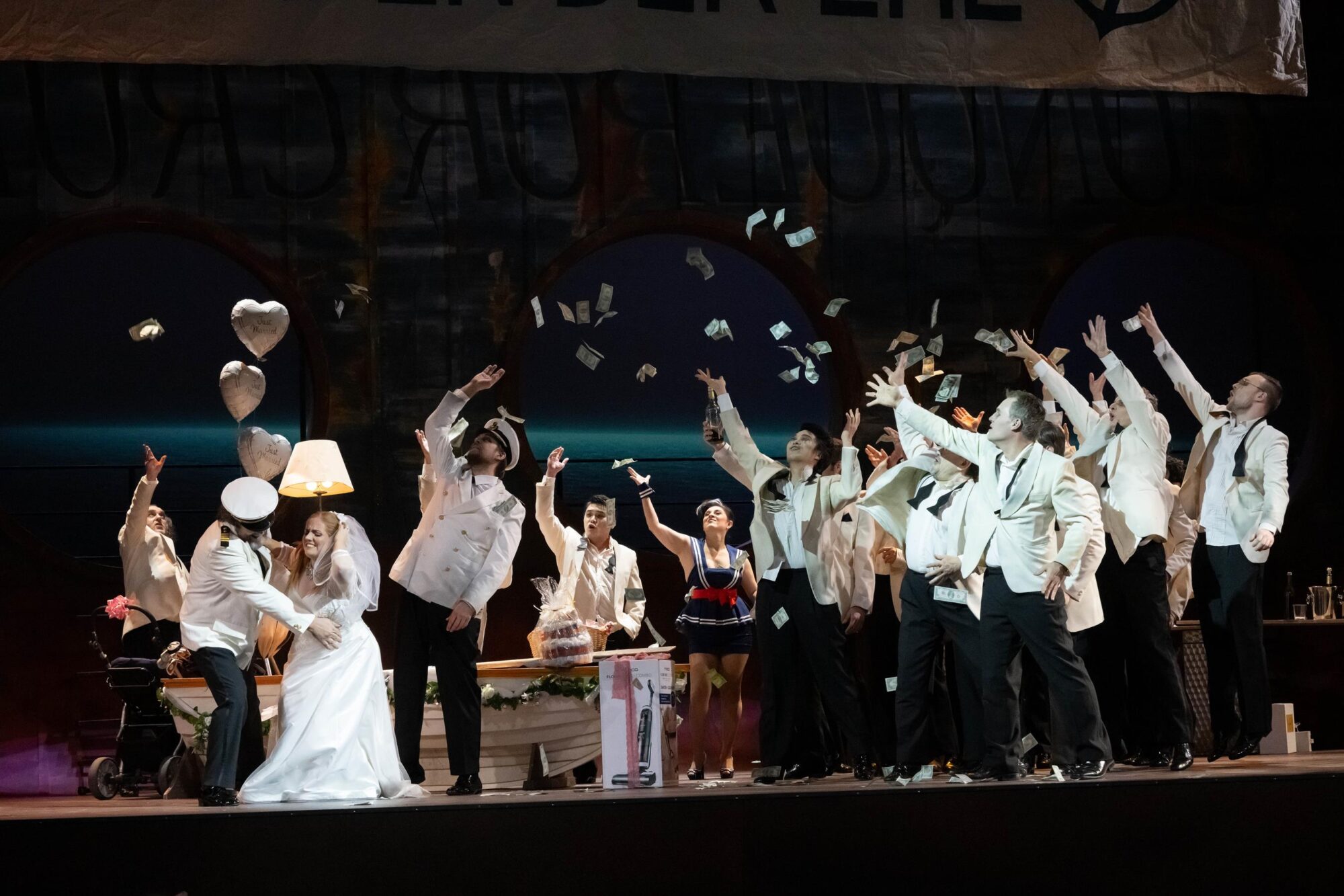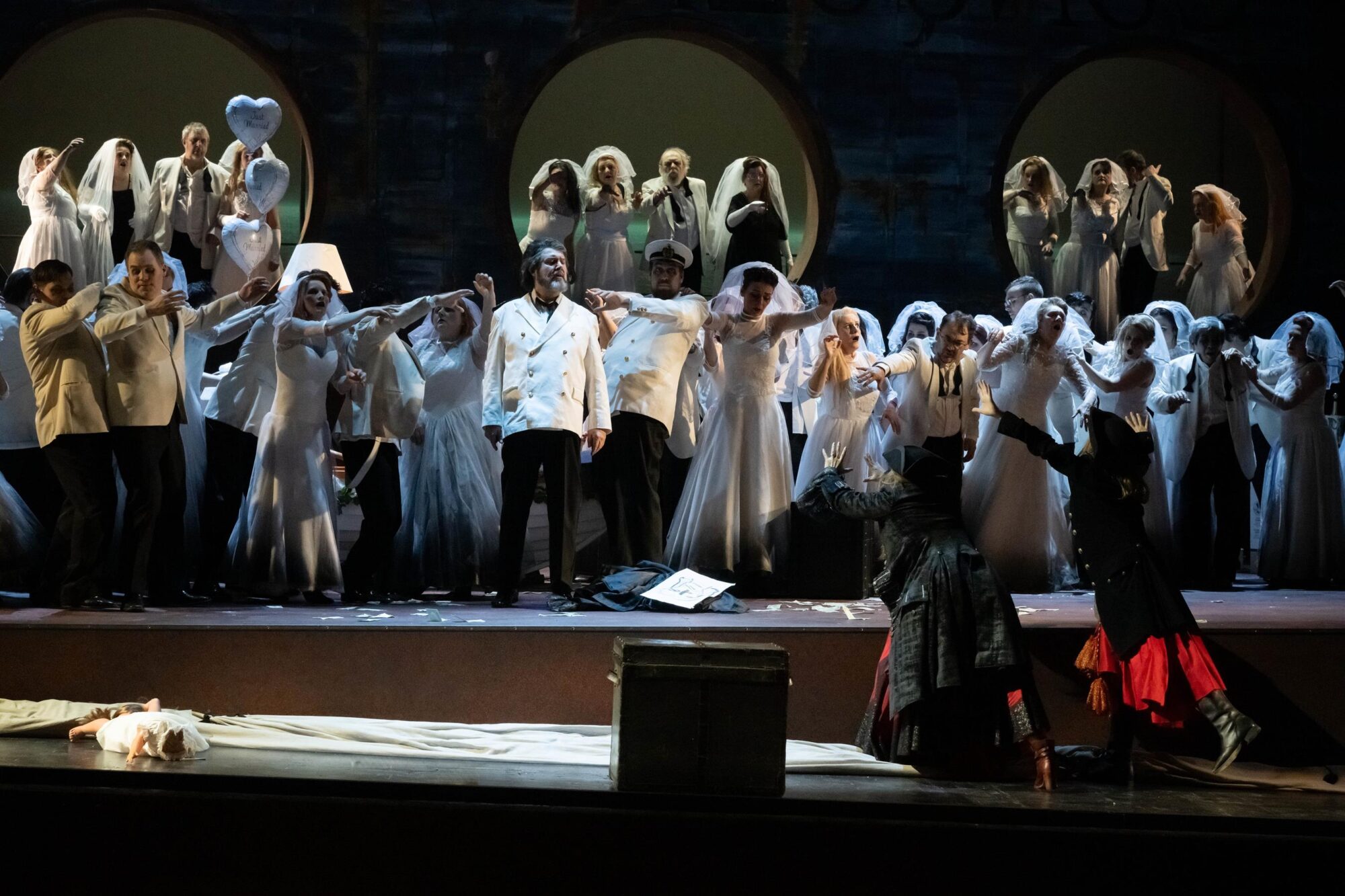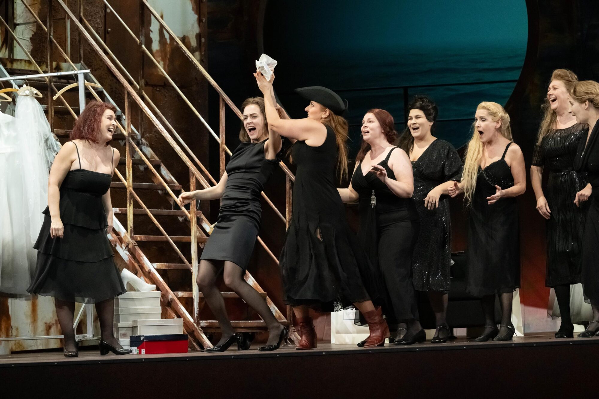 Das Bühnenbild der Bühne auf der Bühne ist nach rechts erhöht. Dadurch hat man ständig den Eindruck, in einem Schiff zu sitzen, das schief in den Wellen liegt. Bühnenfilmer Peter Issig hat hervorragende Videoprojektionen der See, die im Hintergrund immer zu sehen ist, und vor allem Großaufnahmen der Protagonisten, die live in schwarz-weiß projiziert werden, erstellt, die die Ästhetik des Kinos erzeugen. Auch die Kostüme von Mechthild Seipel sind in jeder Hinsicht eine Augenweide, auch weil sie im dritten Akt alle Frauen in Brautkleider und die Herren in Smokings bzw. moderne Seemannsuniformen steckt.