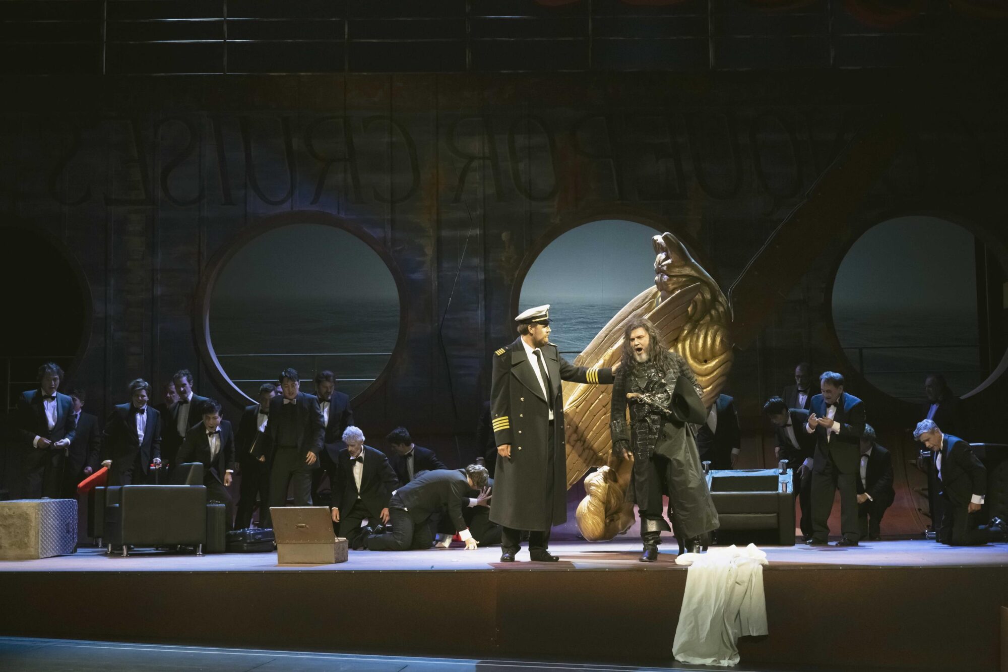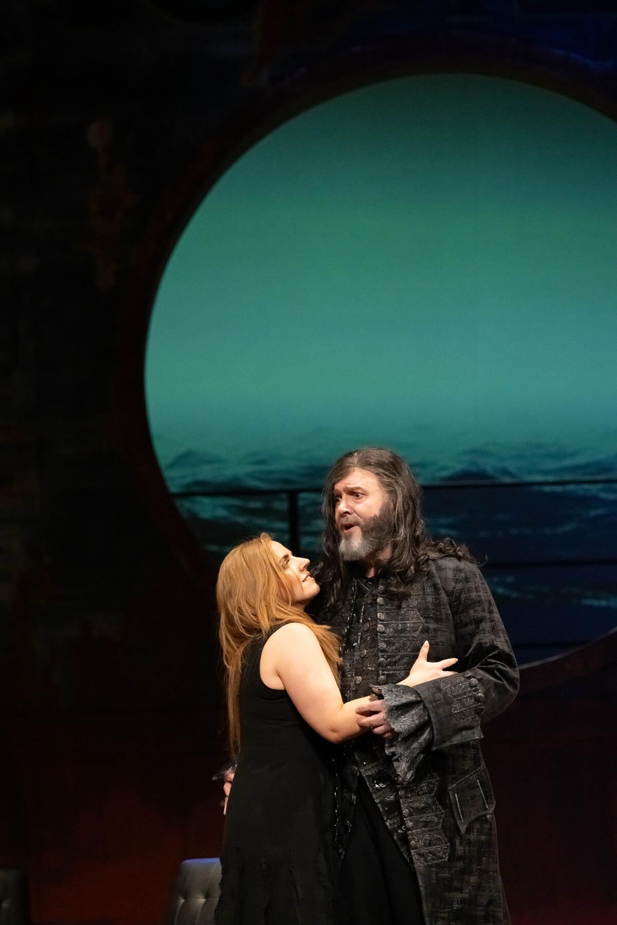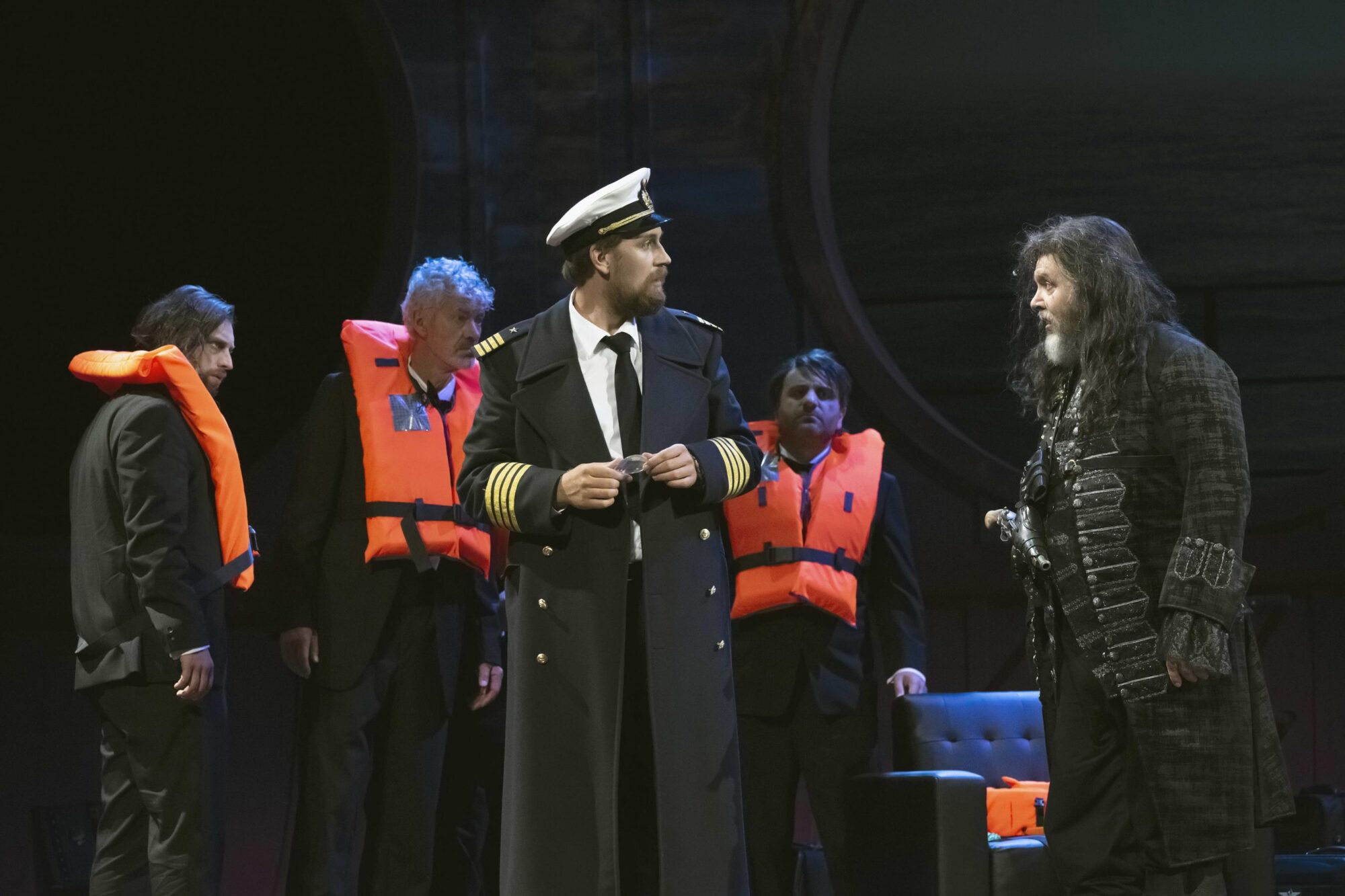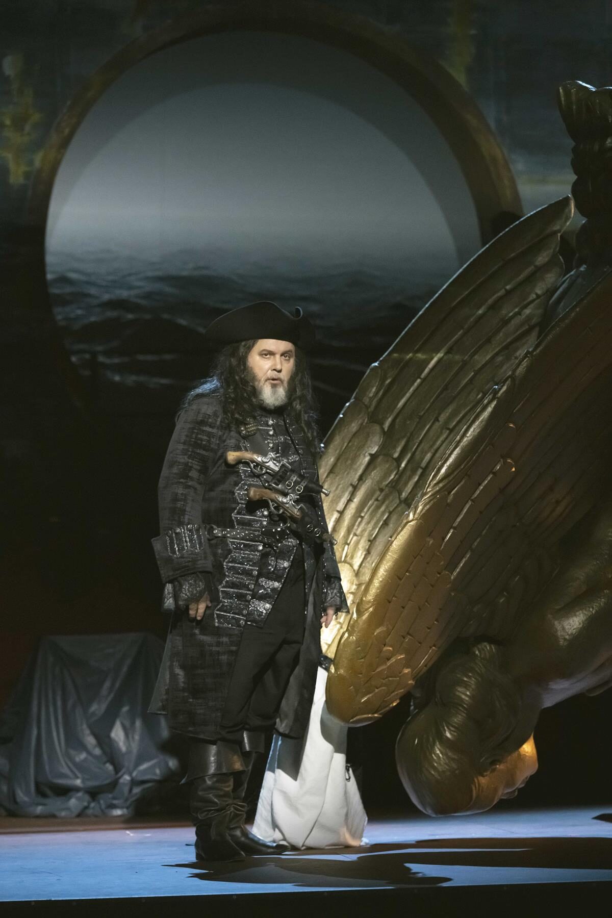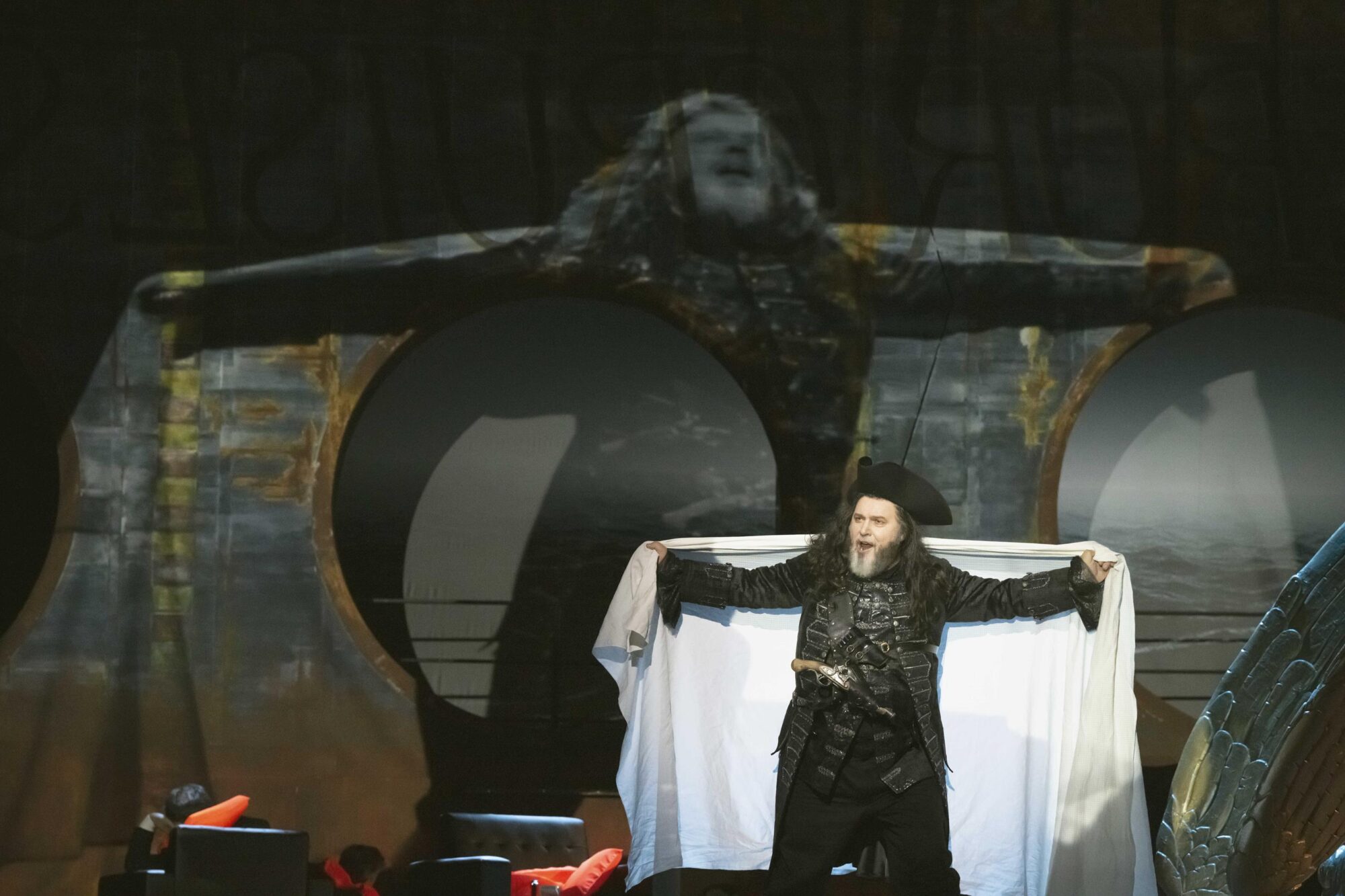 Dalands Schiff kann wetterbedingt nicht in den Hafen einlaufen. Man ankert an der Küste um besseren Wind abzuwarten, im Hintergrund tobt die See. Alle gehen zur Ruhe, und auch der zur Wache eingeteilte Steuermann (der junge Tenor Woongyi Lee) verschläft die Ankunft eines fremden Schiffs, dessen goldene Gallionsfigur plötzlich in die Bühne ragt. Da kommt ein Mann auf die Bühne: Dreispitz und schwarzer Gehrock wie aus „Fluch der Karibik“, lange Haare, dicker Bart. „Die Frist ist um…“ singt Oliver Zwarg,– es ist der fliegende Holländer, den Senta aus der Sage kennt. Kapitän Daland, der junge Bass Matthias Wippich, macht dessen Bekanntschaft. Nachdem er zunächst zögert wird er mit ihm sehr schnell einig, dass Senta seine Frau werden soll, weil der Holländer ihm eine Kiste mit Schätzen „für das Obdach einer einz´gen Nacht“ anbietet.
