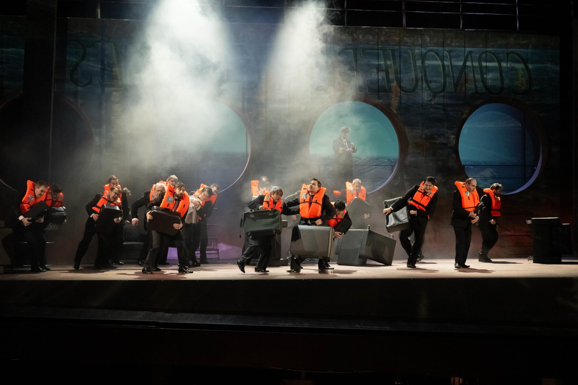 Das Wasser ist allgegenwärtig: In kräuselnden Wellen türmt es sich während der Ouvertüre auf der transparenten Projektionsfläche. Später schwappt es bedrohlich an die Bullaugen des Schiffs „Conquerer Cruises“, auf dessen Deck und Unterdeck das Geschehen abläuft, dann wieder glitzert es als spiegelnde Fläche friedlich im Mondlicht. Wasser ist das Element des fliegenden Holländers, jenes Kapitäns, der bei dem Versuch, das Kap der Guten Hoffnungg zu umsegeln, Gott lästerte, und daraufhin mitsamt seiner Mannschaft dazu verdammt wurde, ruhelos auf den Weltmeeren umherzuirren.