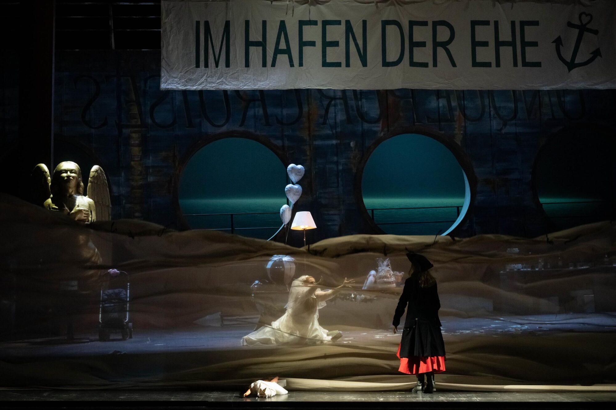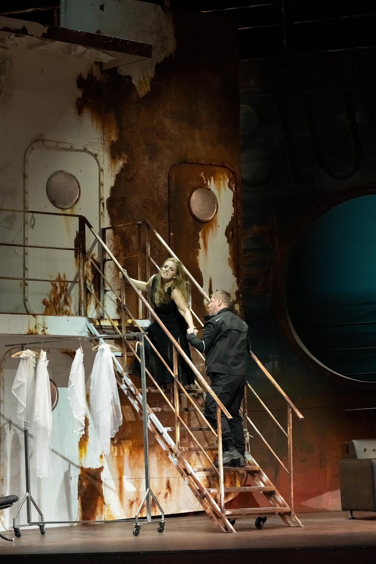 Man ahnt es schon: Die eigensinnige Piraten-Lady und der geisterhafte Seemann, sie kommen nicht zusammen, nicht einmal im tragischen Opfertod der Senta, der hier ausfällt. Denn Hovenbitzer lässt den Holländer in Lichtgeschwindigkeit verspießern, den Hochzeitssekt runterstürzen, bevor Senta ihm den Schleier vor die Füße knüllt. Weder des Seemanns Entwicklung, noch Sentas Rückbesinnung auf ihre Freiheit sind von Wagners Musik gedeckt, zumal mit diesem Schluss die Fallhöhe einkassiert wird.