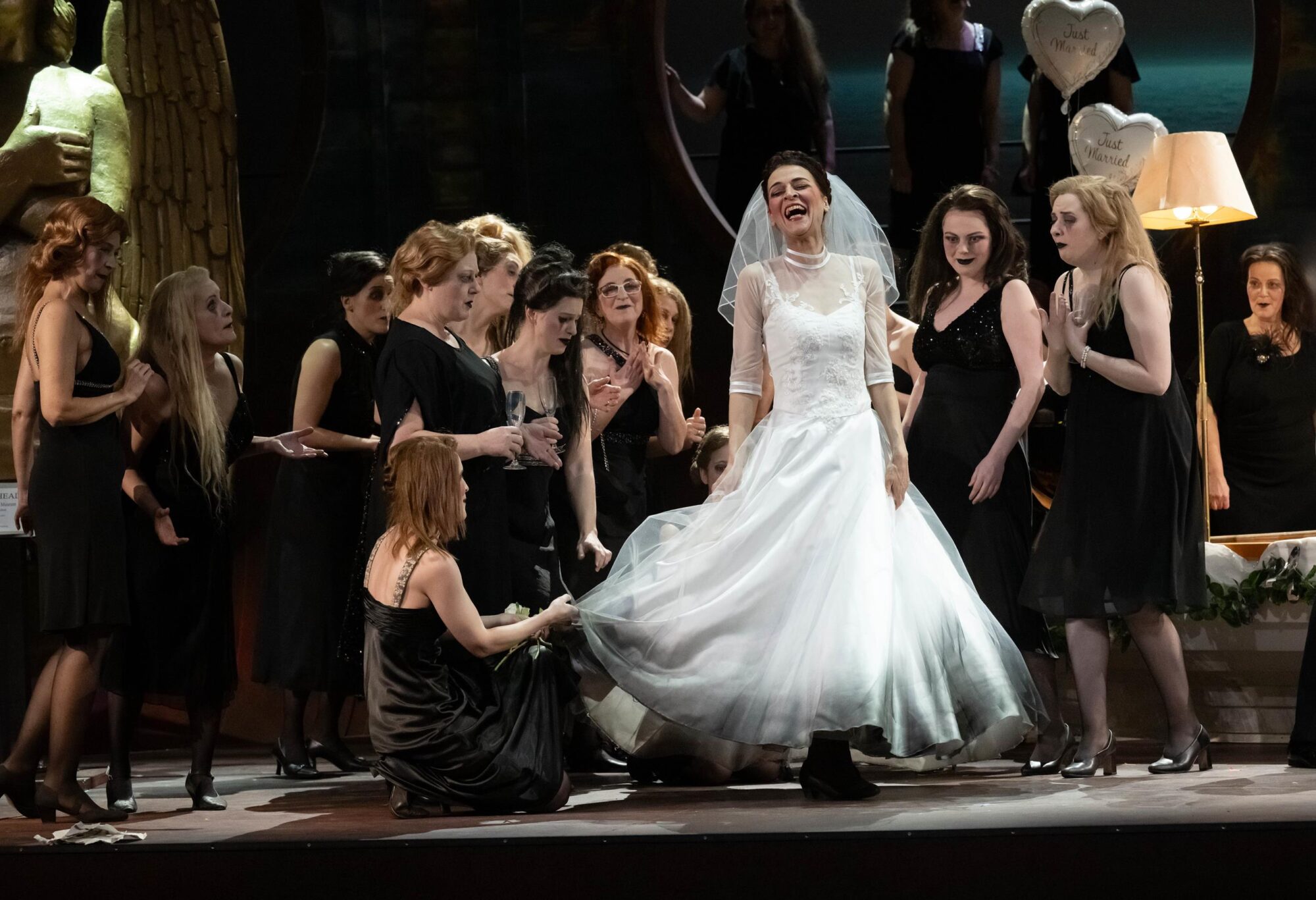 Neben dem Opernchor unseres Theaters wurde die feiernde Hochzeitsgesellschaft um Extra-ChoristInnen ergänzt. Ein 90-sekündiger Kostümwechsel hinter der Bühne hält Chor und Kostümabteilung auch noch am Ende der Oper auf Trab!