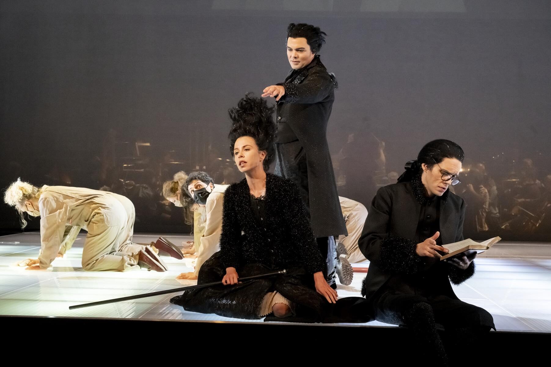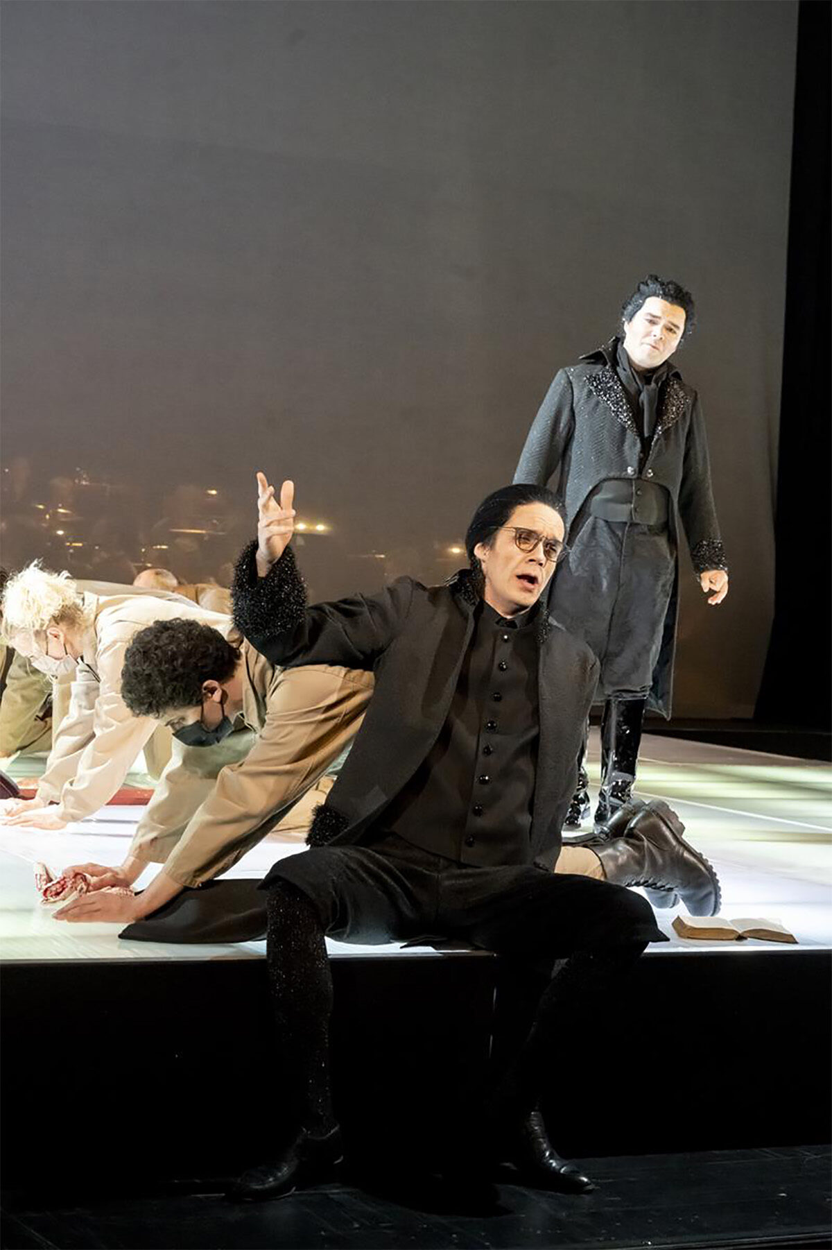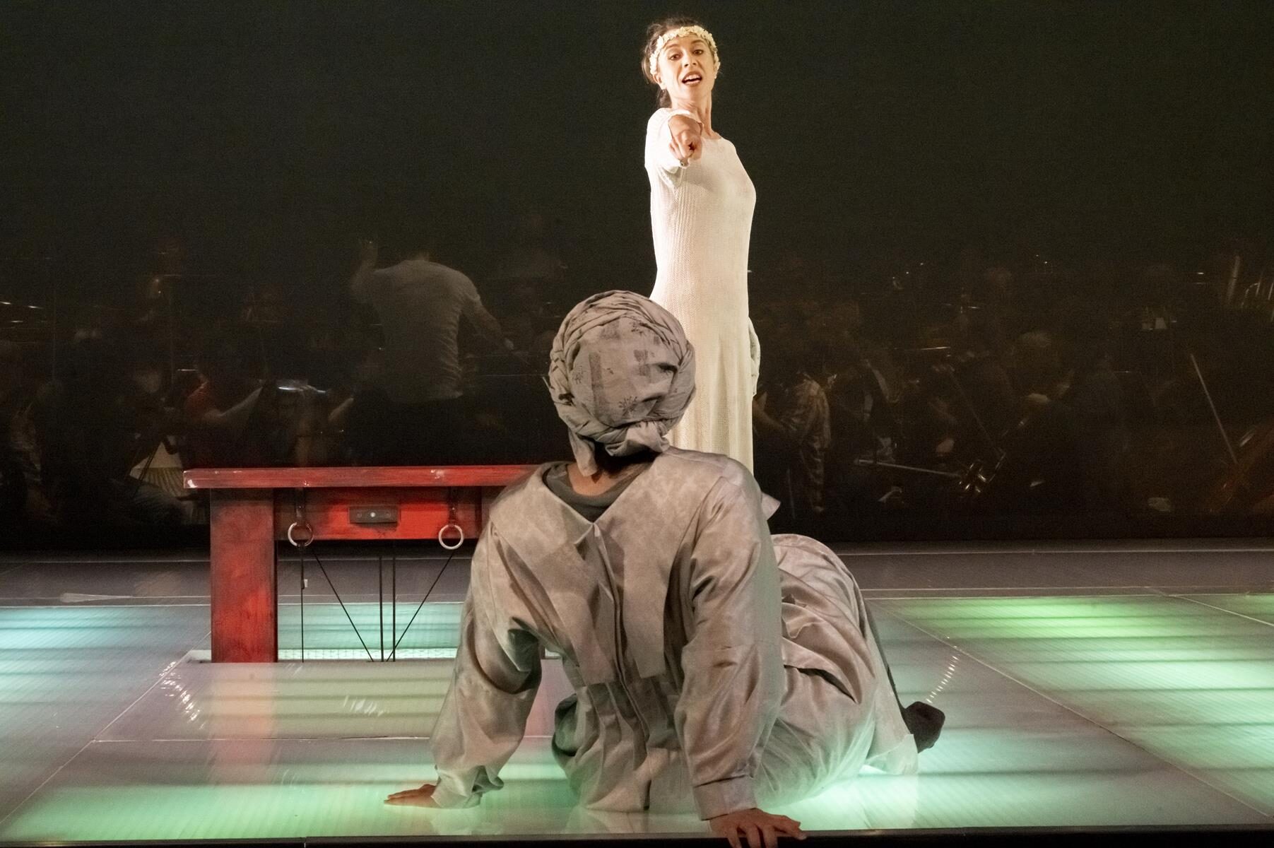 (…) Das Orchester leitet Mihkel Kütson hinter einem Gazeschleier sichtbar auf der Hinterbühne. Der Orchestergraben ist geschlossen, dadurch rückt das körperbetonte Spiel der Solisten nah ans Publikum, gewinnt so an Intensität.