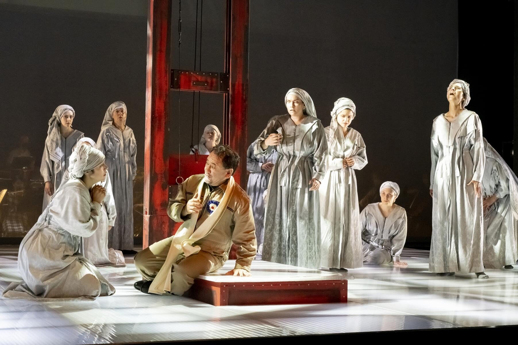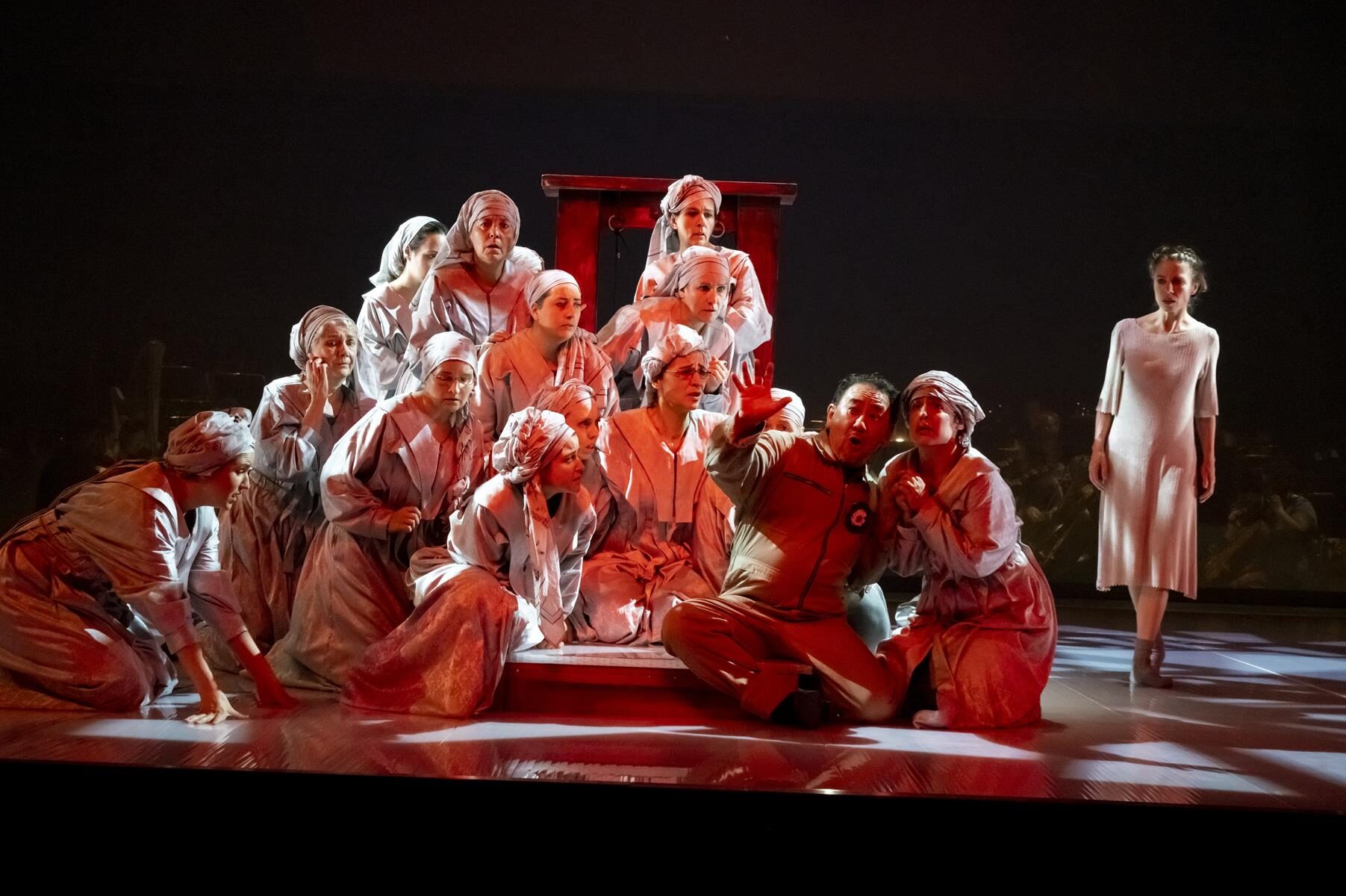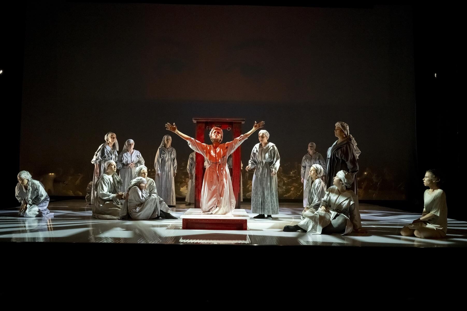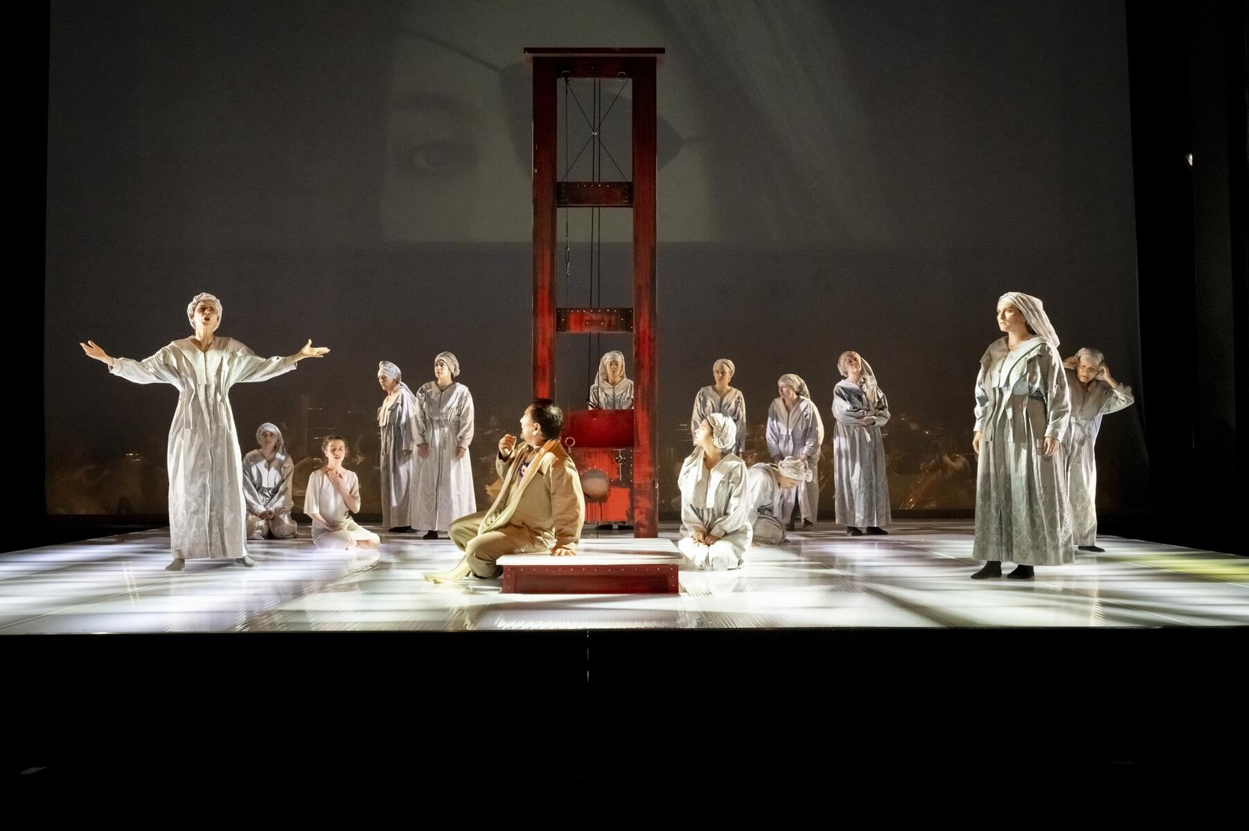 Im Vergleich zur ursprünglichen Inszenierung wurden nur Kleinigkeiten angepasst. So wurde beispielsweise der direkte Bezug zu sechzehn Frauen, die im Verlauf der Geschichte von 1660 bis 2014 bereit waren, für ihre Überzeugung in den Tod zu gehen gestrichen. Ihre Lebensgeschichten sind auch nicht mehr vor der Vorstellung im Foyer nachzulesen. Entsprechend sind auch die in der Inszenierung vorkommenden Flugblätter nun mit einem neuen Text versehen, auf dem allgemein gefragt wird, wer überhaupt bestimmt, wer eine Märtyrerin ist. Dies sind aber nur Kleinigkeiten, die der Produktion schlussendlich sogar gut tun, da sie sich nun noch stärker auf den Karmeliter-Orden und die historischen Hintergründe fokussiert. Den Geschwistern Rebecca und Beverly Blankenship war in ihrer Inszenierung sehr daran gelegen, das Publikum ganz tief in diesen Abend „hineinzuziehen“ und so für eine noch stärkere Intensität zu sorgen. Dies gelingt sehr gut, auch durch das Bespielen der vorderen Bühne, ein Bereich der bei Operninszenierungen in der Regel für den Orchestergraben geblockt ist. Das Orchester in großer Besetzung im hinteren Bereich der Bühne untergebracht und durch einen nur leicht durchsichtigen Vorhang von den Darstellern getrennt. Auf diese Weise ist der Zuschauer noch näher am Geschehen. Verstärkt wird dieser Effekt durch Chorgesänge vom Rang. Allgemein finden die beiden Regisseurinnen immer wieder starke Bilder, die fast komplett ohne Requisiten auskommen. Bühnenbildner Christian Floeren schuf ein quadratisches Spielpodest, auf dem sich fast die gesamte Handlung abspielt und auf dem Akt für Akt eine Guillotine aus dem Boden emporsteigt. Einige Projektionen runden das schlichte, aber sehr intensive Gesamtbild ab.