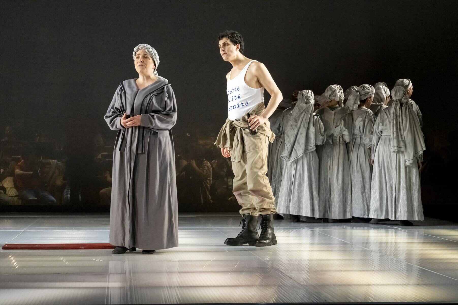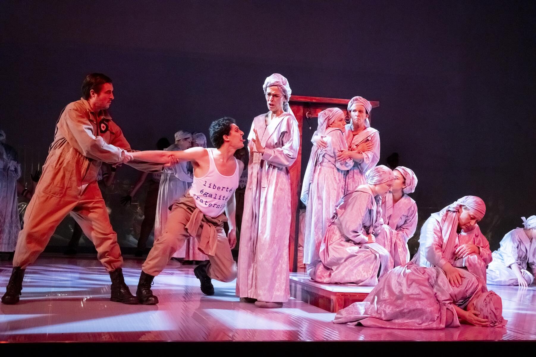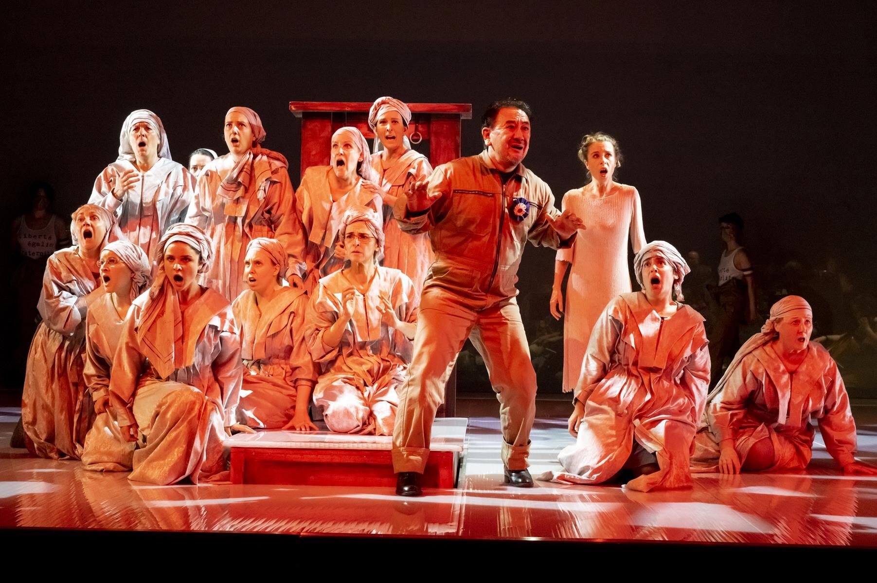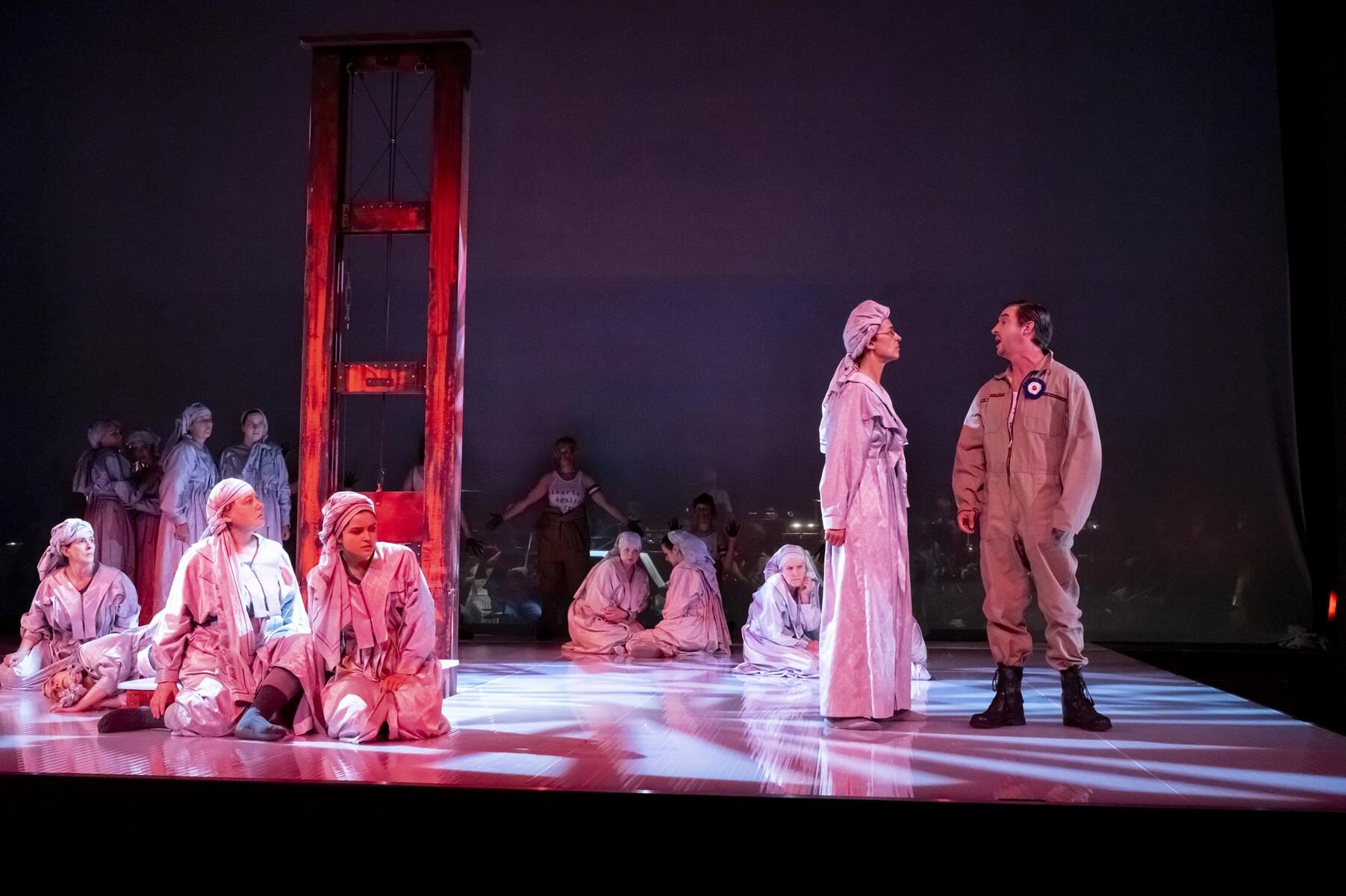 Im Vergleich zur ursprünglichen Inszenierung wurden nur Kleinigkeiten angepasst. So wurde beispielsweise der direkte Bezug zu sechzehn Frauen, die im Verlauf der Geschichte von 1660 bis 2014 bereit waren, für ihre Überzeugung in den Tod zu gehen gestrichen. Ihre Lebensgeschichten sind auch nicht mehr vor der Vorstellung im Foyer nachzulesen. Entsprechend sind auch die in der Inszenierung vorkommenden Flugblätter nun mit einem neuen Text versehen, auf dem allgemein gefragt wird, wer überhaupt bestimmt, wer eine Märtyrerin ist. Dies sind aber nur Kleinigkeiten, die der Produktion schlussendlich sogar gut tun, da sie sich nun noch stärker auf den Karmeliter-Orden und die historischen Hintergründe fokussiert. Den Geschwistern Rebecca und Beverly Blankenship war in ihrer Inszenierung sehr daran gelegen, das Publikum ganz tief in diesen Abend „hineinzuziehen“ und so für eine noch stärkere Intensität zu sorgen. Dies gelingt sehr gut, auch durch das Bespielen der vorderen Bühne, ein Bereich der bei Operninszenierungen in der Regel für den Orchestergraben geblockt ist. Das Orchester in großer Besetzung im hinteren Bereich der Bühne untergebracht und durch einen nur leicht durchsichtigen Vorhang von den Darstellern getrennt. Auf diese Weise ist der Zuschauer noch näher am Geschehen. Verstärkt wird dieser Effekt durch Chorgesänge vom Rang. Allgemein finden die beiden Regisseurinnen immer wieder starke Bilder, die fast komplett ohne Requisiten auskommen. Bühnenbildner Christian Floeren schuf ein quadratisches Spielpodest, auf dem sich fast die gesamte Handlung abspielt und auf dem Akt für Akt eine Guillotine aus dem Boden emporsteigt. Einige Projektionen runden das schlichte, aber sehr intensive Gesamtbild ab.