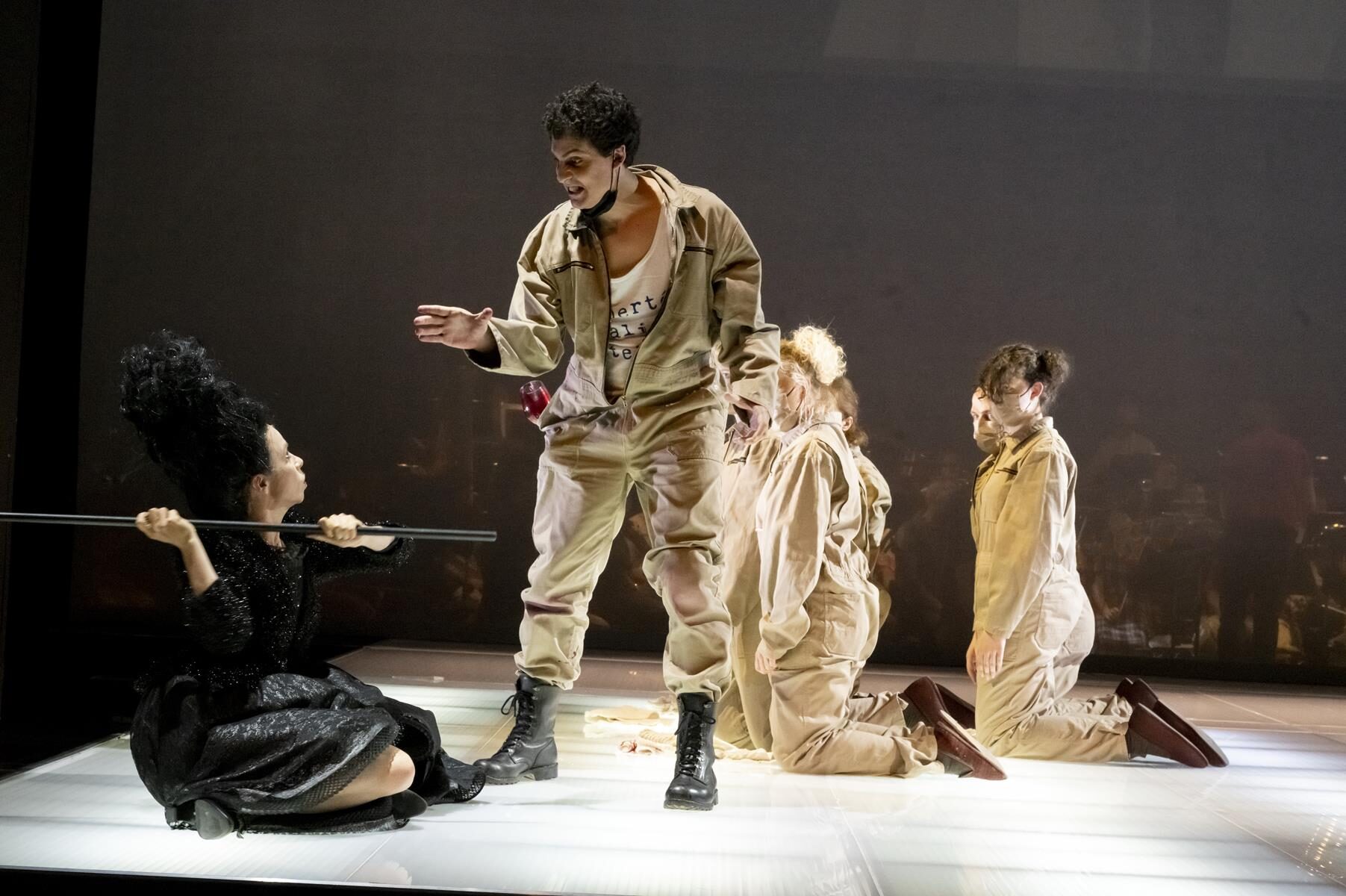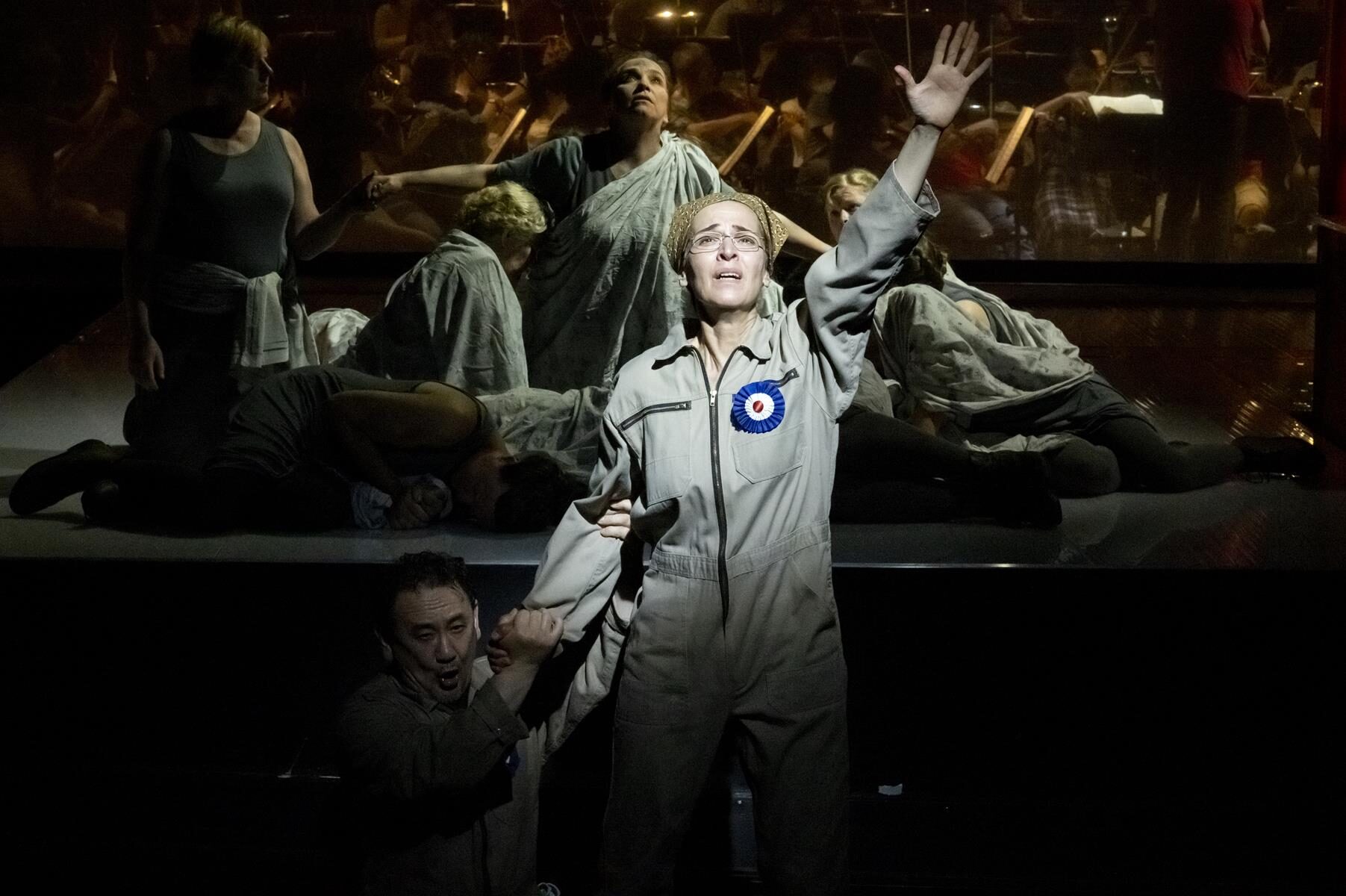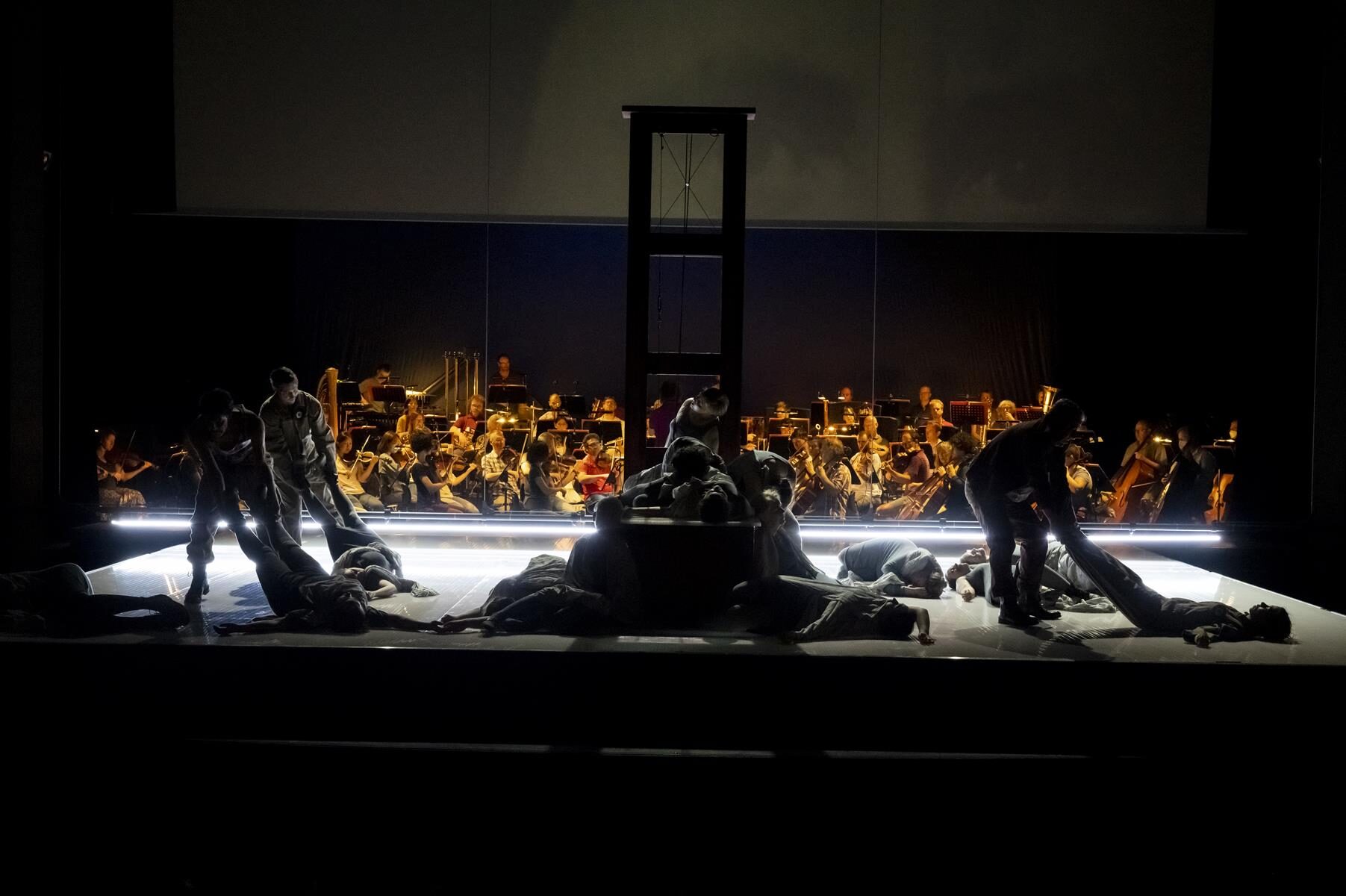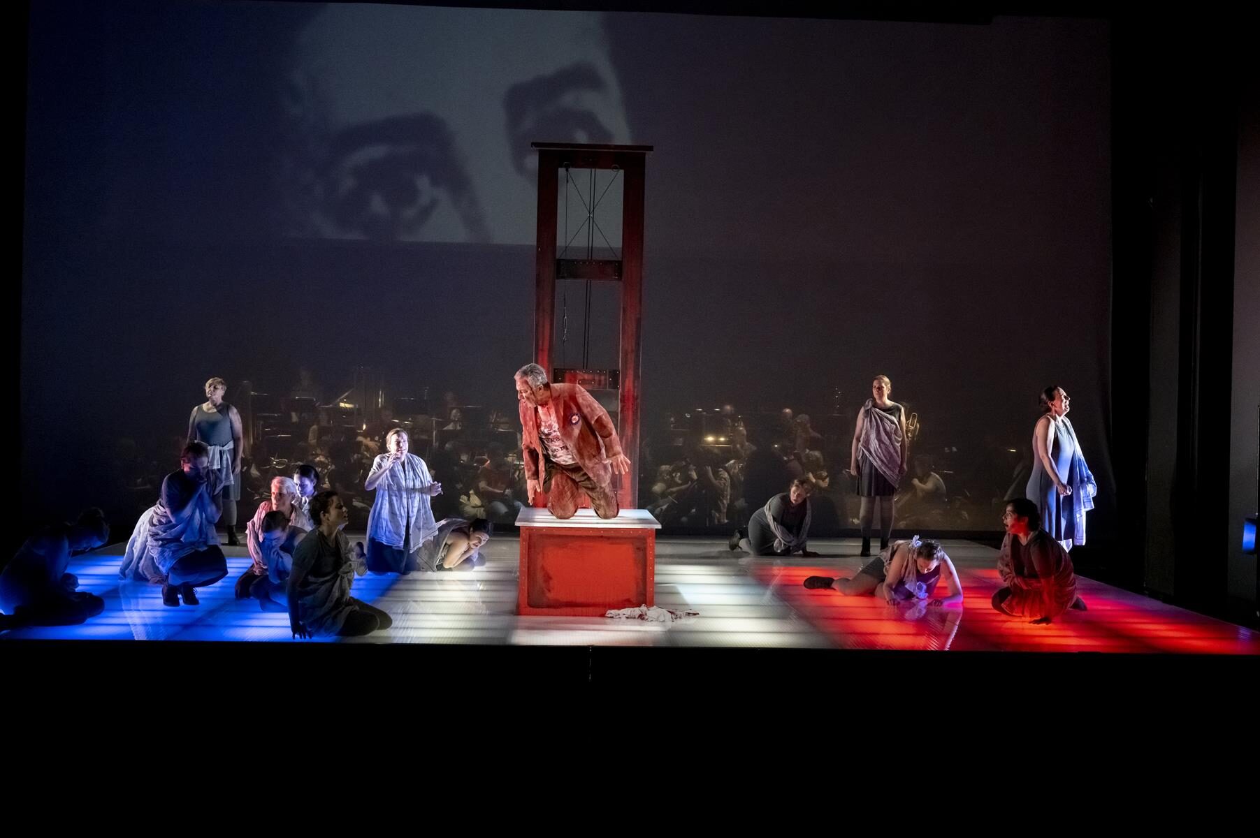 Im Vergleich zur ursprünglichen Inszenierung wurden nur Kleinigkeiten angepasst. So wurde beispielsweise der direkte Bezug zu sechzehn Frauen, die im Verlauf der Geschichte von 1660 bis 2014 bereit waren, für ihre Überzeugung in den Tod zu gehen gestrichen. Ihre Lebensgeschichten sind auch nicht mehr vor der Vorstellung im Foyer nachzulesen. Entsprechend sind auch die in der Inszenierung vorkommenden Flugblätter nun mit einem neuen Text versehen, auf dem allgemein gefragt wird, wer überhaupt bestimmt, wer eine Märtyrerin ist. Dies sind aber nur Kleinigkeiten, die der Produktion schlussendlich sogar gut tun, da sie sich nun noch stärker auf den Karmeliter-Orden und die historischen Hintergründe fokussiert. Den Geschwistern Rebecca und Beverly Blankenship war in ihrer Inszenierung sehr daran gelegen, das Publikum ganz tief in diesen Abend „hineinzuziehen“ und so für eine noch stärkere Intensität zu sorgen. Dies gelingt sehr gut, auch durch das Bespielen der vorderen Bühne, ein Bereich der bei Operninszenierungen in der Regel für den Orchestergraben geblockt ist. Das Orchester in großer Besetzung im hinteren Bereich der Bühne untergebracht und durch einen nur leicht durchsichtigen Vorhang von den Darstellern getrennt. Auf diese Weise ist der Zuschauer noch näher am Geschehen. Verstärkt wird dieser Effekt durch Chorgesänge vom Rang. Allgemein finden die beiden Regisseurinnen immer wieder starke Bilder, die fast komplett ohne Requisiten auskommen. Bühnenbildner Christian Floeren schuf ein quadratisches Spielpodest, auf dem sich fast die gesamte Handlung abspielt und auf dem Akt für Akt eine Guillotine aus dem Boden emporsteigt. Einige Projektionen runden das schlichte, aber sehr intensive Gesamtbild ab.