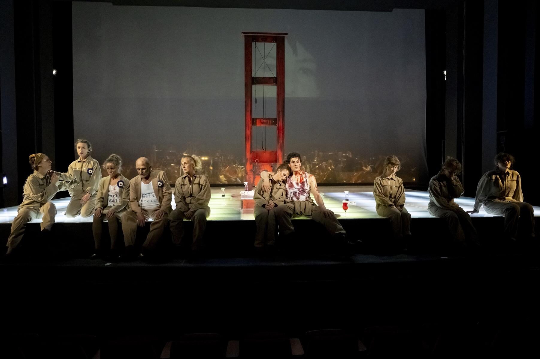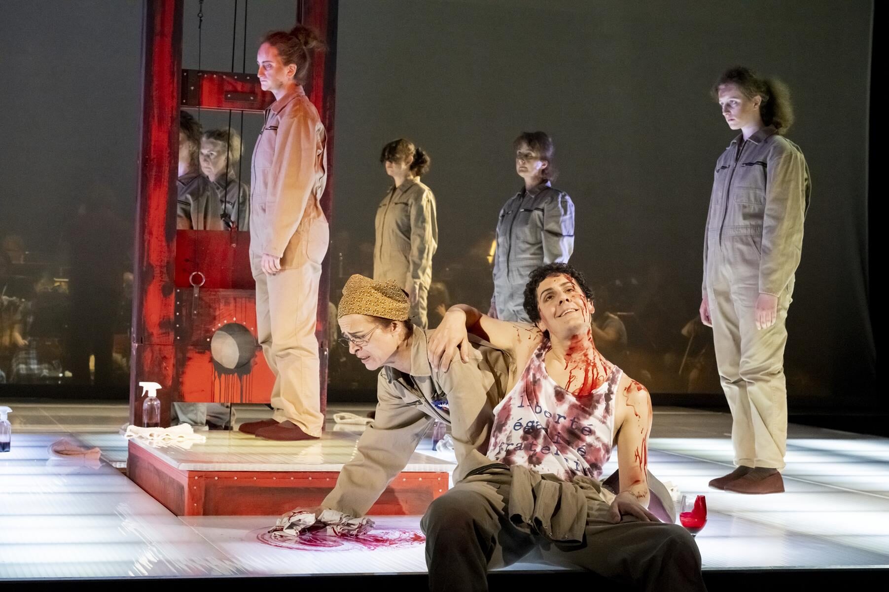 Die Bühne weist als einziges Accessoire eine Guillotine auf, die nach und nach zentral aus dem Boden wächst. Blutrot wie die T-Shirts der Revoluzzer plakatiert sie die politischen Umstände. Die Regie kann zeigen, dass Unterdrückung sowohl ein Attribut der Feudalen wie auch der Freiheit-Gleichheit-Brüderlichkeit-Schreier ist. Dazu wird eine Putzkolonne aus Statisten aufgeboten. Gesungen und gespielt wird in Mönchengladbach auf hohem Niveau. Sophie Witte ist eine zarte, verletzliche Blanche. Maya Blaustein gewinnt der Partie der Constance eine grandiose Fülle an Schattierungen ab. Rafael Bruck beeindruckt als Marquis. Zum bemerkenswert homogenen Chor der Schwestern fügen sich Männer- und Frauenchöre, die von der Empore das Volk verkörpern. Ziel und Höhepunkt der Oper ist das finale “Salve regina”, die Hinrichtung sämtlicher Nonnen, zu der Poulenc eine unglaubliche Musik komponierte, in der ein Holzklotz das Niedersausen des Fallbeils gespenstisch echt klangmalt. Der Gesang der Frauen erstirbt mit jedem Schlag ein Stück bis am Ende Blanche, die Hauptperson, sich dem Tod ergibt.