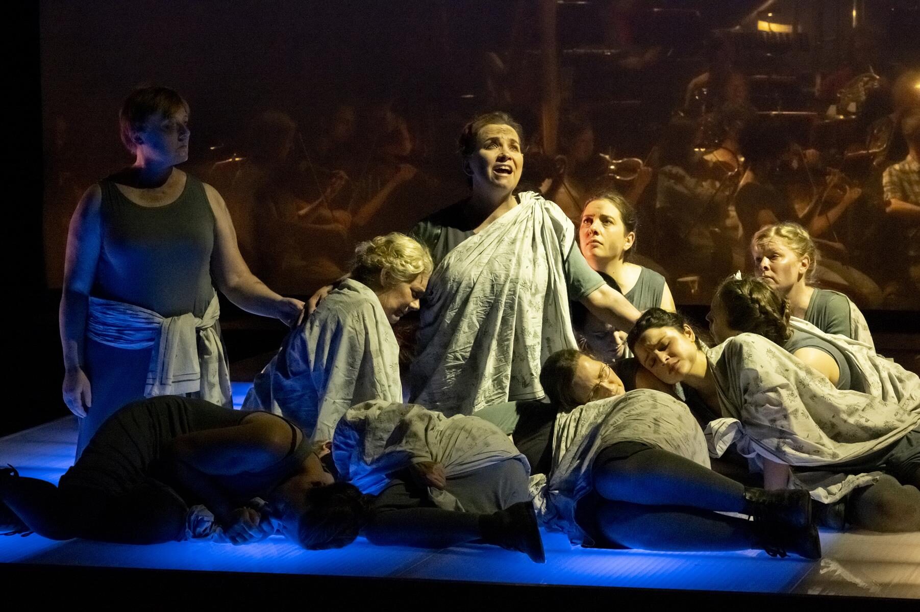 Mit ihren Leibern stützen die Nonnen ihre todkranke Priorin. Der Gastsängerin Rebecca Blankenship in seltener Personalunion mit der zweiten Regisseurin der Oper, gelingt es, die gegen das Sterben aufbegehrende Leiterin des Konvents auch stimmlich in ihrem Zwiespalt zwischen bedauernswerter Hinfälligkeit und energisch beanspruchter Richtlinienkompetenz überzeugend darzustellen. Neben dem lyrischen Sopran Sophie Witte, die ihre Blanche mit souverän gebändigter Verve sich apart aussingen lässt, besticht Maya Blaustein als lebensfrohe Novizin Constance mit dramatischer Impulsivität im Spiel und gut tragfähigem, gern auch exaltiertem Stimmprofil. Stefanie Kunschke und Eva Maria Günschmann gefallen in ihren Rollen als neue Priorin bzw. Novizenmeisterin. Als Mutter Marie verkörpert Günschmann die wichtigste Blutzeugin des Geschehens, das sie als einzige Überlebende später in ihrem Tagebuch anvertrauen wird. Ihr haben wir es zu verdanken, dass es diese Oper gibt – und wir nun diese großartige Aufführung mit Ovationen feiern durften.