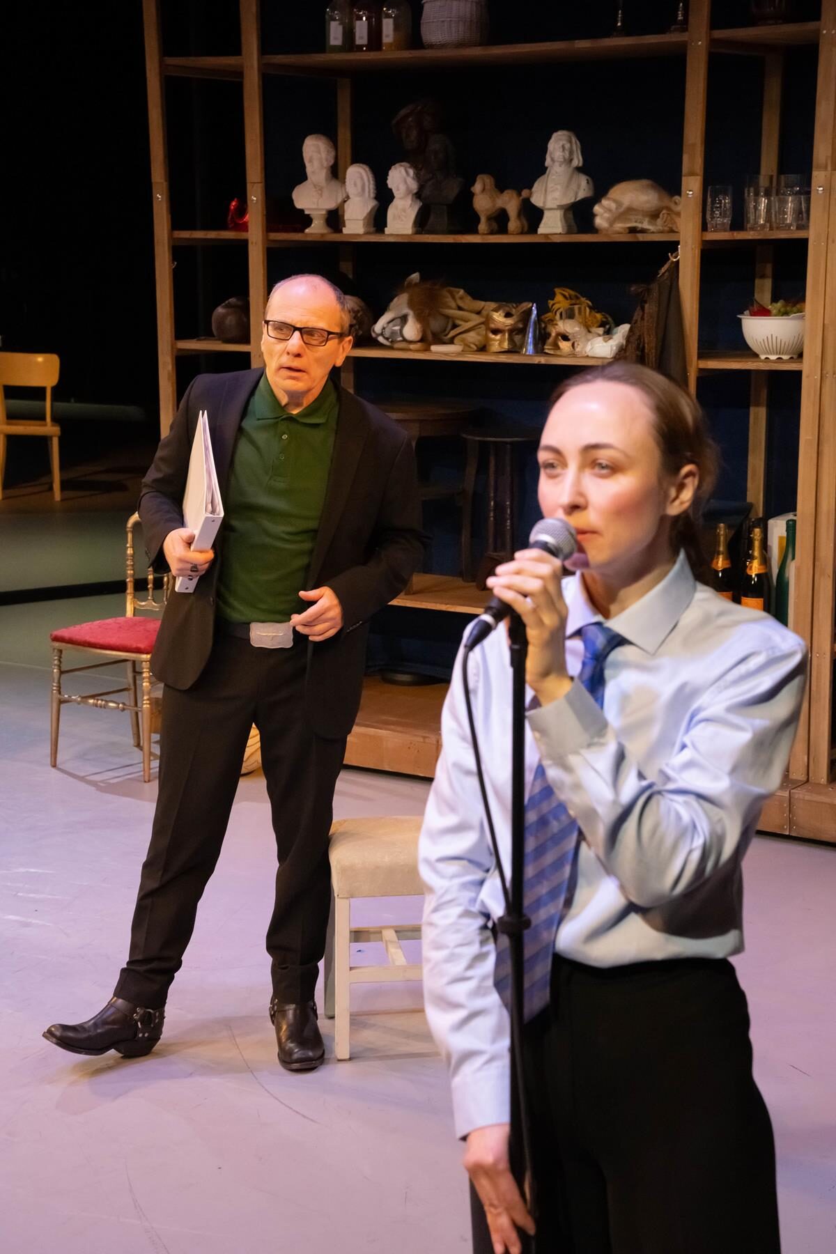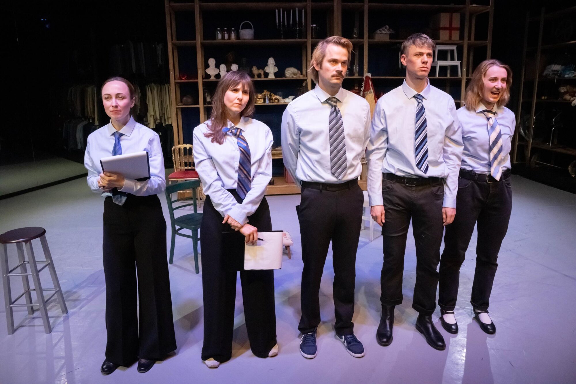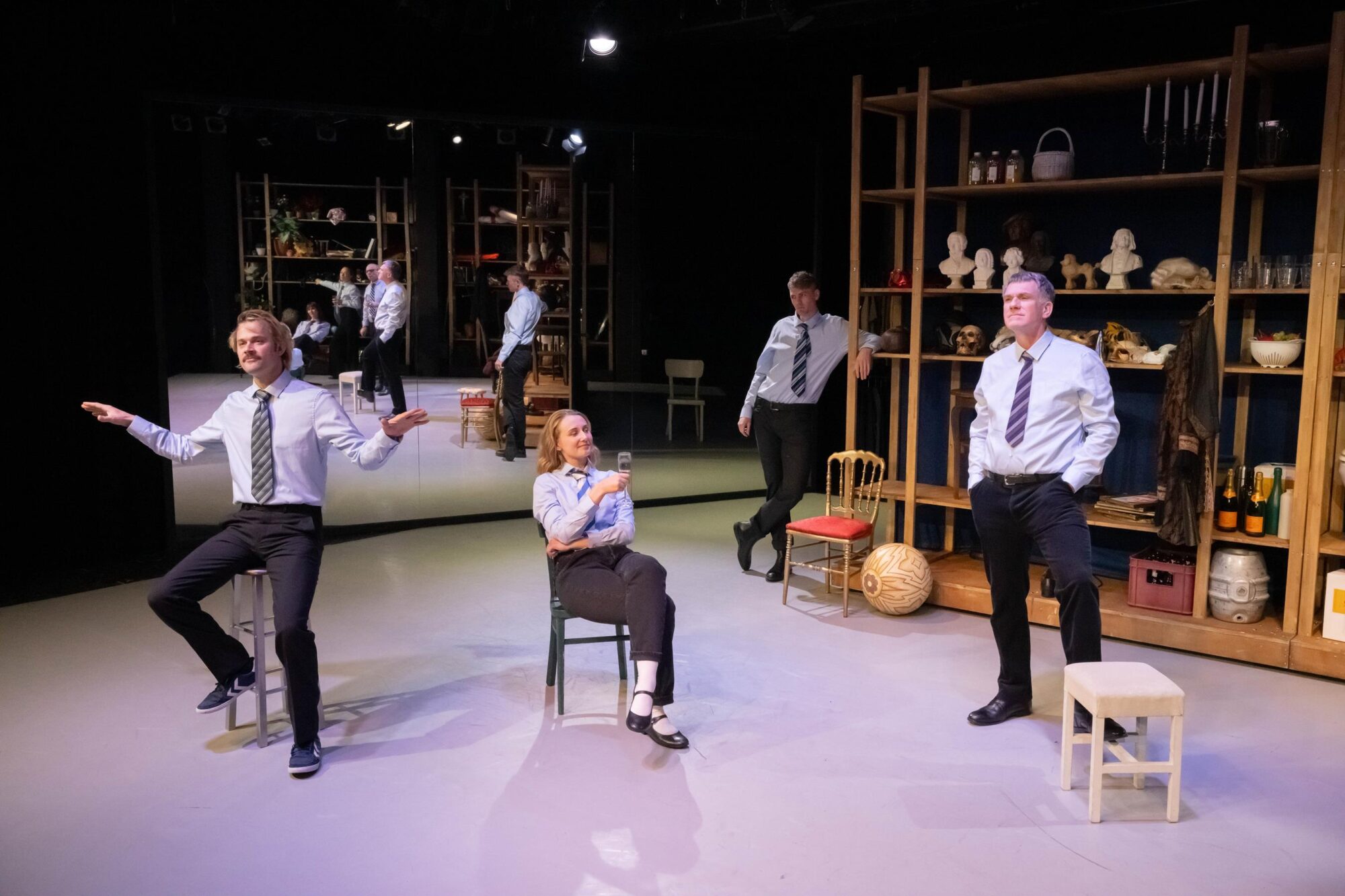 “„Übernahme“ wurde wie das letztjährige Projekt „Die Insekten“ vom Schauspielensemble selbst entwickelt. Clemens Bechtels auf der Studiobühne vielschichtig und packend gestaltete Inszenierung lässt das Publikum aufgewühlt und nachdenklich zurück. Die Handlung ist eingebettet in die Theaterwelt hinter den Kulissen. Hier treffen sich Schauspielerinnen und Schauspieler mit dem Intendanten. Hier lassen sie das Rollenspiel nachwirken, demaskieren sich, lassen die Gesichter hinter der Rolle sichtbar werden. In das kreative Refugium dringt die Ministerin einer rechtsgerichteten Partei ein, intellektuell gewappnet mit den kulturellen Erfahrungen eines Abonnements während der Schulzeit. […] In Bechtels Inszenierung agieren die Ensemblemitglieder expressiv und wandlungsfähig. Monologe sind mitunter im Nebeneinander verdichtet, parallele Spielszenen steigern dramaturgisch die Spannung. Bruno Winzen mimt den Schauspieler auf Spurensuche in Texten sowie einen herrisch auftretenden Goebbels. Dabei legt Winzen die Grenzen zwischen der Lesung vorgefundener Texte und der Rezitation von Goebbels´ Reden zunehmend bedrohlich fließend an.”