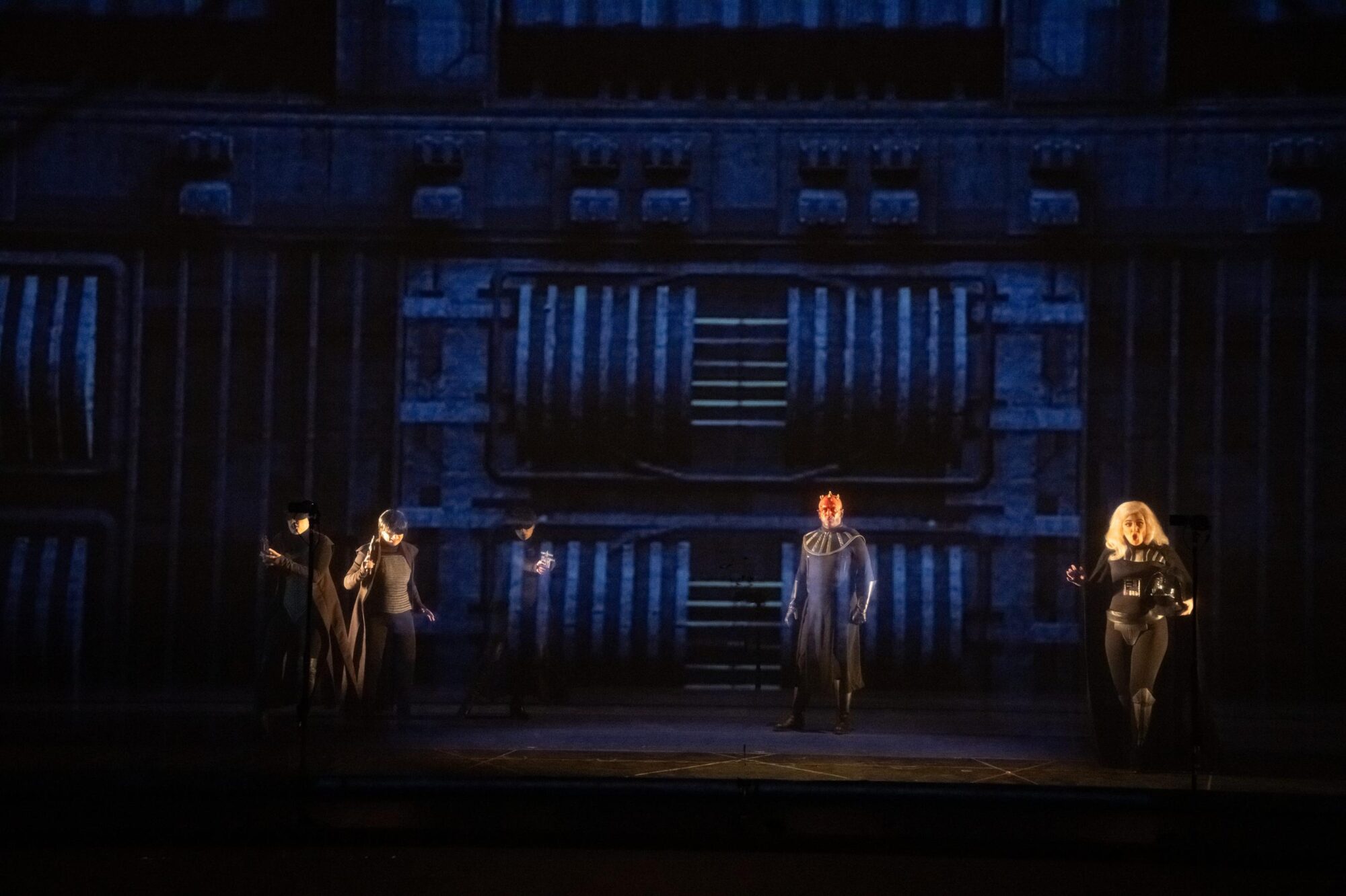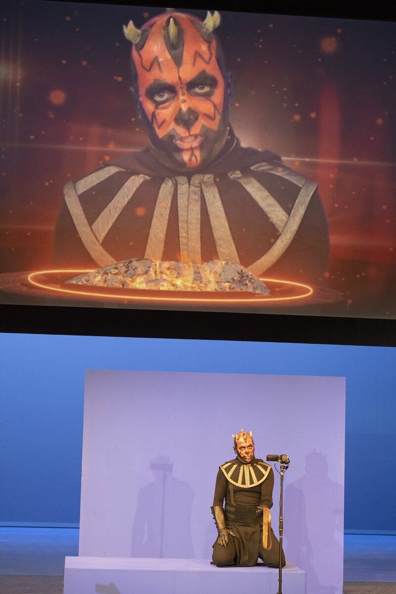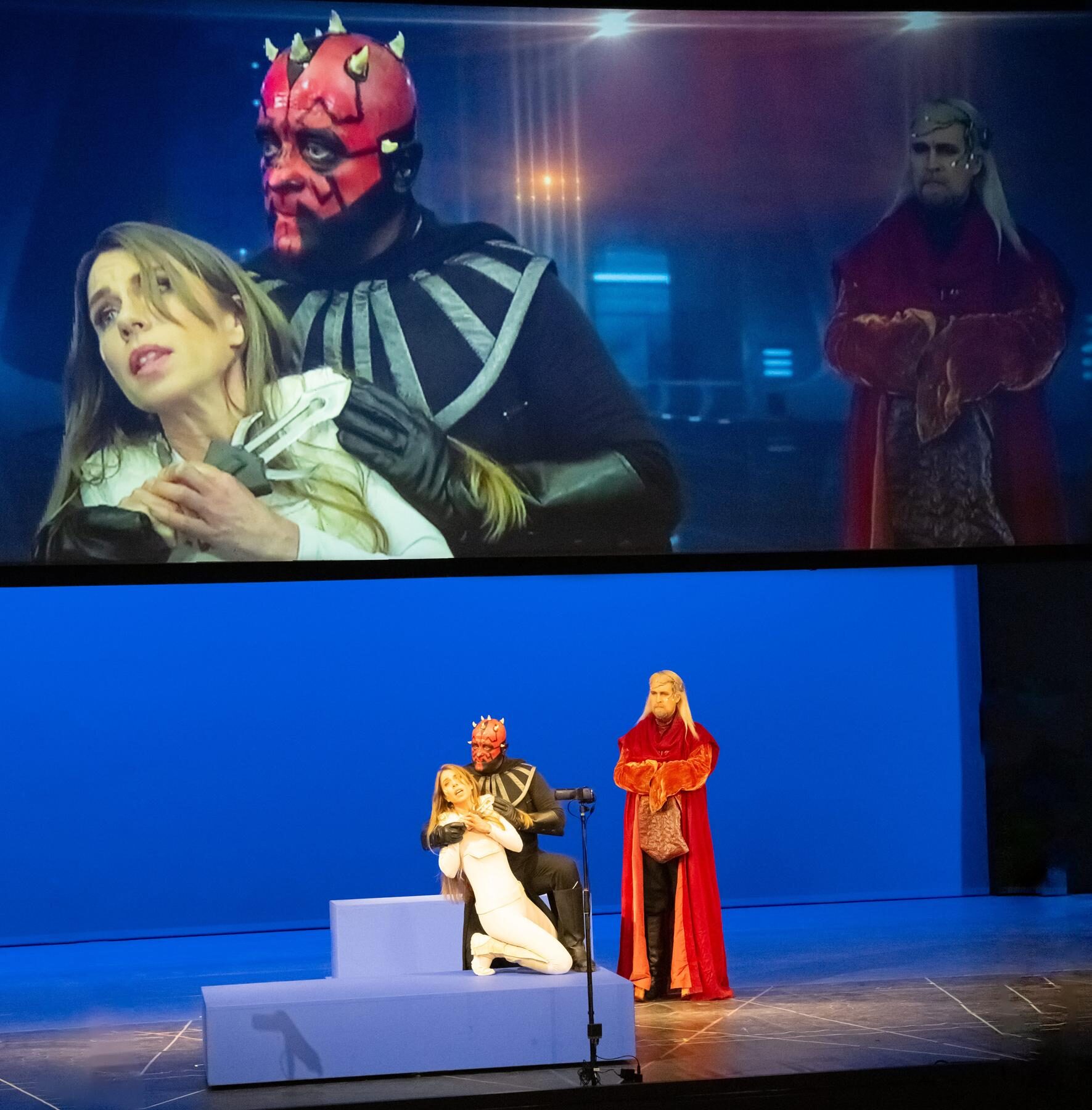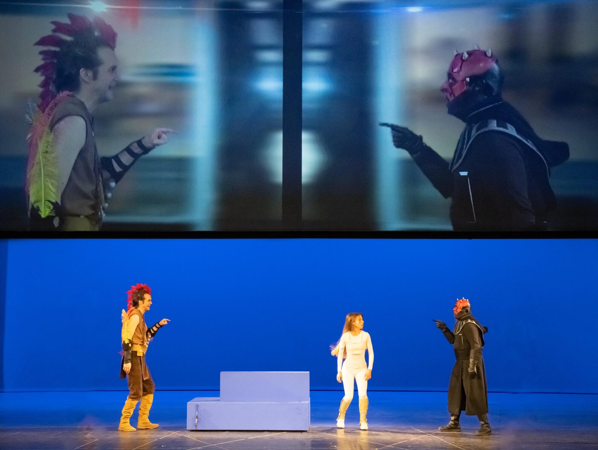 Das allgemein bestens aufgelegte Sängerensemble entzückte ebenfalls mit schönem Gespür für Mozarts Musik. Herausragend sang als Gast Sopran Sophia Theodorides eine mitreißende Königin der Nacht. Die Spitzentöne kamen klar, rein, mit durchsichtigem Glanz, und mit einer erfreulichen – indes hoch konzentrierten – Mühelosigkeit. Viel Freude bereiteten auch Sophie Witte als Pamina, – auch schauspielerisch herausragend – die drei Damen (Antonia Busse, Susanne Seefing, Bettina Schaeffer) und natürlich die entzückende Papagena Gabriela Kuhn. Ihr Papageno Rafael Bruck begeisterte gleichfalls stimmlich und mit – erfreulich nicht ordinärem – Spiel. Ob nun Woongyi Lees überaus kultivierter (ätherischer) Tamino, mit leichten Einschränkungen in der Aussprache, Matthias Wippichs warm-weicher Sarastro oder Gereon Grundmann als Sprecher (alias Spock aus Star Trek); die Sänger agierten einerseits ganz im Sinne van Rensburgs als Protagonisten seiner Space-Oper, doch zugleich als Treue „Diener“ mozartscher Musik. Ein Hingucker: Markus Heinrich als Monostatos in Darth-Maul-Kostüm. Und auch die drei Knaben (Marie Lina Hanke, Jana-Sophia Gebhardt und Luzia Ostermann) überzeugten sowohl sängerisch als auch schauspielerisch. Charmant rundeten Arthur Meunier sowie Nils Miegel als Priester das Ensemble ab.