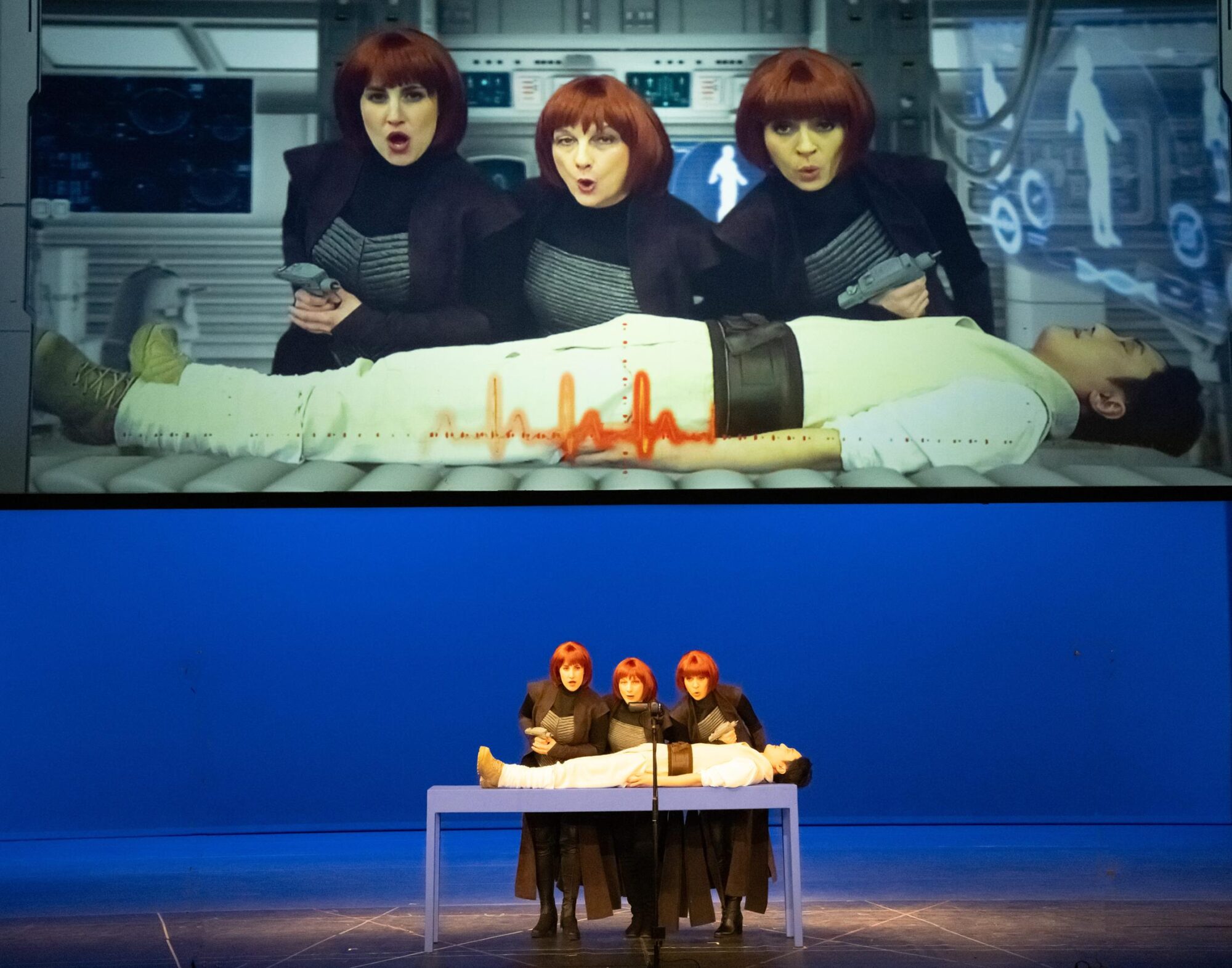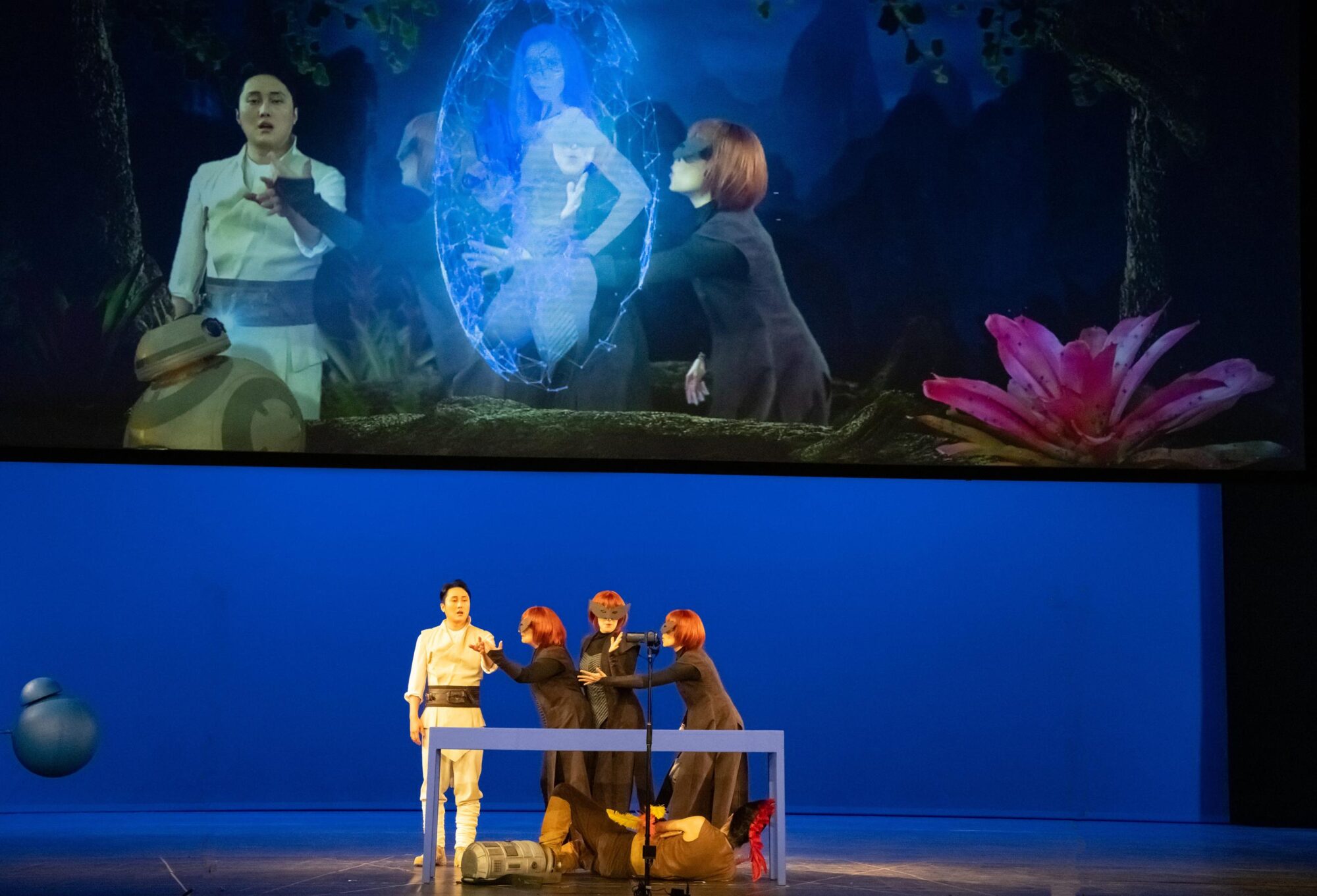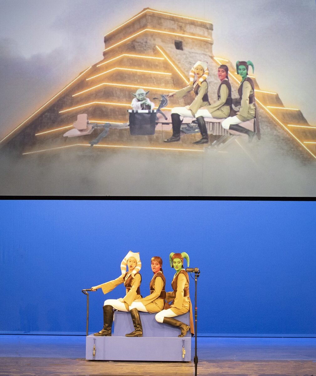 Das allgemein bestens aufgelegte Sängerensemble entzückte ebenfalls mit schönem Gespür für Mozarts Musik. Herausragend sang als Gast Sopran Sophia Theodorides eine mitreißende Königin der Nacht. Die Spitzentöne kamen klar, rein, mit durchsichtigem Glanz, und mit einer erfreulichen – indes hoch konzentrierten – Mühelosigkeit. Viel Freude bereiteten auch Sophie Witte als Pamina, – auch schauspielerisch herausragend – die drei Damen (Antonia Busse, Susanne Seefing, Bettina Schaeffer) und natürlich die entzückende Papagena Gabriela Kuhn. Ihr Papageno Rafael Bruck begeisterte gleichfalls stimmlich und mit – erfreulich nicht ordinärem – Spiel. Ob nun Woongyi Lees überaus kultivierter (ätherischer) Tamino, mit leichten Einschränkungen in der Aussprache, Matthias Wippichs warm-weicher Sarastro oder Gereon Grundmann als Sprecher (alias Spock aus Star Trek); die Sänger agierten einerseits ganz im Sinne van Rensburgs als Protagonisten seiner Space-Oper, doch zugleich als Treue „Diener“ mozartscher Musik. Ein Hingucker: Markus Heinrich als Monostatos in Darth-Maul-Kostüm. Und auch die drei Knaben (Marie Lina Hanke, Jana-Sophia Gebhardt und Luzia Ostermann) überzeugten sowohl sängerisch als auch schauspielerisch. Charmant rundeten Arthur Meunier sowie Nils Miegel als Priester das Ensemble ab.