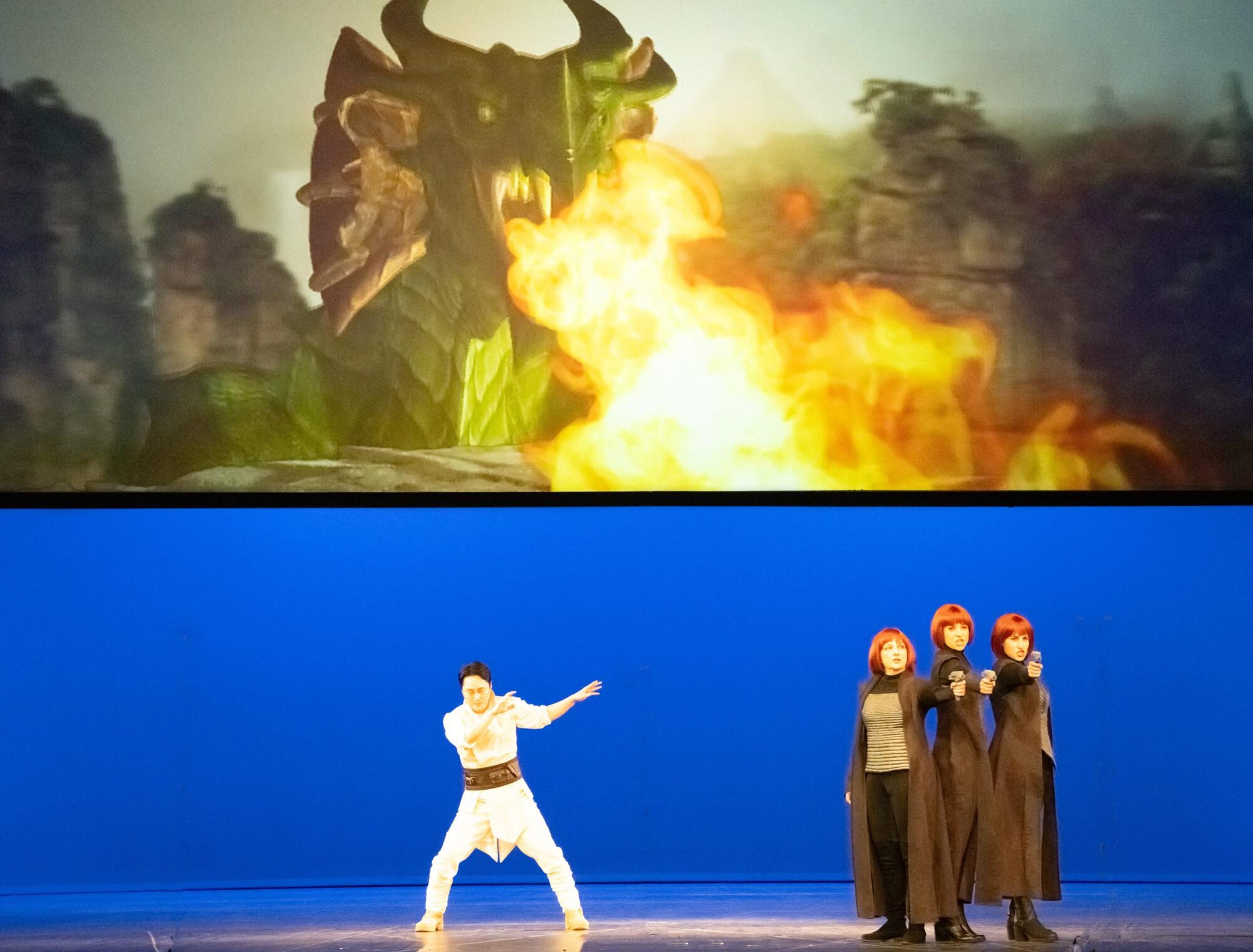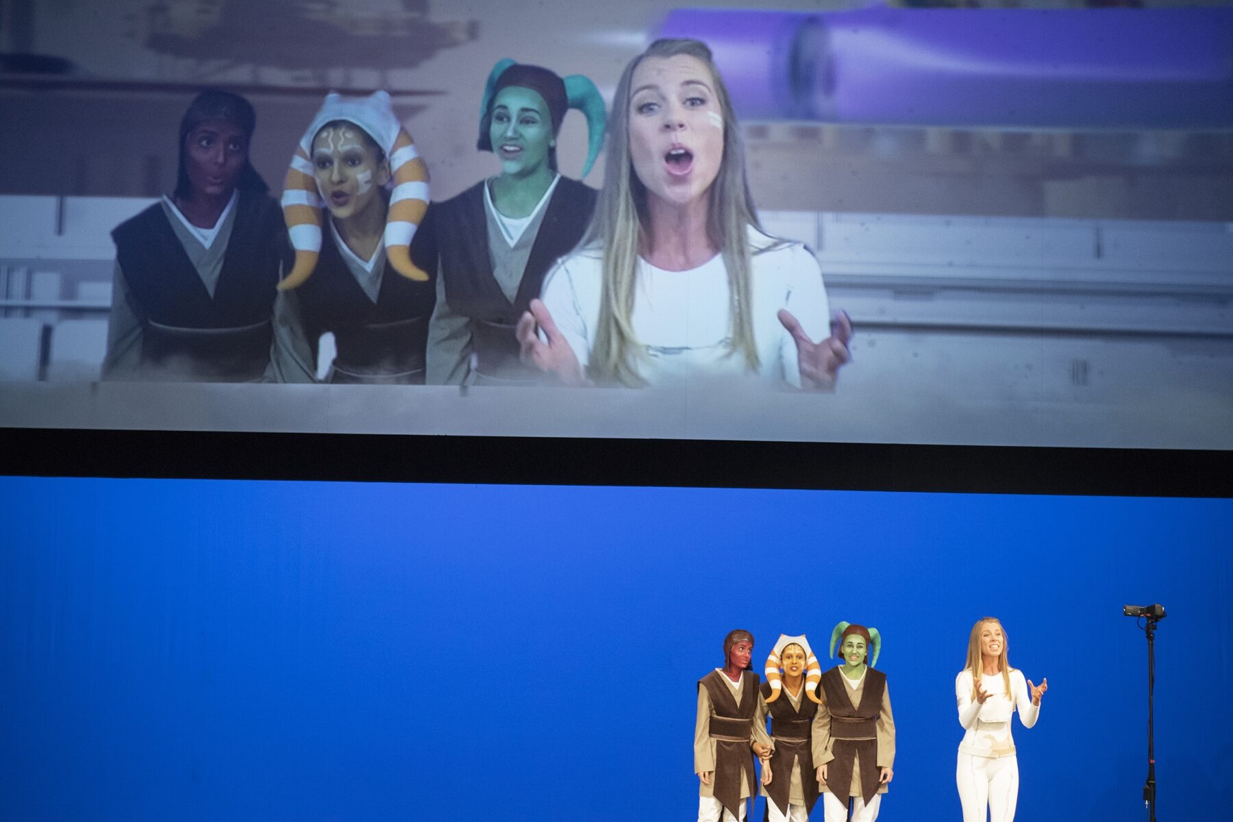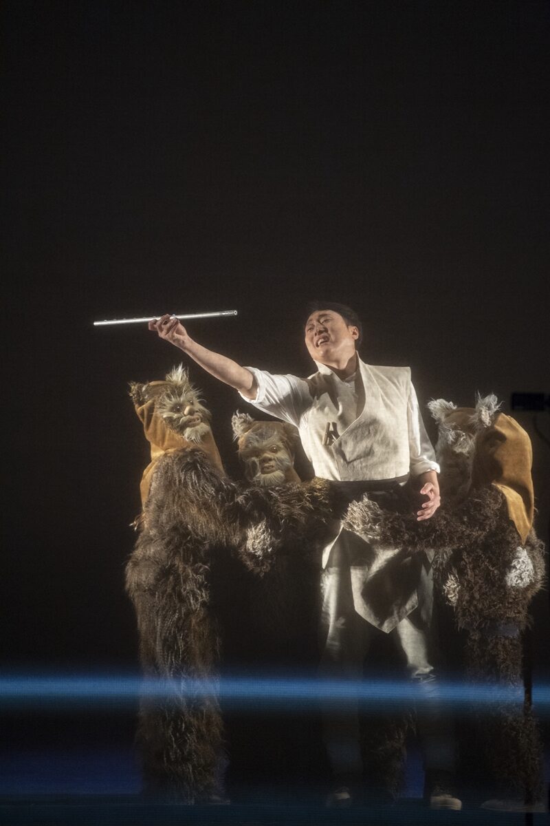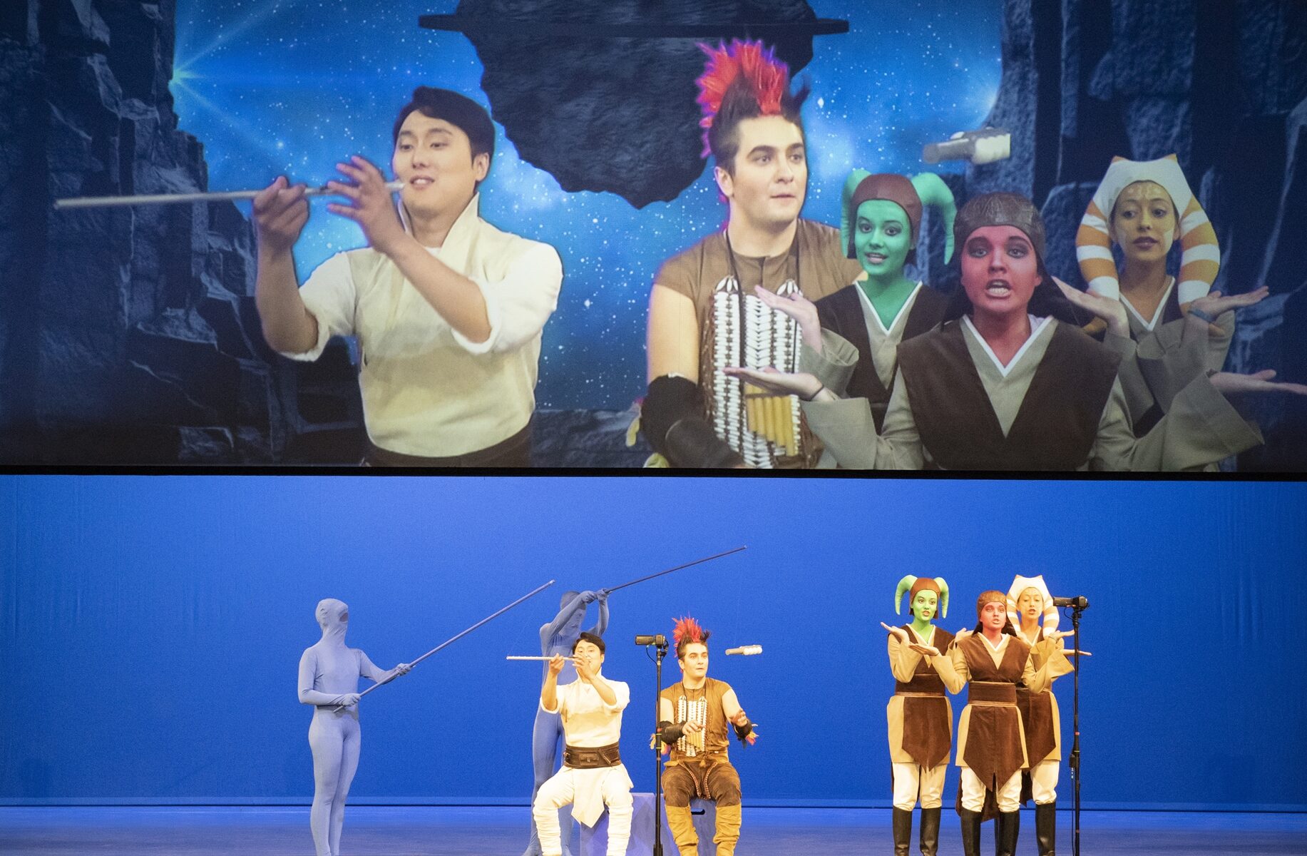 Das allgemein bestens aufgelegte Sängerensemble entzückte ebenfalls mit schönem Gespür für Mozarts Musik. Herausragend sang als Gast Sopran Sophia Theodorides eine mitreißende Königin der Nacht. Die Spitzentöne kamen klar, rein, mit durchsichtigem Glanz, und mit einer erfreulichen – indes hoch konzentrierten – Mühelosigkeit. Viel Freude bereiteten auch Sophie Witte als Pamina, – auch schauspielerisch herausragend – die drei Damen (Antonia Busse, Susanne Seefing, Bettina Schaeffer) und natürlich die entzückende Papagena Gabriela Kuhn. Ihr Papageno Rafael Bruck begeisterte gleichfalls stimmlich und mit – erfreulich nicht ordinärem – Spiel. Ob nun Woongyi Lees überaus kultivierter (ätherischer) Tamino, mit leichten Einschränkungen in der Aussprache, Matthias Wippichs warm-weicher Sarastro oder Gereon Grundmann als Sprecher (alias Spock aus Star Trek); die Sänger agierten einerseits ganz im Sinne van Rensburgs als Protagonisten seiner Space-Oper, doch zugleich als Treue „Diener“ mozartscher Musik. Ein Hingucker: Markus Heinrich als Monostatos in Darth-Maul-Kostüm. Und auch die drei Knaben (Marie Lina Hanke, Jana-Sophia Gebhardt und Luzia Ostermann) überzeugten sowohl sängerisch als auch schauspielerisch. Charmant rundeten Arthur Meunier sowie Nils Miegel als Priester das Ensemble ab.
