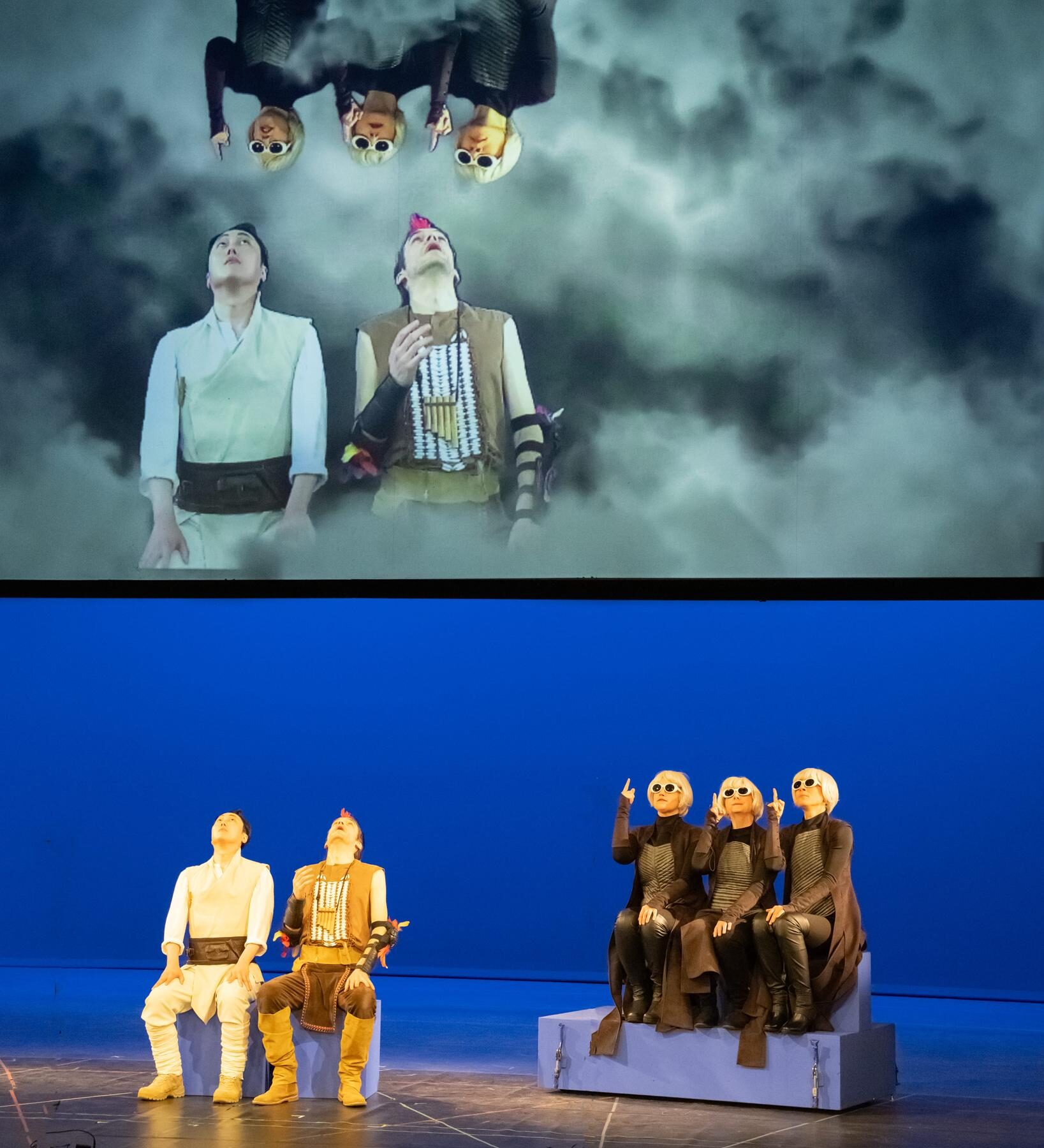 Sowohl die drei Damen, verkörpert von Antonia Busse, Susanne Seefing und Bettina Schaeffer als auch die drei Knaben von Marie Lina Hanke, Jana-Sophia Gebhardt und Luzia Ostermann bilden wunderbar wohlklingende Terzette, die das hohe Gesangsniveau der Produktion unterstreichen. Der Monostatos von Markus Heinrich bereichert vor allem durch eine intensive diabolische Personen- und Stimmführung. Gereon Grundmann als Sprecher, Gabriela Kuhn als Papagena, Arthur Meunier und Nils Miegel als Priester runden das Gesangsensemble stimmig ab. Brillant der starke Chor des Theaters, der sich statuarisch erhöht auf eine äußerst homogene vokale Ausgestaltung konzentrieren kann. Unter der musikalischen Leitung von Giovanni Conti blüht der äußerst differenzierte Klangkörper der Niederrheinischen Sinfoniker auf.