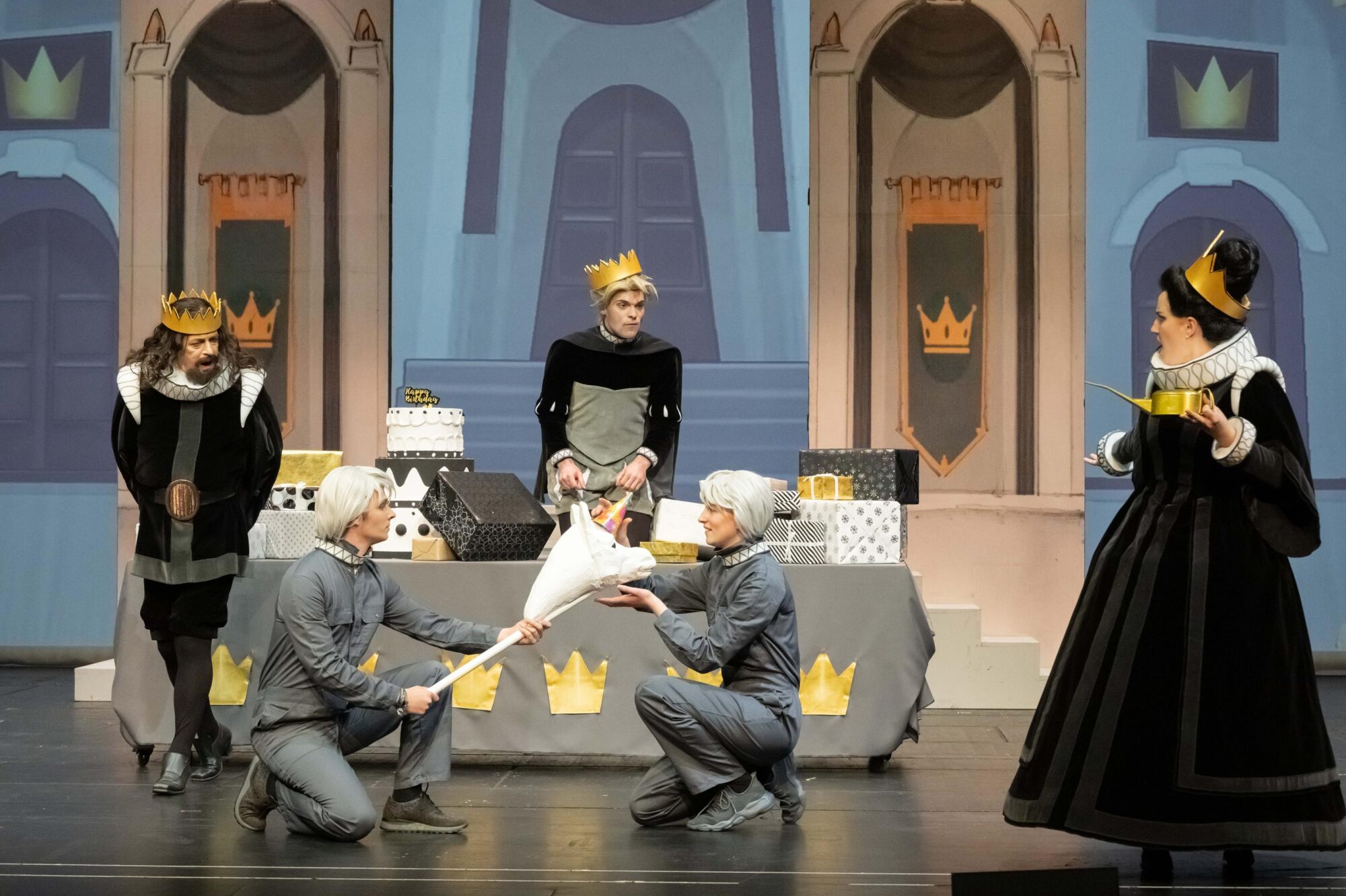 Zum Schluss geht sein ungewöhnlicher Geburtstagswunsch doch noch in Erfüllung. Der junge Prinz (gespielt von Henning Kallweit, gesungen von Ramon Mundin) erkennt: „Ihr alle zusammen seid mein Einhorn.”