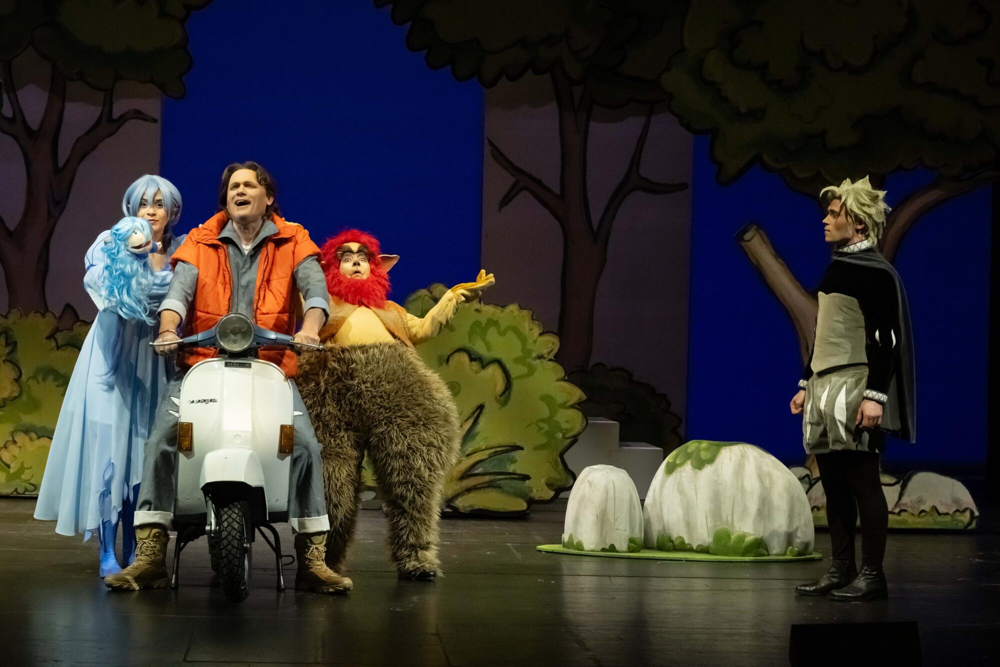 Unterwegs trifft er die fantasievollen Bewohner des Zauberwalds, der akut vom Abholzen bedroht ist, weil sich der gefürchtete Goldene Riese und seine Ehefrau, die Goldene Riesin, einen größeren und prächtigeren Palast wünschen. Der junge Prinz lernt die blauhaarige, eher schüchterne Halima (Jeanne Jansen) mit ihrer sprechenden Puppe, den kugelrunden Trollpatsch (Gabriela Kuhn) mit den roten Haaren und den verwegenen Knut (Tobias Wessler) auf seiner weißen Vespa mit 65 ES (Einhornstärken) kennen.