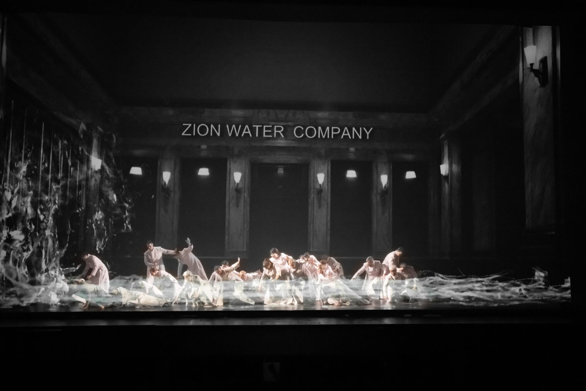Neben den beeindruckenden Videoprojektionen zeichnet sich van Rensburg auch für das Bühnenbild, die Kostüme und natürlich die gesamte Inszenierung verantwortlich. Er verlegt die Handlung hierbei in die fiktive Stadt Zion während der historischen „Dust Bowl“-Klimakatastrophe der 1930er Jahre in den amerikanischen Südstaaten. Innerhalb weniger Jahre verwandelte sich dort einst fruchtbares Ackerland in eine riesige „Staubschüssel“. In der szenischen Umsetzung des Oratoriums macht Elias nun die Zion Water Company für die schwere Dürre verantwortlich. Aufgrund ihrer schwierigen Situation sind viele Menschen bereit, sich – angespornt durch Elias‘ Aufrufe – auch mit Gewalt zu widersetzen. Generell ist die alttestamentliche Geschichte von Elias sehr gewaltverherrlichend, was Kobie van Rensburg in seiner Inszenierung geschickt aufgreift und dieser Thematik mit dem von Elias wiedererweckten Kind der Witwe eine Figur entgegensetzt, die die Erwachsenen fragt, warum es immer so viel Gewalt geben muss. Auch die in der Inszenierung aufgeworfene Frage nach objektiver oder subjektiv empfundener Wahrheit ist in Zeiten von Fake News aktueller denn je. Diese Thematik ist geschickt in die Videoprojektionen integriert, ohne von der eigentlichen Handlung abzulenken.