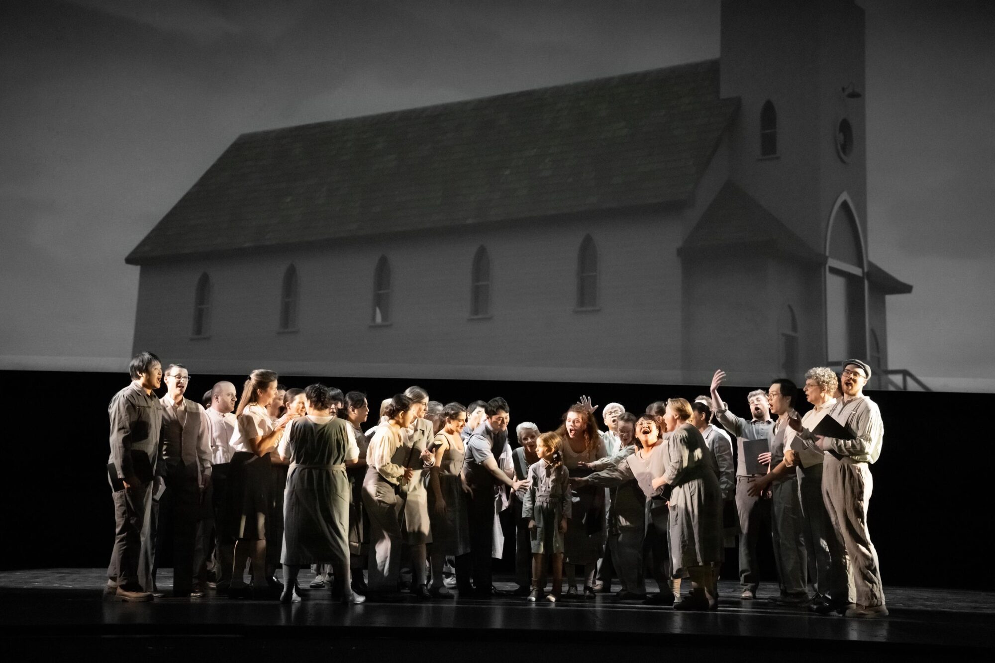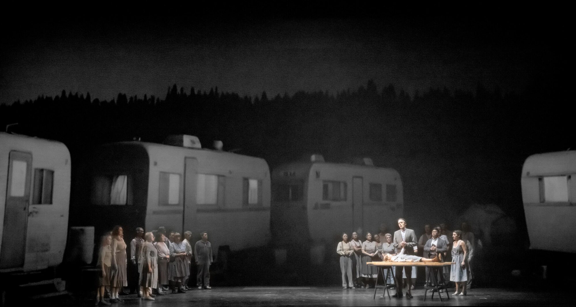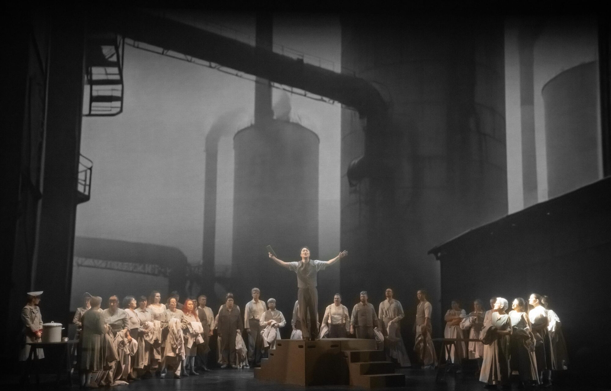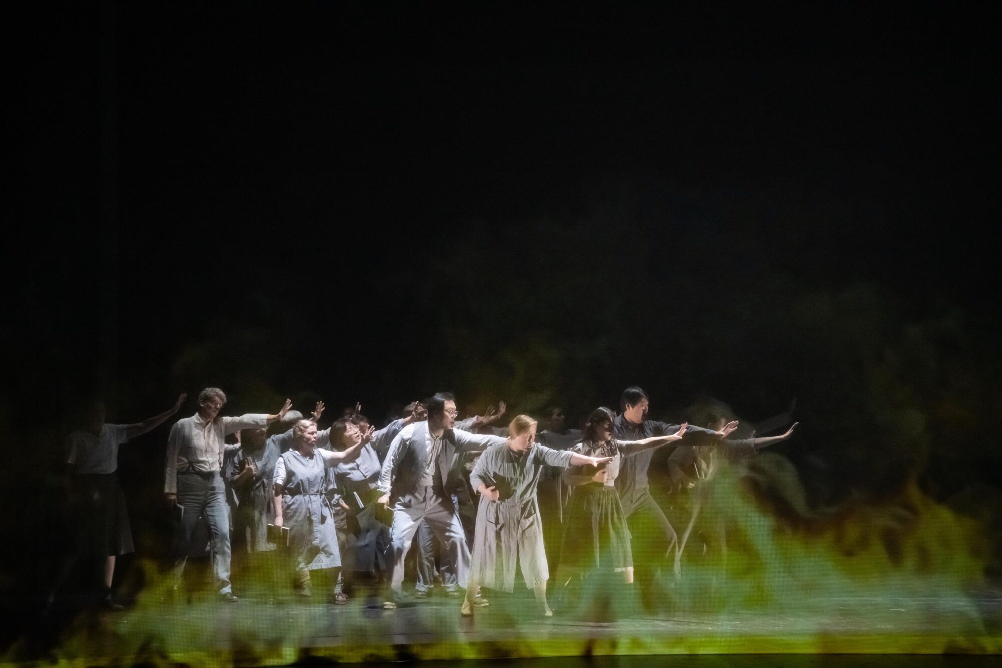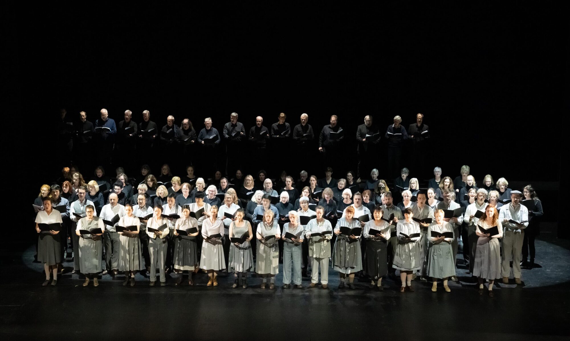 Es ist natürlich der Abend der Chöre. Insgesamt rund 140 Stimmen füllten den Theaterraum, jeder Ton ließ die Luft vibrieren. Chordirektor Michael Preiser hatte sie auf den Punkt vorbereitet: Opernchor und Extrachor des Theaters, der Niederrheinische Konzertchor und der Krefelder Crescendo Chor (Einstudierung: Heinz-Peter Kortmann) hatten eine Klangwucht, die verstärkt wurde, weil ein Teil im Theatersaal platziert war und aus dem Publikum heraus agierte. Für Zuschauende keine Chance, sich der Wirkung zu entziehen.