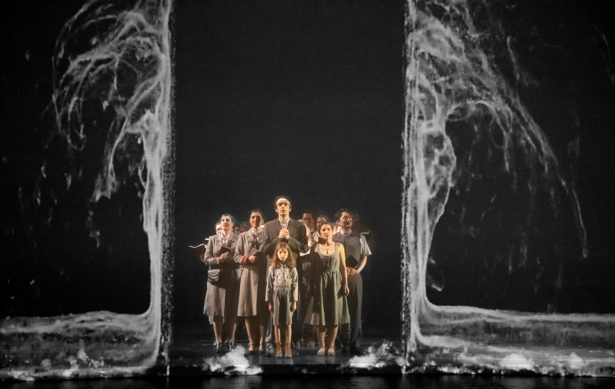 Es gibt kaum Requisiten, die Bühne wird mit schwarz-weißen Bildern belebt, die sie zu einer Art Fotoalbum aus alter Zeit machen. Da lässt man sich von surrealen Szenen mitreißen, wenn in einem Krankenzimmer das Mobiliar im Raum schwebt oder Elias, der eigentlich in der Todeszelle sitzt, plötzlich unter einem Baum schläft und von Engeln umschwebt wird – und das Trio Nele van Deyk, Pia Melenk und Margriet Schlössels traumschön a cappella singen „Hebe deine Augen auf“. Es gibt bedrückende Bilder der Dürre, die Gewinnsüchtler der Zion Water Company verursacht haben: Die Klimakatastrophe ist menschengemacht. Es sind gewaltige Farbbilder von Wassermassen und glühenden Feuern – und dazu die Musik.