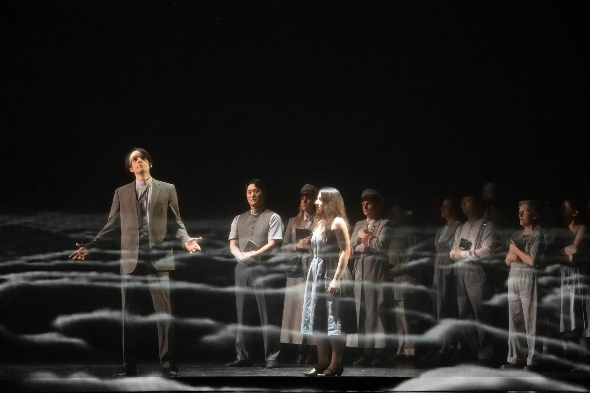 Regisseur Kobie van Rensburg und seinem Team ist tatsächlich eine in mehrfacher Weise wirkungsmächtige Adaption – genauer genommen Neudeutung – des die grausame und zugleich schrecklich frömmelnde Geschichte des alttestamentarischen Propheten schildernden Oratoriums gelungen. Auf der Musik Mendelssohns entfaltet sich eine in großen Teilen cineastisch wirkende Ästhetik, die dem „Elias“, der sonst mehr in anderen Kontexten erlebt werden kann, eine gänzlich neue Färbung – wobei gerade das dominierend Monochrome so faszinierend ist – verleiht. Auf einer dunklen Bühne agieren in nahezu ganz grauen Kostümen die Rollen, vor ihnen – bisweilen auch hinter ihnen – Projektionsfläche. Eine Gaze, auf die van Rensburg verschiedene Szenerien, Filme oder auch Effekte projizieren kann, die sich mit dem Geschehen auf der Bühne sehr gut mischen. So sieht die Produktion mal ein wenig wie ein Fritz-Lang Film oder ein Film noir aus. In wenigen Schlüsselszenen erlaubt man Farbe; Feuer, Blut. Das alles mit handwerklich sehr überzeugend durch van Rensburg digital generierte Grafik.
