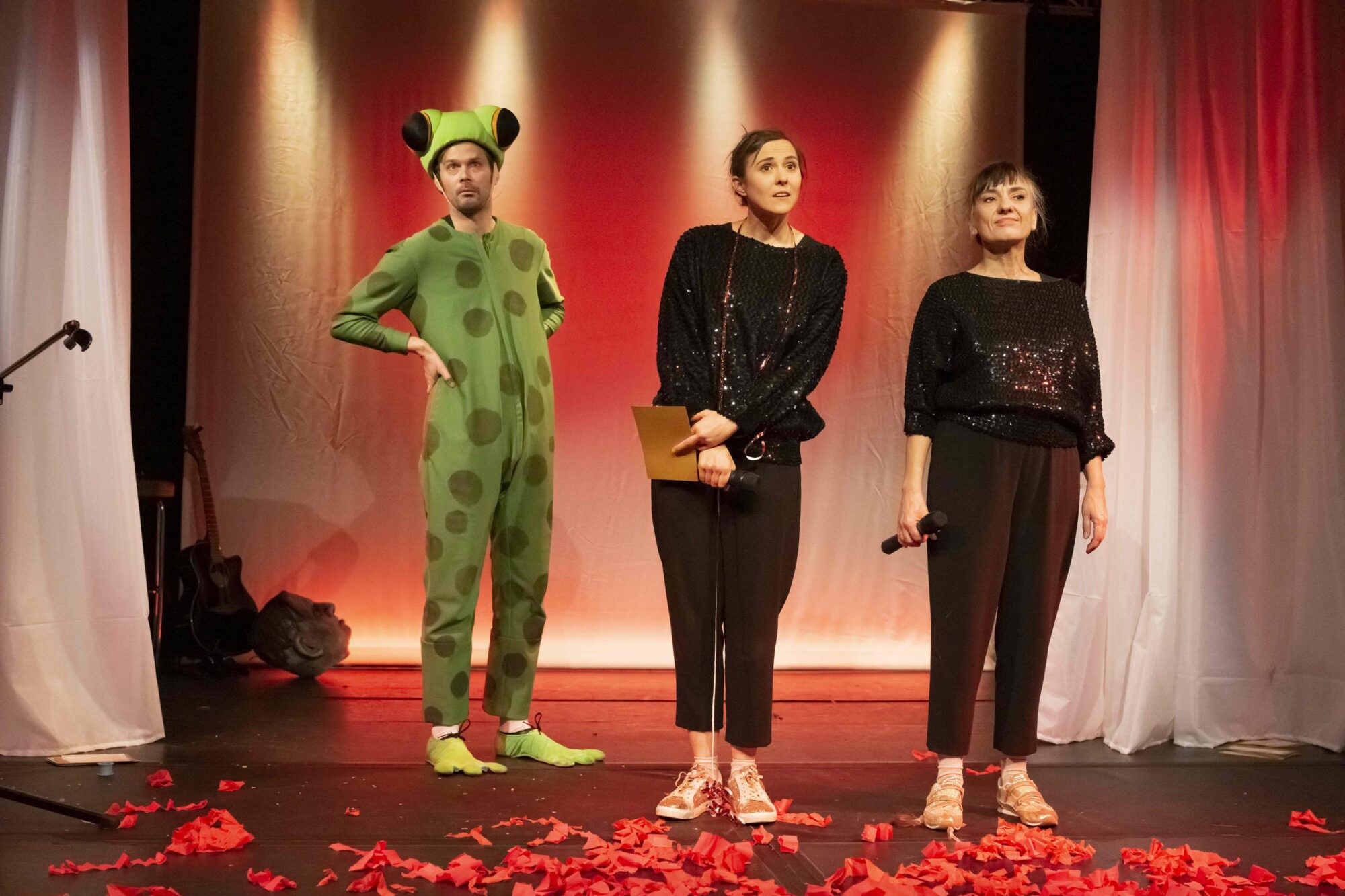 „Frauengold“, ein wirklich grandioser, witziger, durchaus auch zum Nachdenken und Innehalten anregender Abend mit „Musik, Quiz und Protest“ von und mit Esther Keil, Carolin Schupa, Cornelius Gebert (alle drei auf der Bühne) und Anne Spaeter (Inszenierung), dürfte es eigentlich nicht geben. Weil: In einer Welt mit Gleichberechtigung und -stellung aller Menschen vollkommen unabhängig von ihrem Geschlecht, in einer Welt ohne Sexismus und Co. bräuchte es keine satirische Revue, um auf Missstände aufmerksam zu machen. Aber: Es gibt sie immer noch, die Ungerechtigkeiten, die Gewalt in der Ehe, Benachteiligung im Beruf, Belästigung. Und es gibt noch die Tabus um Themen wie Aufklärung über die weibliche Sexualität, den weiblichen Körper, den Zyklus. […] Umso mehr braucht es solche Programme, wie es die Schauspielsparte des Theaters Krefeld und Mönchengladbach am Krefelder Haus realisiert hat, um in einem künstlerischen Kontext Augen für diese Themen zu öffnen. Dass es diesen starken feministischen Abend gibt, der – zwar auf leichtfüßige, musikalisch spritzige, manchmal auch etwas peinliche, aber richtig kraftvolle Weise – auf Missstände aufmerksam macht und als Gegenpol zum Mansplaining „Womensplaining“ praktiziert, ist gut. […] Das Publikum bei der Uraufführung im Glasfoyer an Cafétischen lose sitzend (es gab sogar einen eigens für den Abend kreierten „Frauengold-Cocktail“) erlebte ein Wechselbad der Gefühle. […] Mit grandioser Haltung und einer geerdeten Natürlichkeit entsteht ein […] verrücktes Potpourri, bei dem selbst „Gott“ und am Ende das „Publikum“ sein Fett wegbekommen.