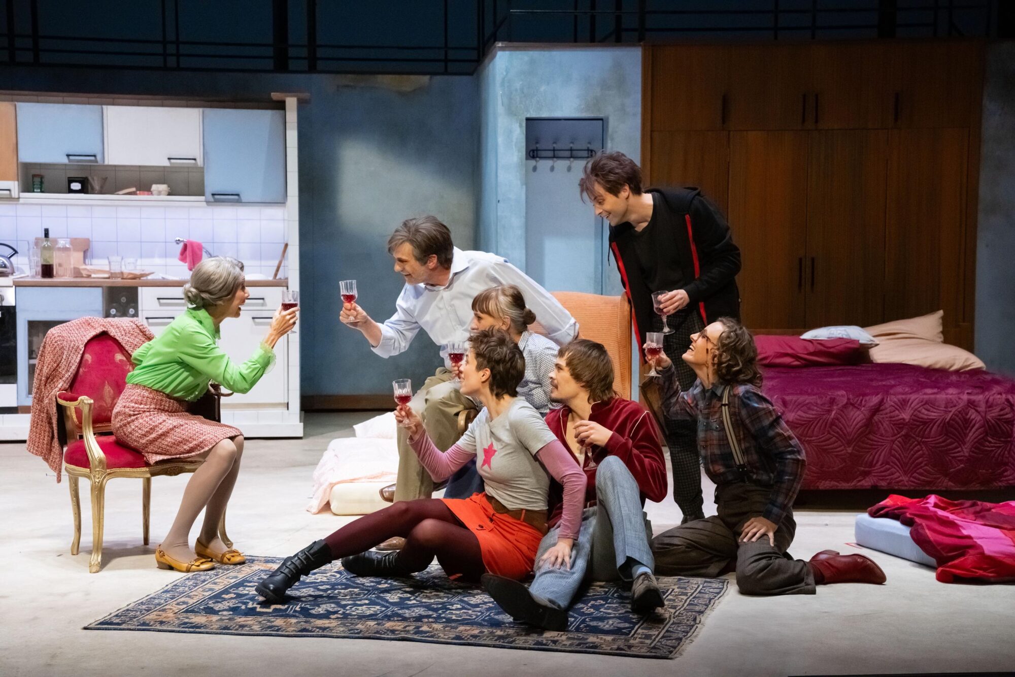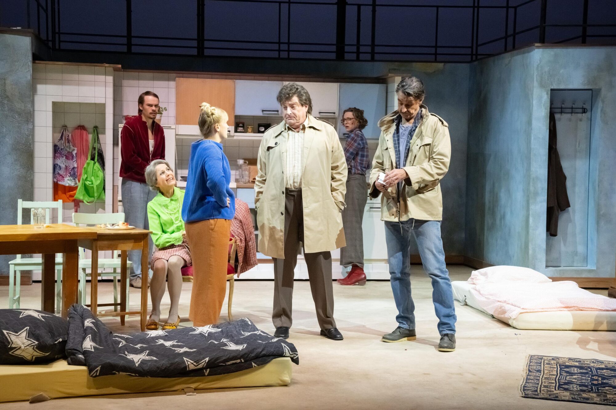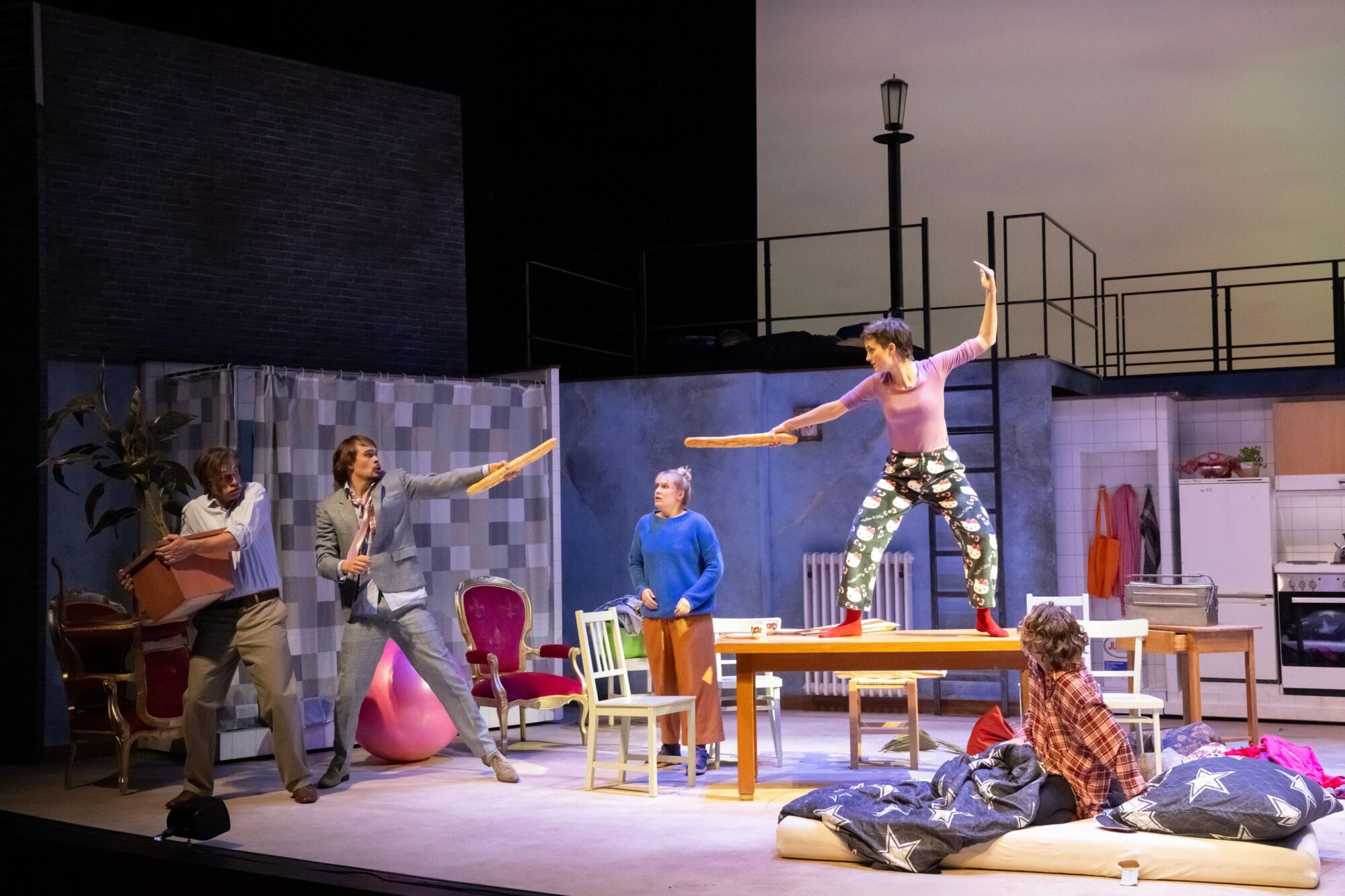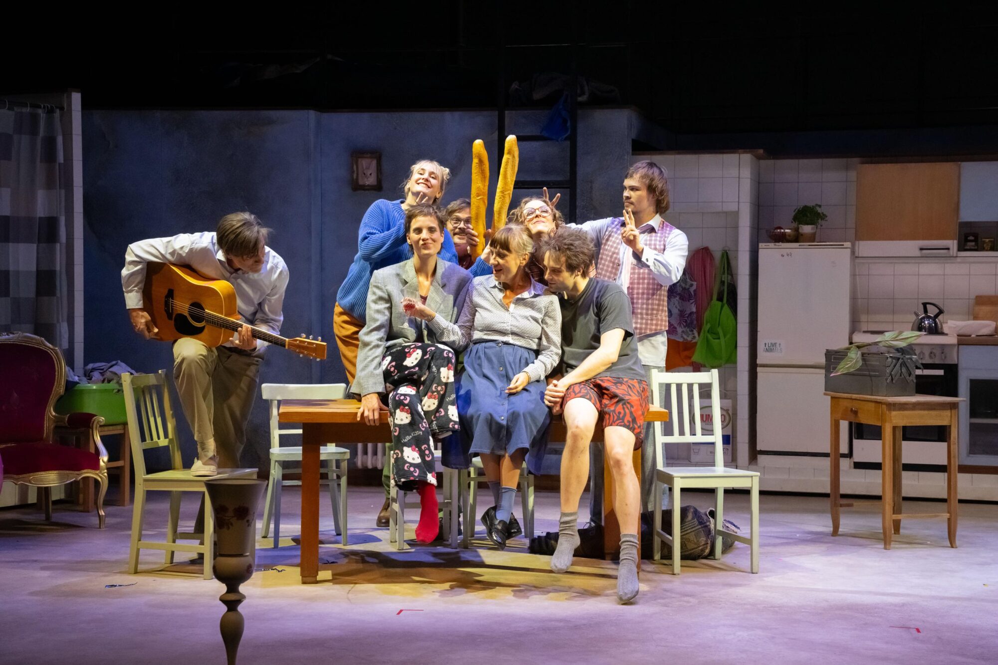 “Es ist eine Realität, in der alle versuchen, zurechtzukommen. Die großartige Mutter dieser Familie hält alles zusammen, am liebsten mit Essen und auch mal einem Getränk. Alle, das sind zunächst Mama und Papa. Vornamen gibt’s nicht – hier sind die klassischen Rollen als Ernährer und versorgende Mutter geschrieben. […] Und überhaupt ist viel Schwung in dieser Geschichte: Die anderen Kinder der Familie Hase tauchen eines nach dem anderen auf und nisten sich wieder im trauten Heim ein. Da ist Jeannot (Nicolas Schwarzbürger), verwickelt in dubiose Geschäfte, auf der Flucht vor der Ordnungsmacht. Wenn’s wieder mal klingelt, versteckt er sich in der Badewanne und bekommt eine Ladung Wäsche über den Körper. Da ist Marie (Julia Staufer) mit ihren Koffern: „Ich lass mich scheiden“, und da ist Lucie (Marie Eick-Kerssenbrock), die vom Altar weggelaufen ist. […] Anne Spaeter regiert dieses vielköpfige Ensemble mit Witz und Tempo und lässt auch Raum für tragische Anteile. Kostüme und das detailreiche Bühnenbild aus der Hand von Sibylle Meyer sind ein gelungener Spiegel der einfachen, aber sehr herzlichen Verhältnisse bei den Hases. Die Komödie mit Tiefgang beschert den Zuschauern einen amüsanten Abend, bei dem man über so einiges nachdenken kann und vor allem herrlich lachen.”