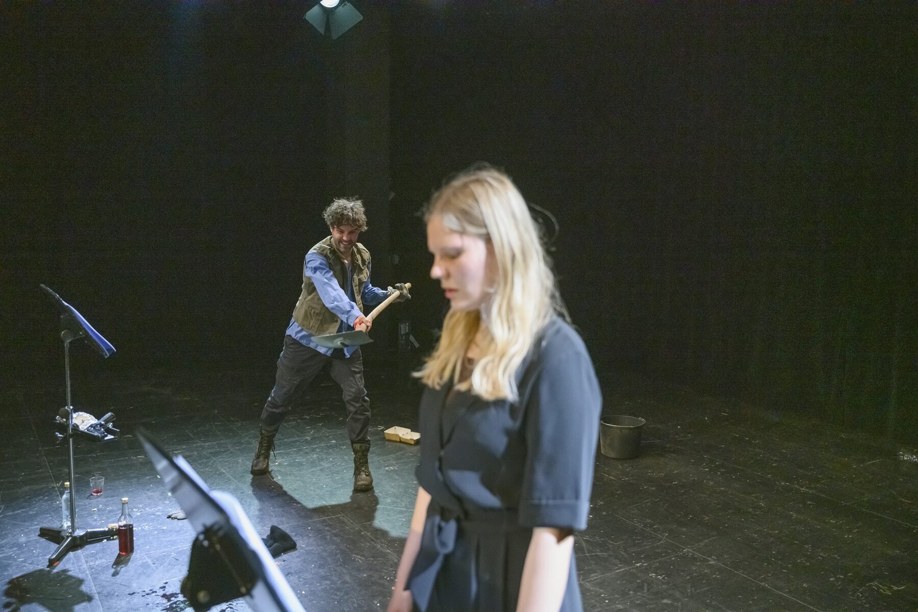 Das fehlende Bühnenbild formt sich dank des markanten Vortrags von Bruno Winzen als Erzähler in den Köpfen der Anwesenden sogleich zu einer weitläufigen Landschaft mit kleinen Erhebungen – jede einzelne entstanden durch die Bestattung eines Menschen bei lebendigem Leibe. […] Inder folgenden knappen Stunde wird das Publikum Zeuge, wie die beiden Figuren, die junge Frau und der etwa gleichaltrige Soldat, einander umkreisen. Wie sie streitend, schreiend, gemeinsam Angst erlebend aber bisweilen auch flirtend und lachend die ganze Absurdität der Situation enthüllen, in die das Schicksal sie auf dem Grabfeld zusammengeführt hat. Dem Unausweichlichen werden sie nicht entrinnen können. […] Das Quäntchen Humor, das in einigen Szenen kurz aufblitzt, es tut dem Stück gut. Neben der kurzen Erholungspause, die ein befreiendes Lachen bietet, wirkt die absurde Brutalität des Begrabens bei lebendigem Leibe dadurch noch schockierender und endgültig so unerträglich, wie sie eben ist. Einen Höhepunkt des Absurden erreicht das Stück in jener Szene, in der die großartige Katarina Kurschat die Auslöschung ihrer gesamten Familie im nonchalanten Plauderton eines Handy-Smalltalks referiert.