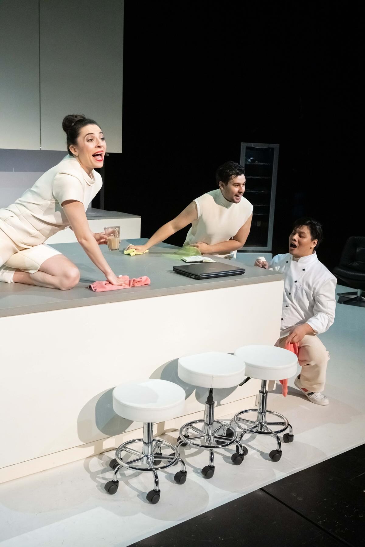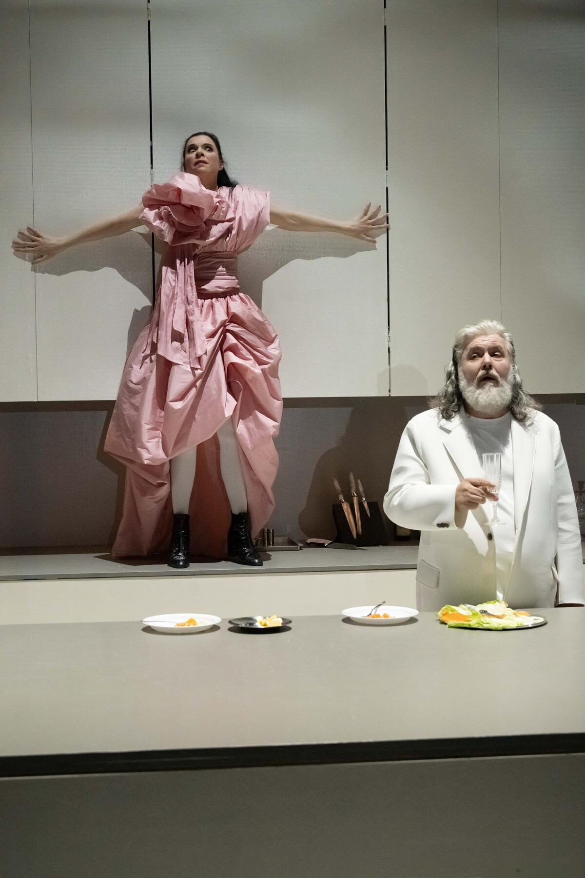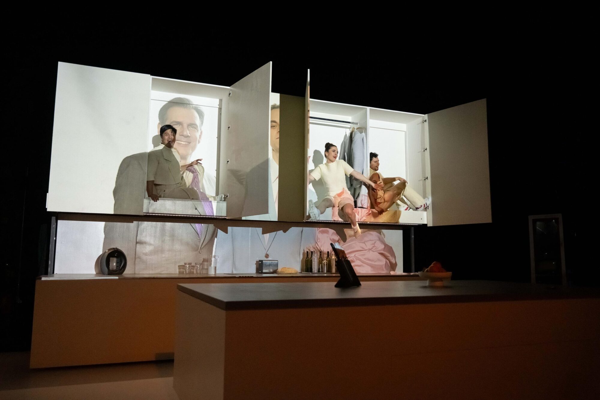 Regisseurin Petra Luisa Meyer hat als Kulisse eine Küche aufbauen lassen. Die Schranktüren lassen sich öffnen und verbergen Geheimnisse. Die Mitte bildet eine moderne Kochinsel.
