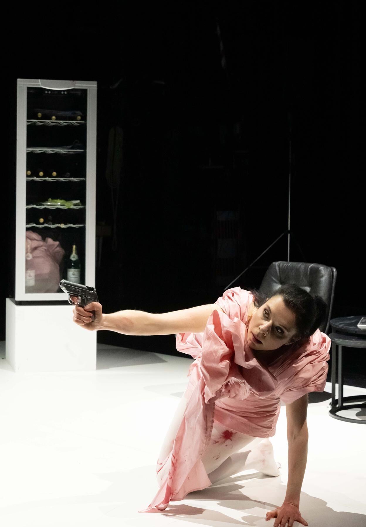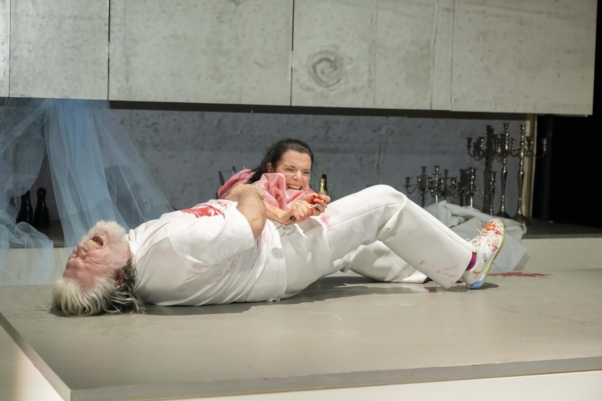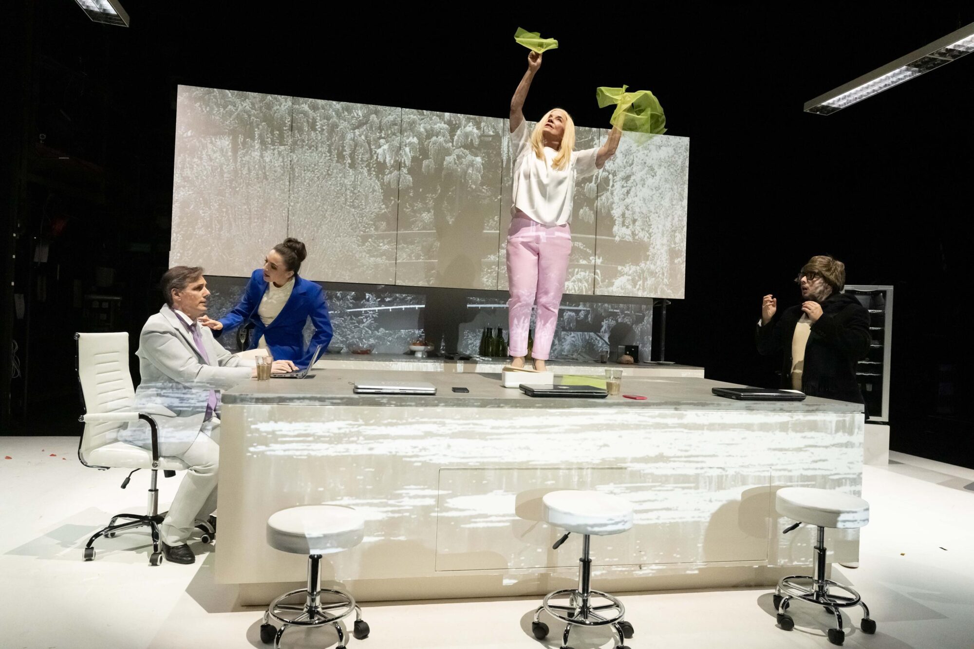 Regisseurin Petra Luisa Meyer hat als Kulisse eine Küche aufbauen lassen. Die Schranktüren lassen sich öffnen und verbergen Geheimnisse. Die Mitte bildet eine moderne Kochinsel.