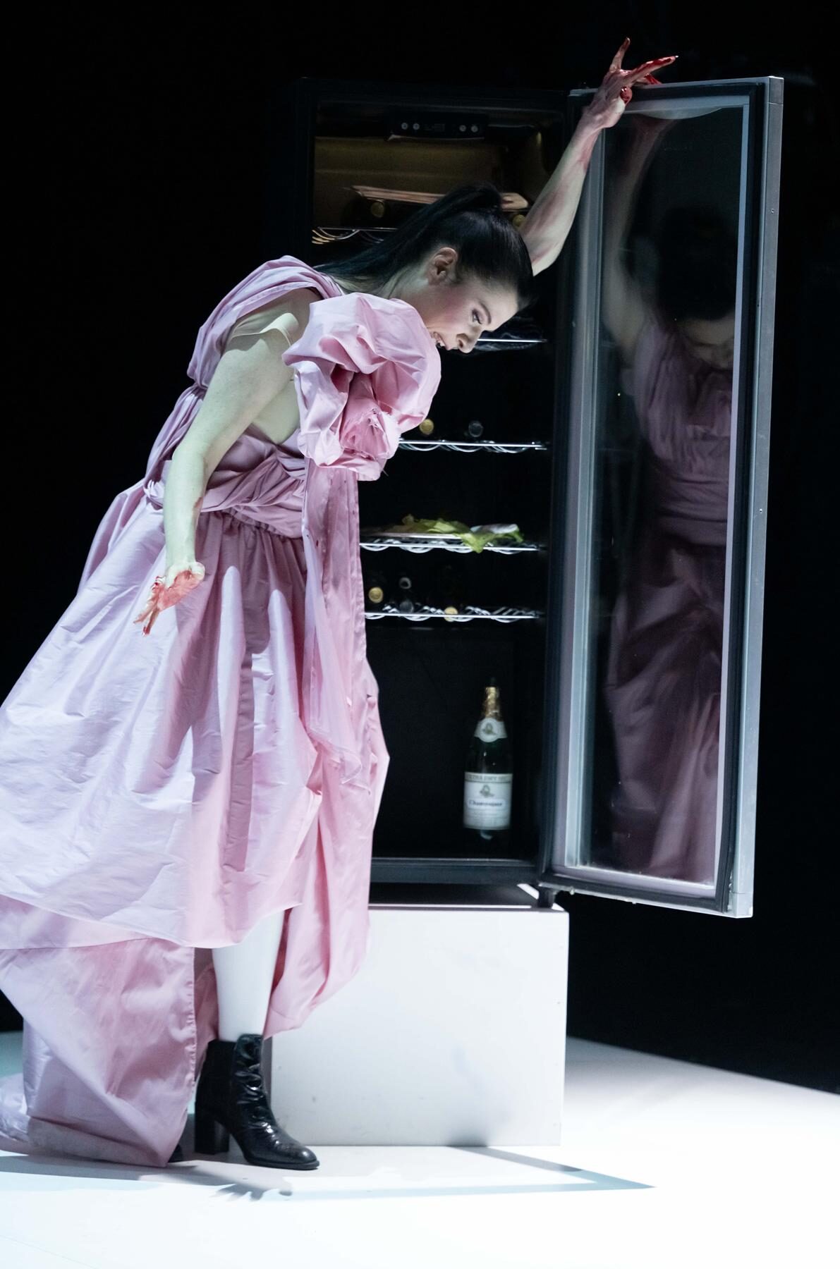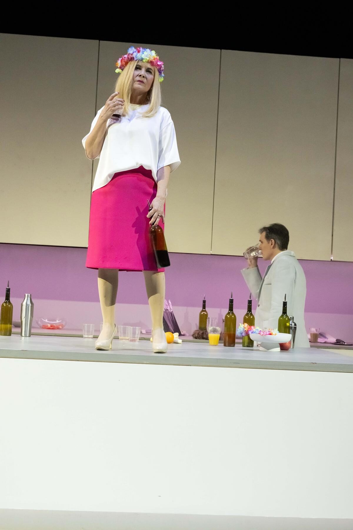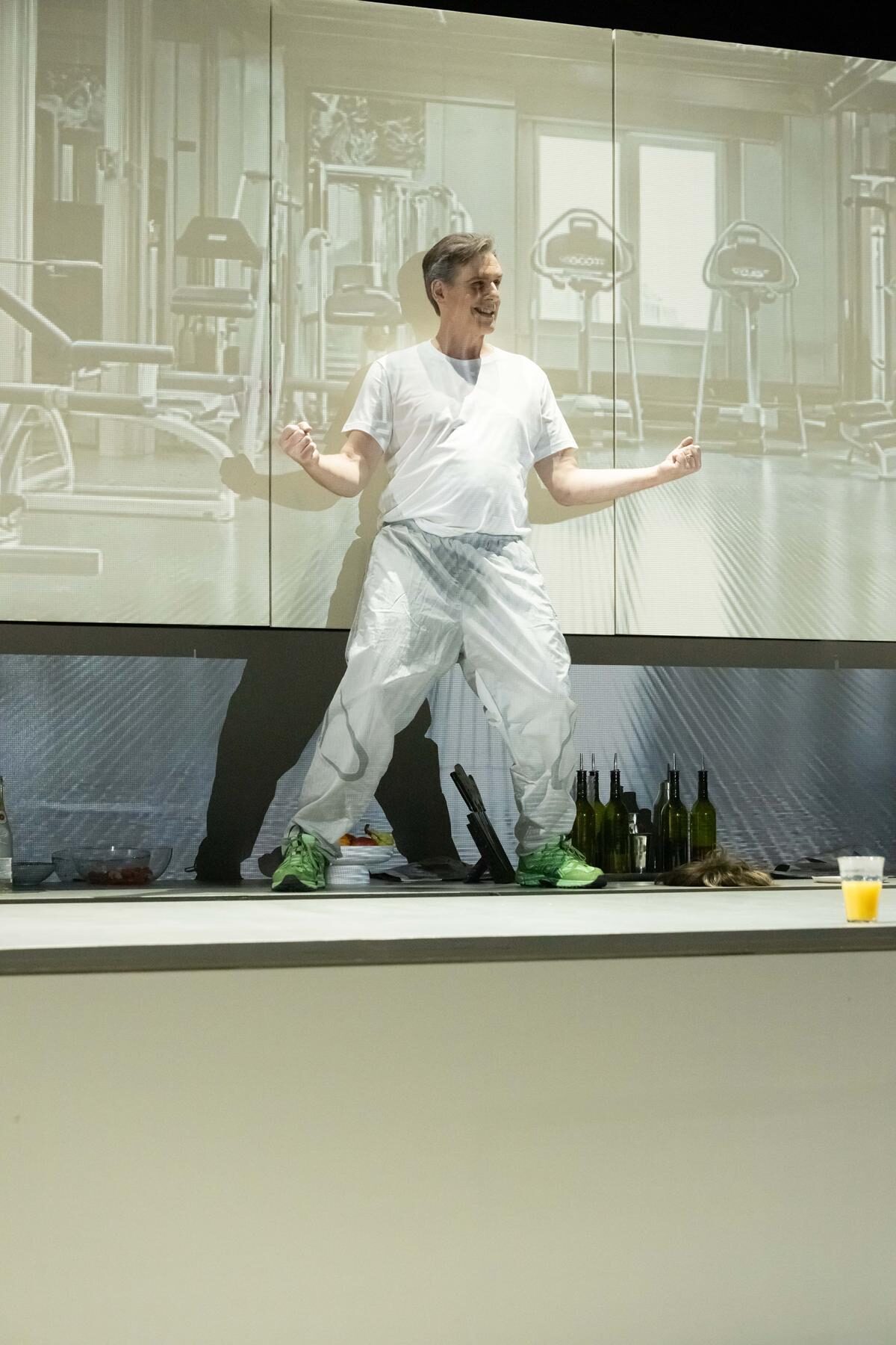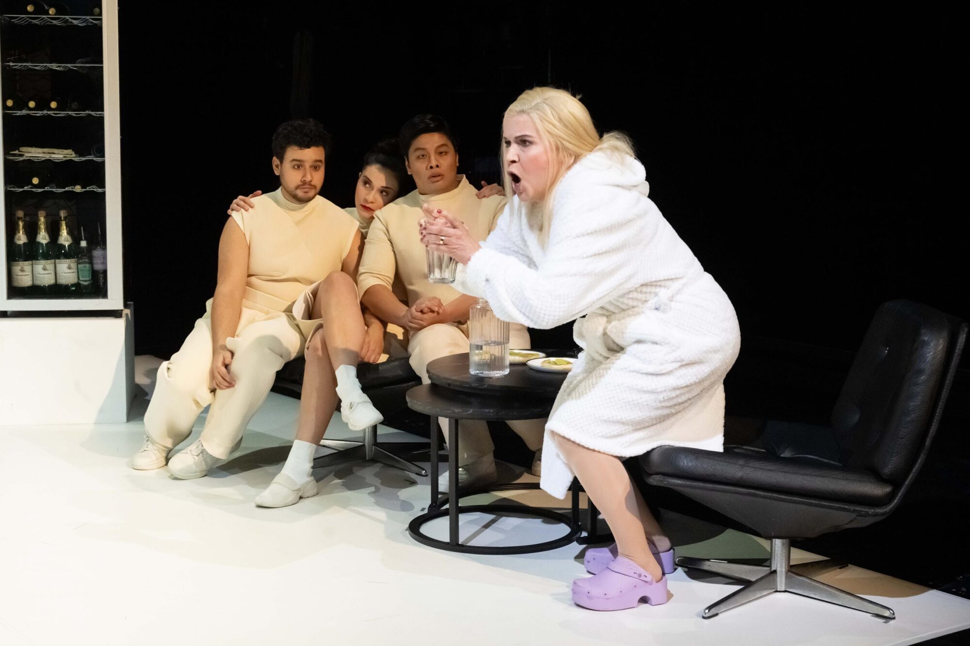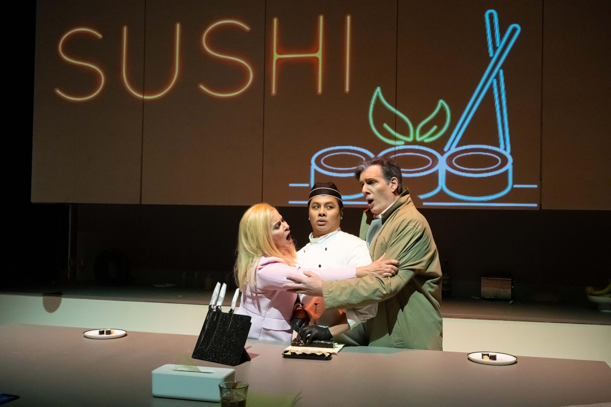 Sowohl für die stimmlichen und musikalischen wie auch die schauspielerischen Leistungen. In der Reihe „On stage“ sind nicht nur die Sänger auf der Bühne, sondern auch die Musiker und das gesamte Publikum. So fädelten sich die Zuschauer durch schmale Türen auf die Bühne und nahmen Plätze auf gestaffelten Stuhlreihen ein. Die Sicht war überall gut. Links vom Publikum waren die Musiker platziert, dahinter lag der Zuschauerraum, im Dunklen. Vor dem Publikum steht das Bühnenbild: eine Küche mit sehr hohen Oberschränken, einer Arbeitsplatte mit bunten Alkoholika und einem großen Küchenblock.