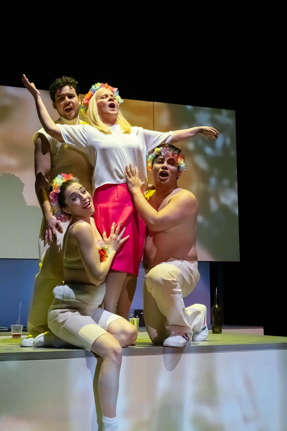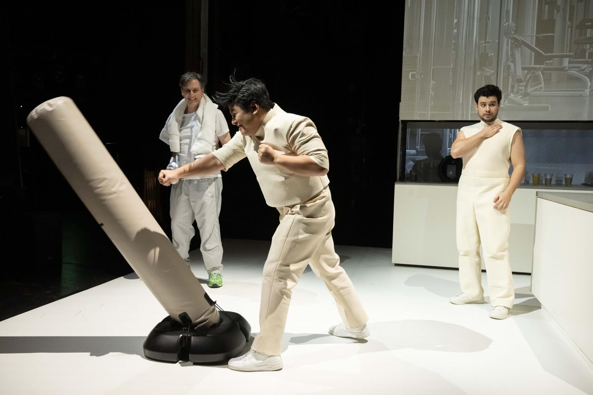 Wie in einer altgriechischen Tragödie begleitet ein kommentierender Chor (Bettina Schaeffer, Ramon Mundin, Jeconiah Retulla) die Protagonisten. Vielfach täuscht er in munteren Klängen auch die verlogene Utopie einer heilen Welt vor. Der Kontrast lässt die seelischen Konflikte umso deutlicher hervortreten. Das ist schlüssig inszeniert.